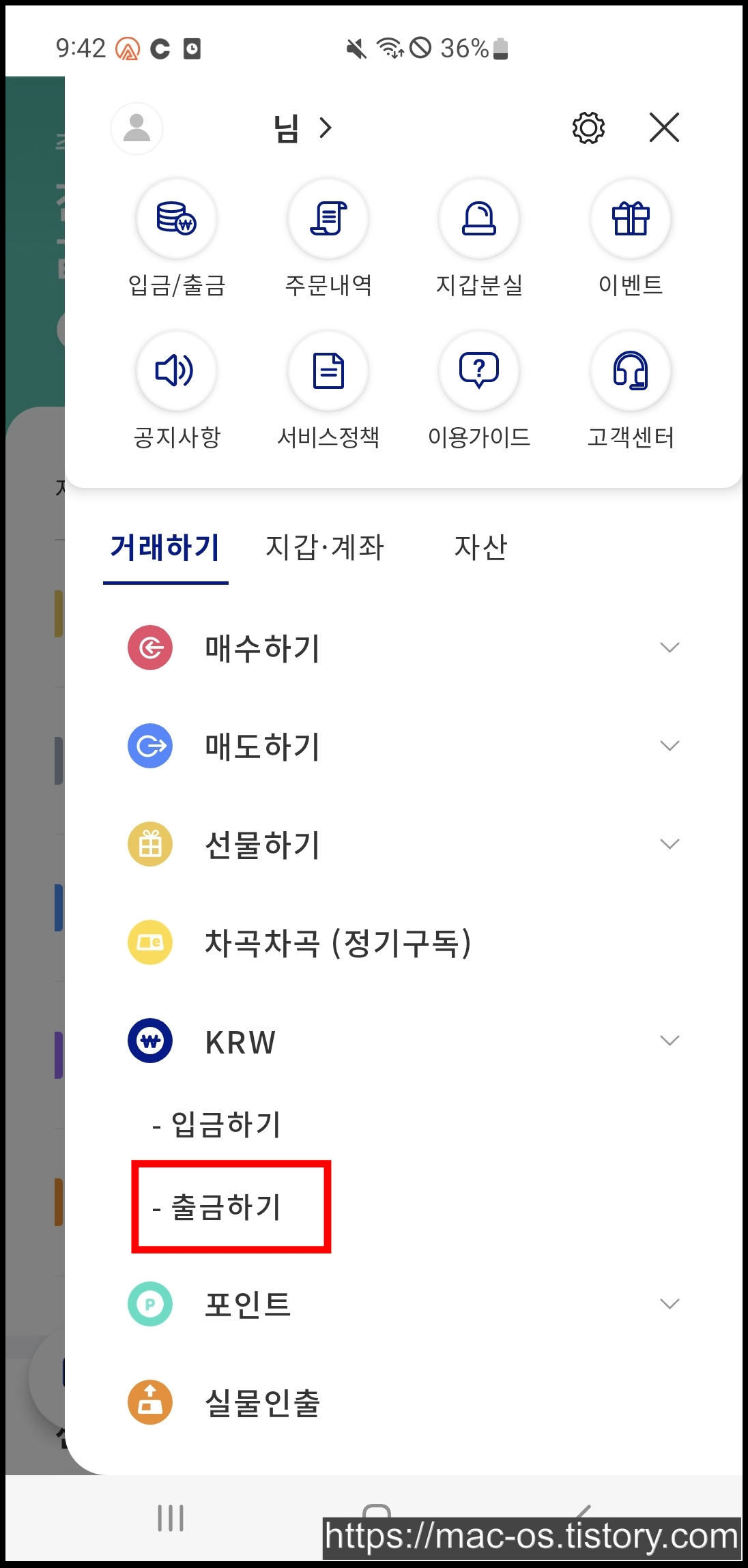 보유중인 자산을 매도한 다음 메뉴의 [출금하기]로 이동해 자신의 계좌로 출금할 수 있기 때문이다.
