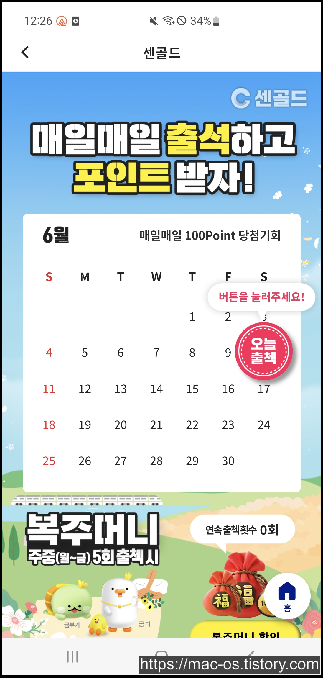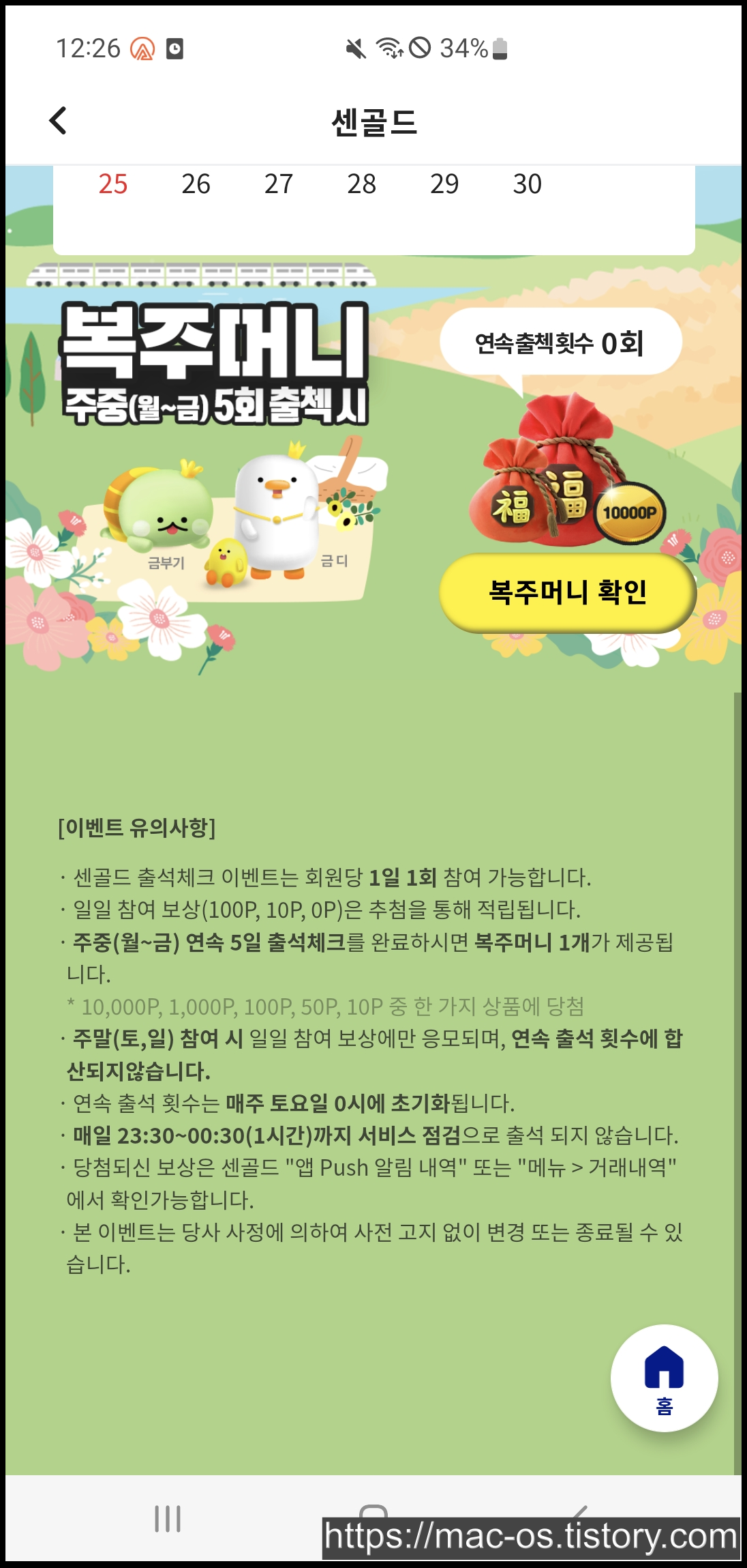 센골드에서 진행하고 있는 출석체크 이벤트다. 매일 출석체크하면 일일 참여보상(100P, 10P, 0P)을 추첨을 통해 받을 수 있다.