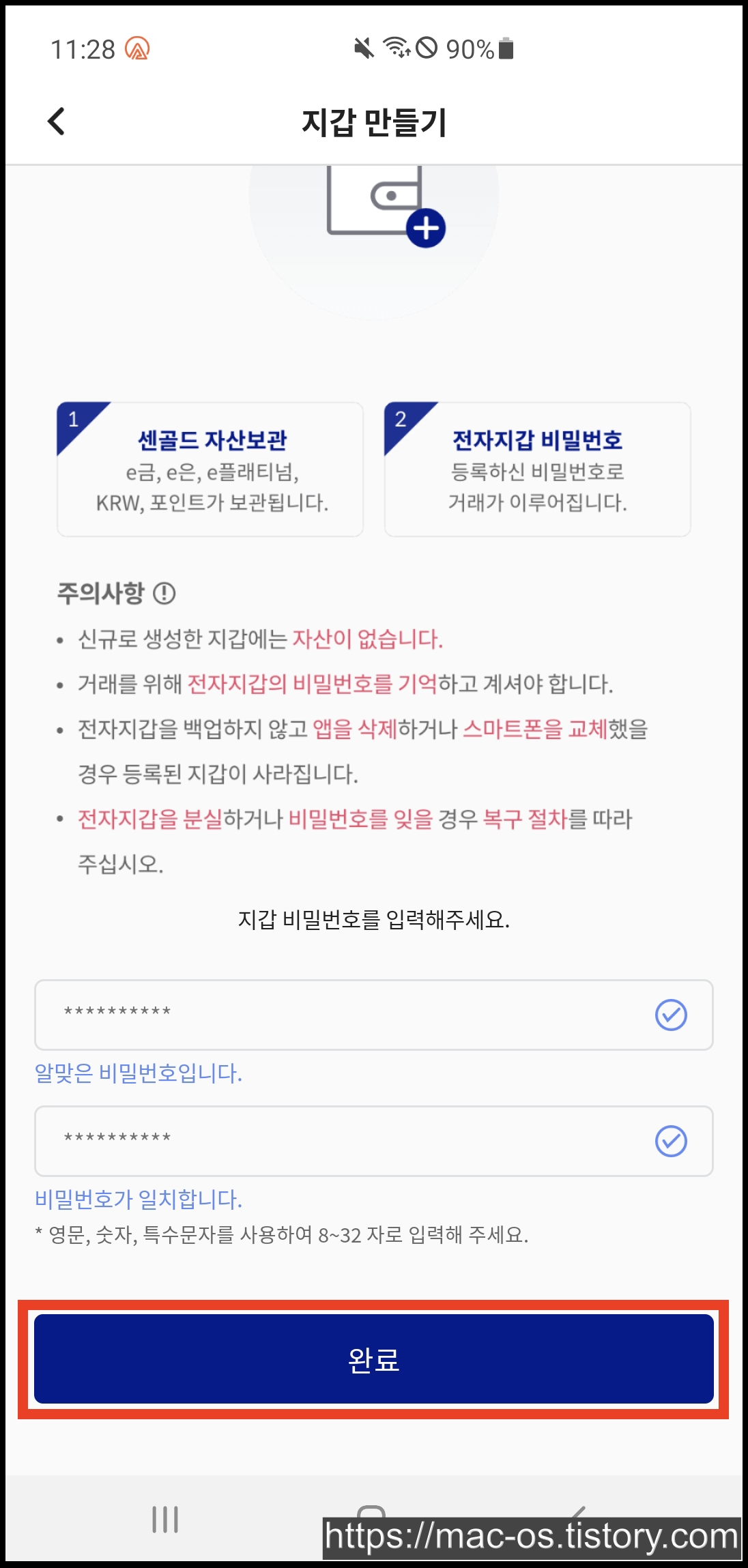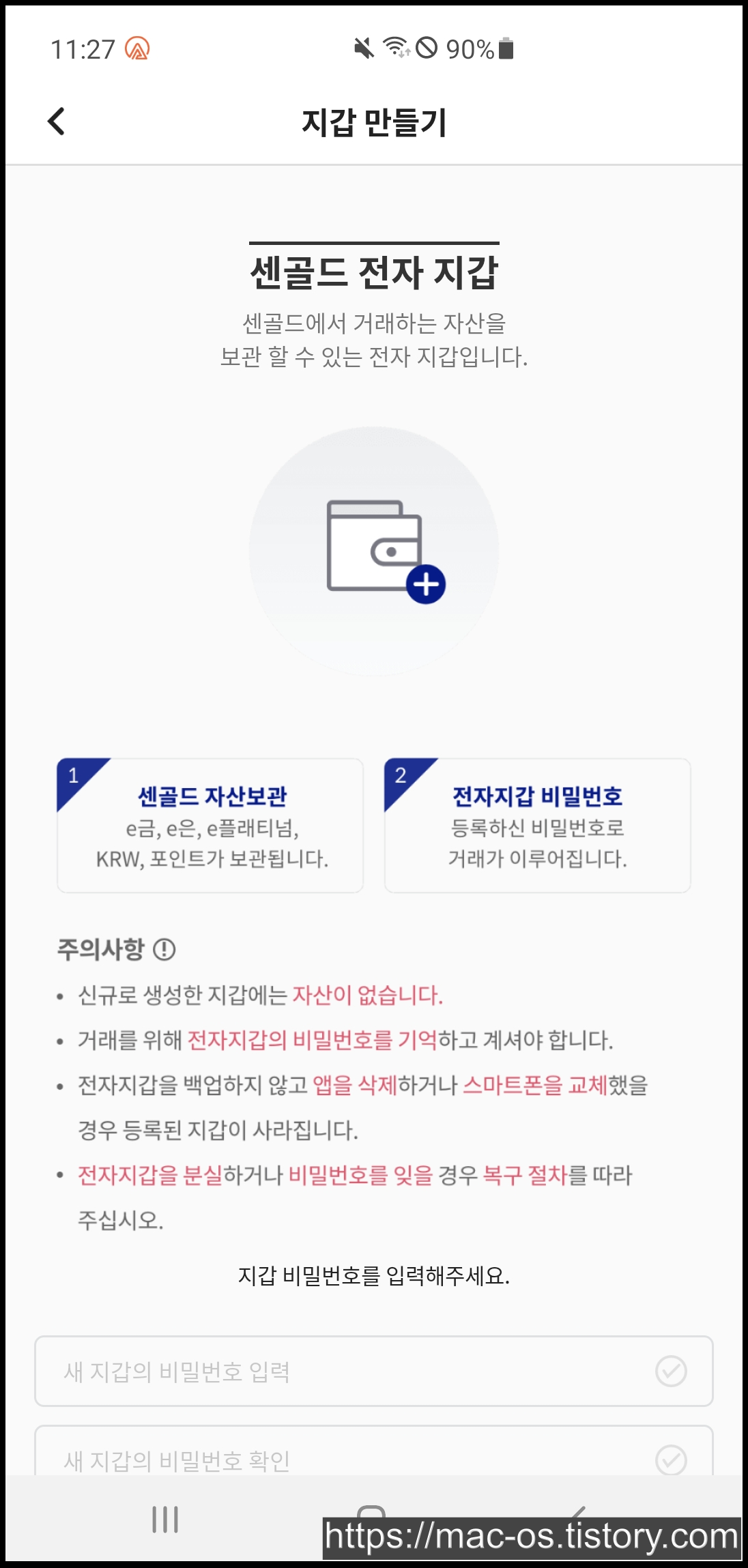 [다음]을 누르면 센골드에서 거래하는 자산을 보관할 수 있는 전자 지갑을 만들라는 창이 뜬다.