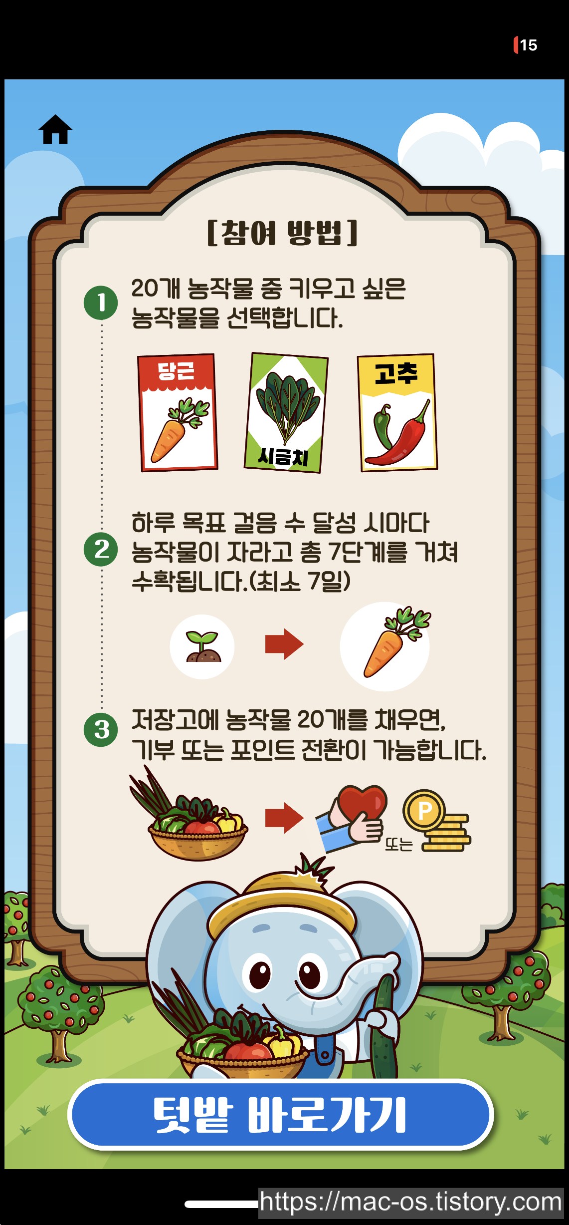 2번째인 랜선텃밭 가꾸기다. 20개 농작물 중에서 키우고 싶은 농작물을 선택하고, 하루 목표 걸음 수를 달성할 때마다 농작물이 자라고 총 7단계를 거치면서 수확된다. 저장고에 농작물 20개를 채우면 기부 또는 포인트 전환이 가능하다.