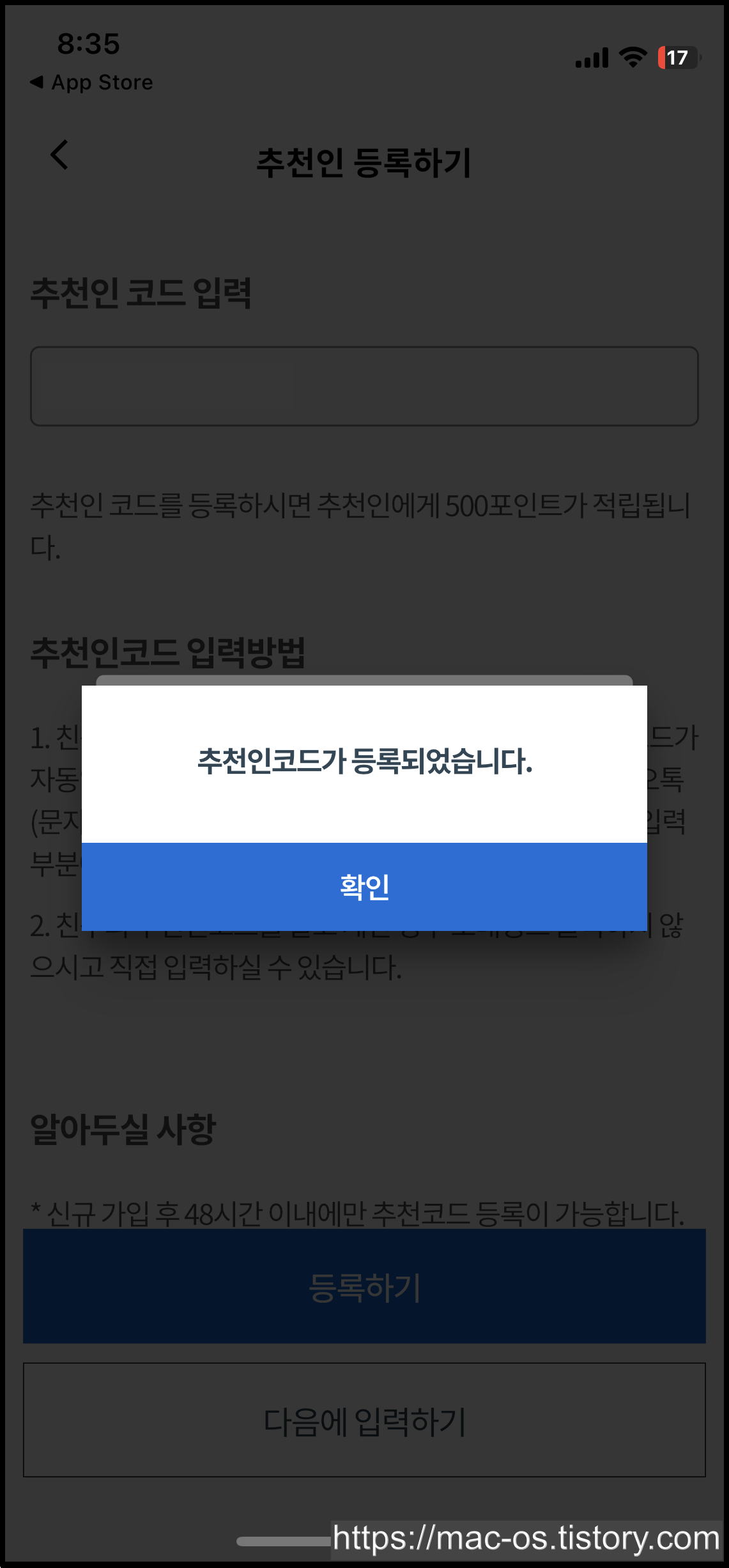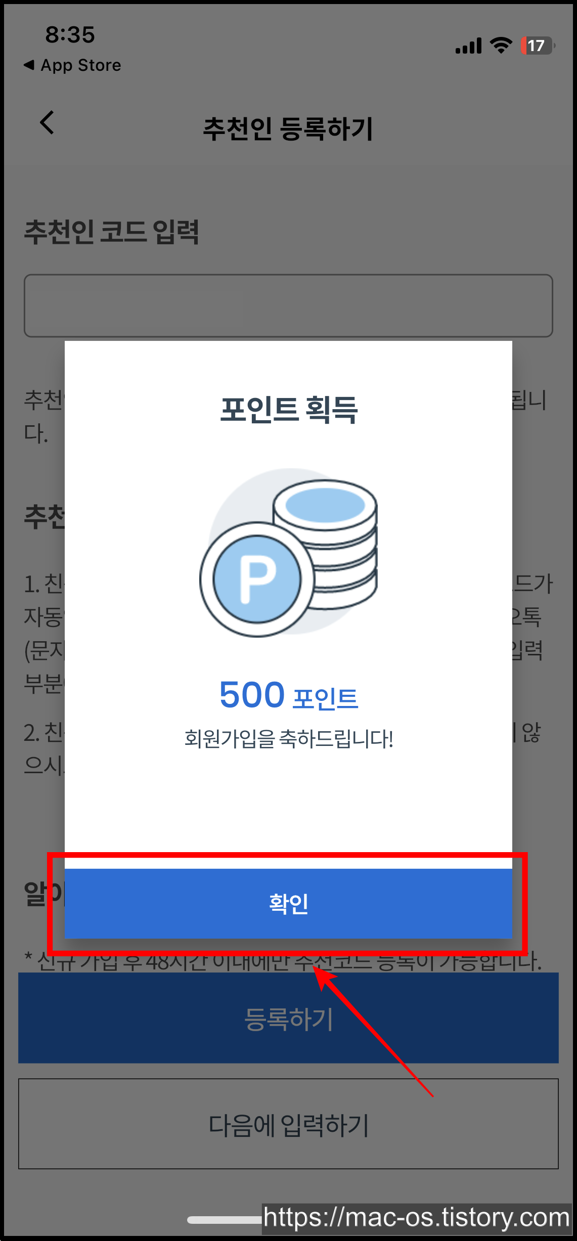 앱 접근권한을 허용하면 500포인트가 지급되는데, [확인]을 누르면 추천인 등록하기 창이 뜬다.