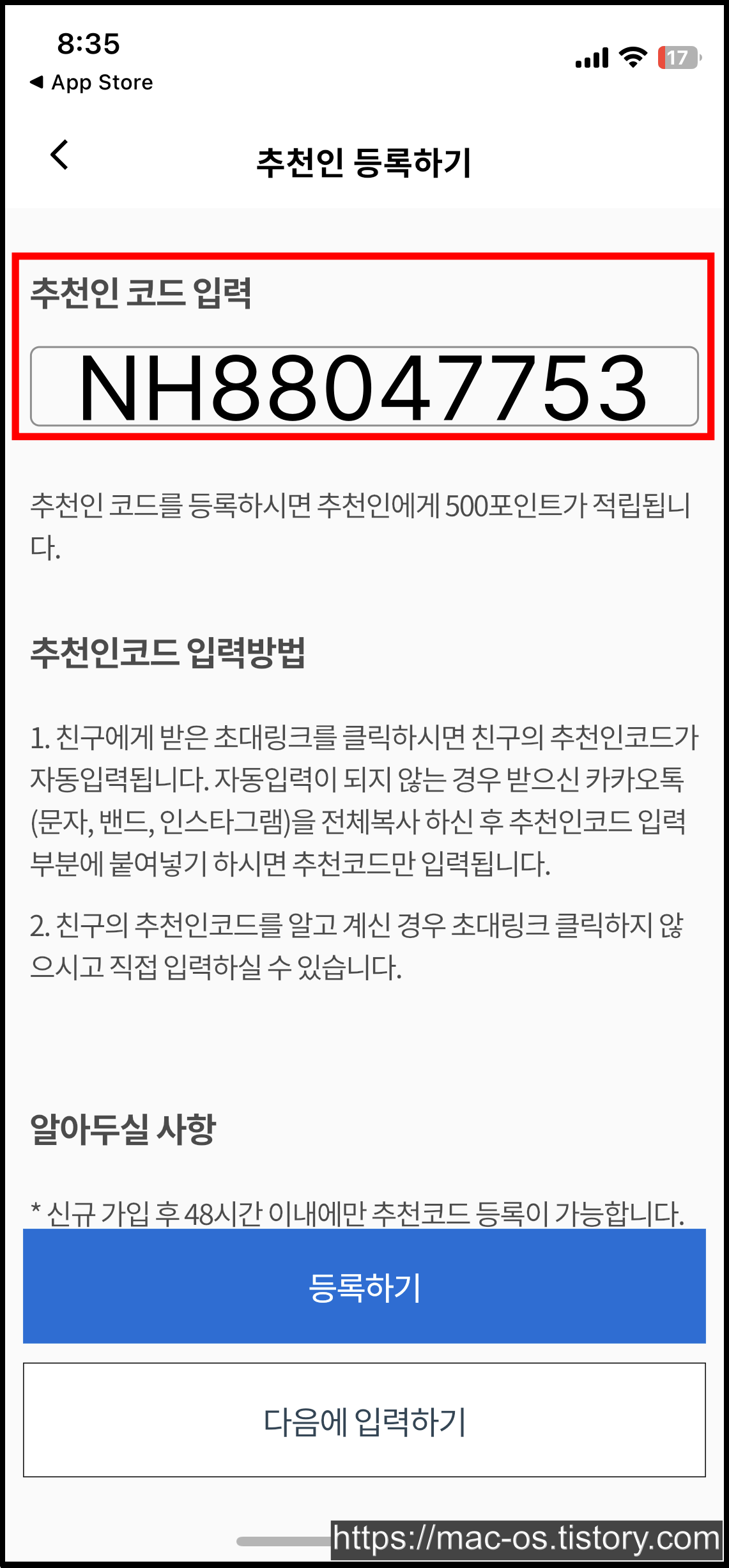 [추천인 등록하기] 페이지에서 추천인 코드 NH88047753 입력하면 된다.