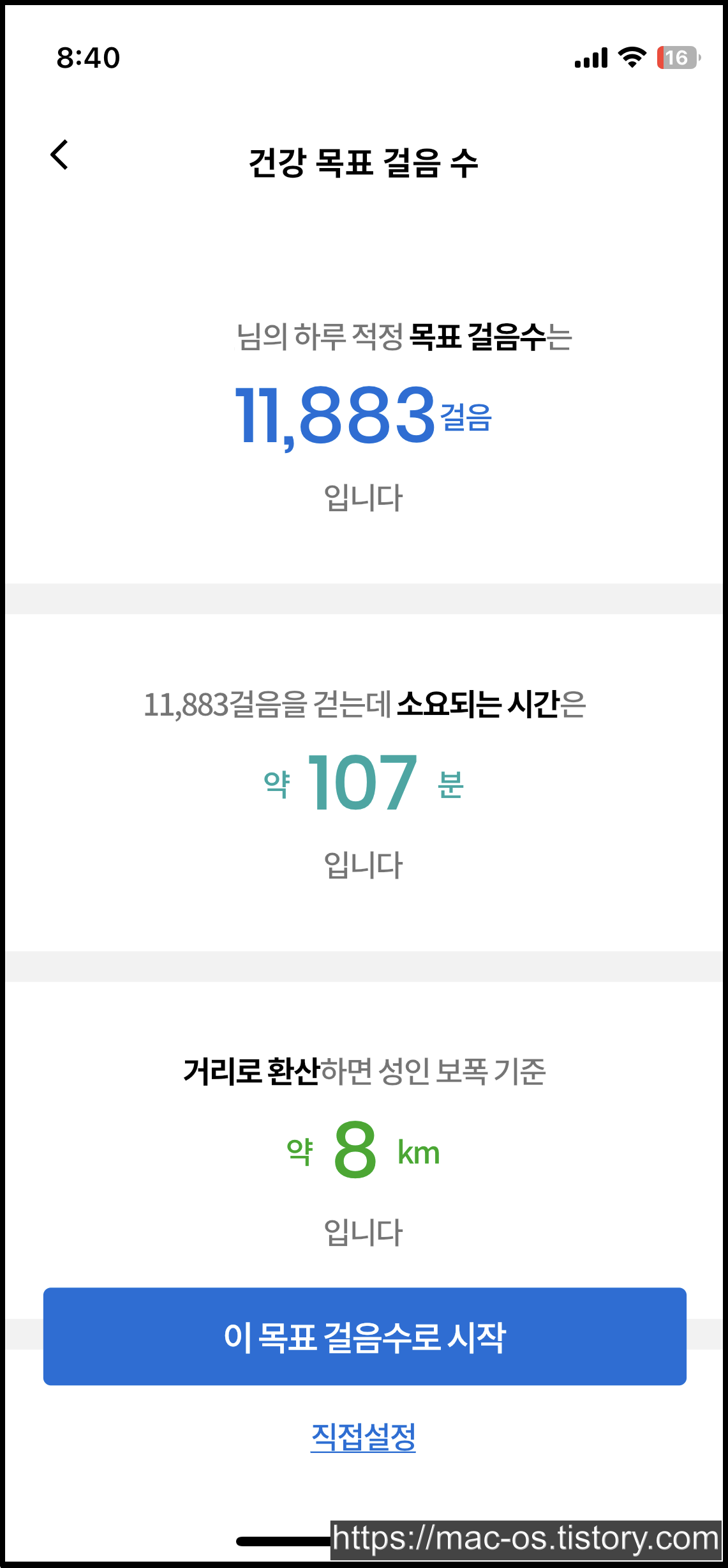 우선 마이페이지에서 [걷기 목표]를 누르면 자신의 키와 체중에 맞는 목표 걸음 수를 자동으로 측정해주는데, [직접설정]을 눌러서 9,000걸음으로 줄일 수도 있고 13,000걸음으로 더 늘릴 수도 있다.