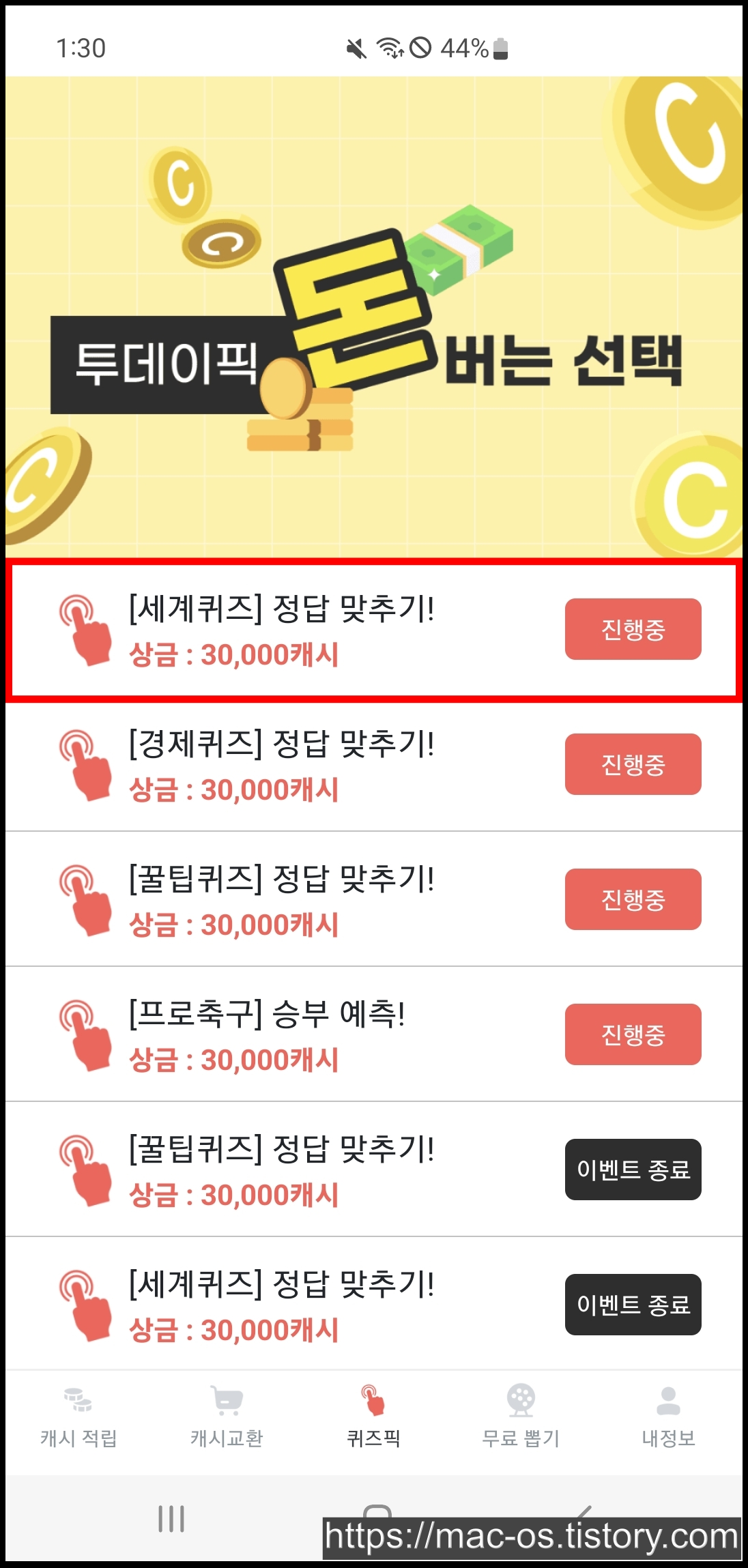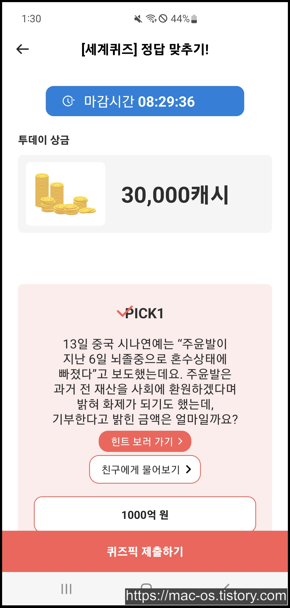 퀴즈픽 탭을 눌러보면 여러 퀴즈가 있는데, 뉴스 퀴즈 3개를 선택하고 제출하면 참여가 완료된다. 아마 퀴즈를 맞춘 사람에게 저 3만캐시를 1/n으로 나눠서 지급하는 형태로 보인다.