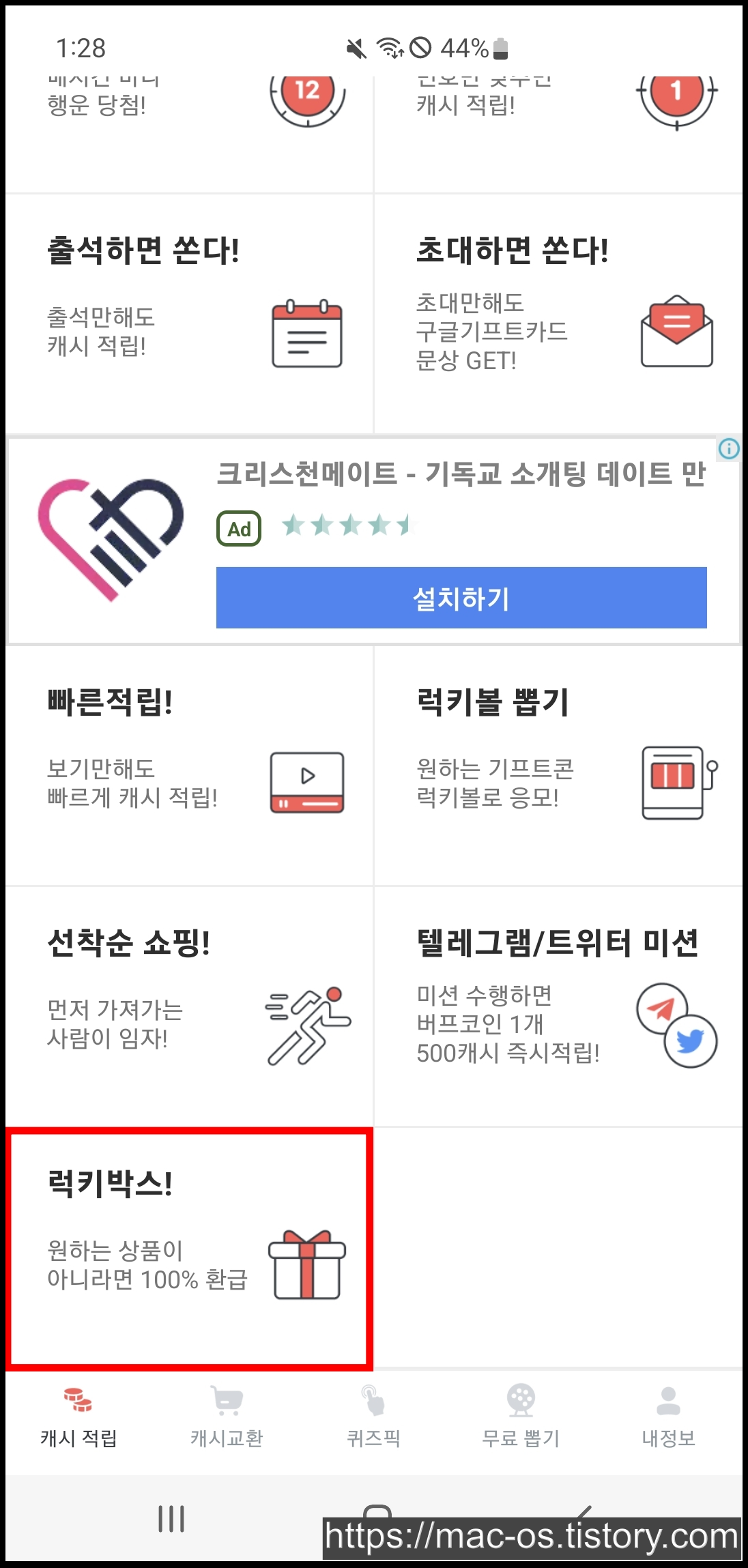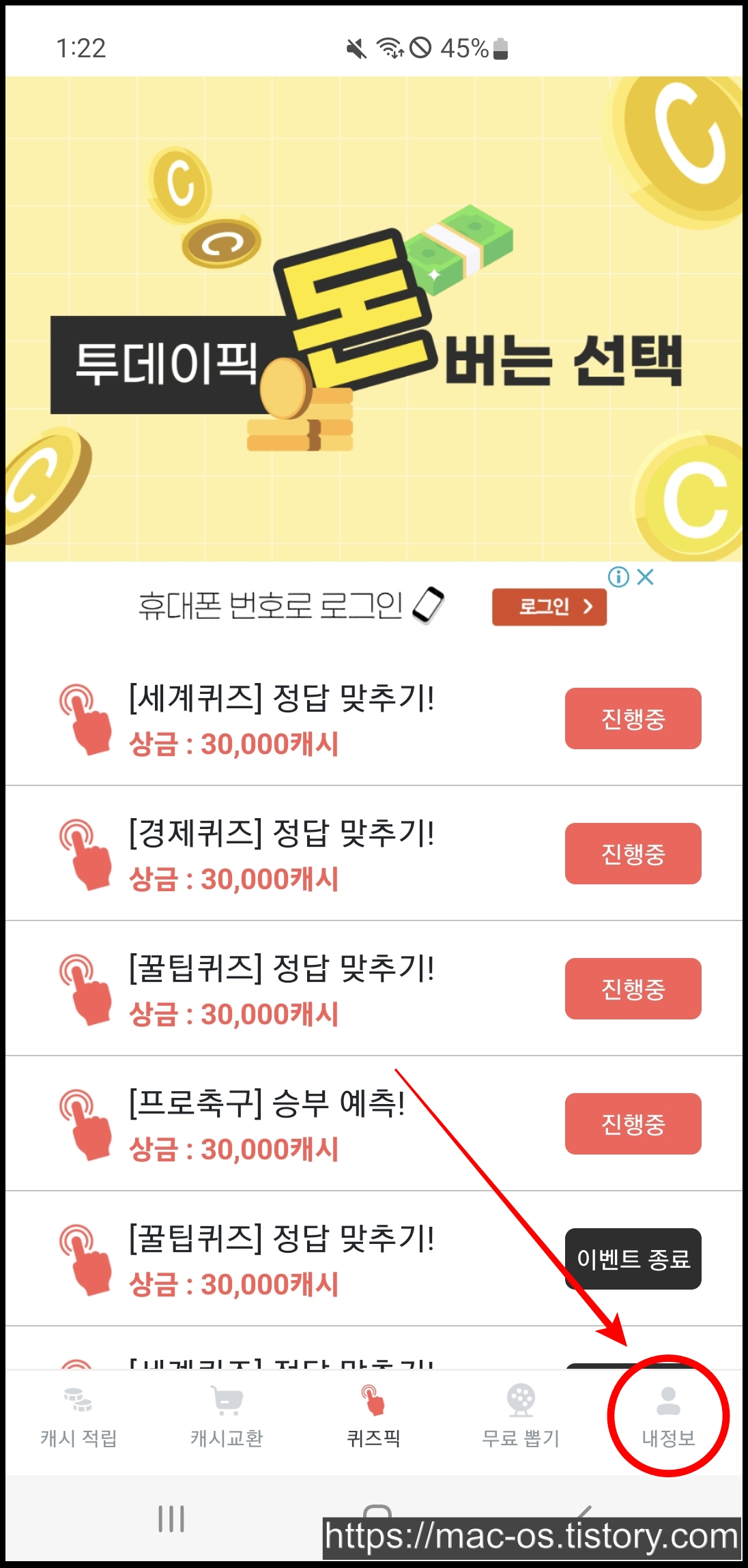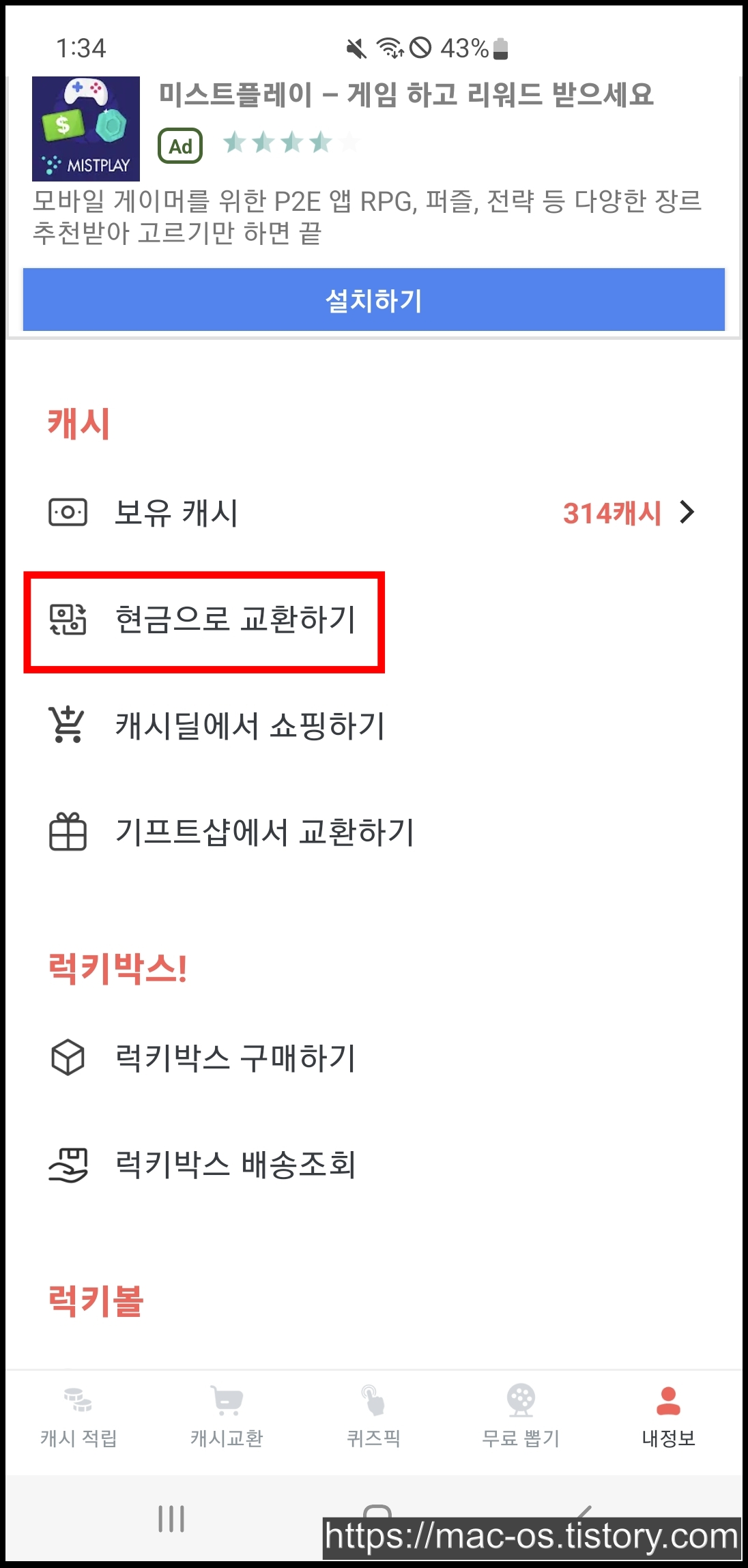 구글 플레이 스토어에서 캐시픽 앱을 설치하고 내정보로 이동한다.