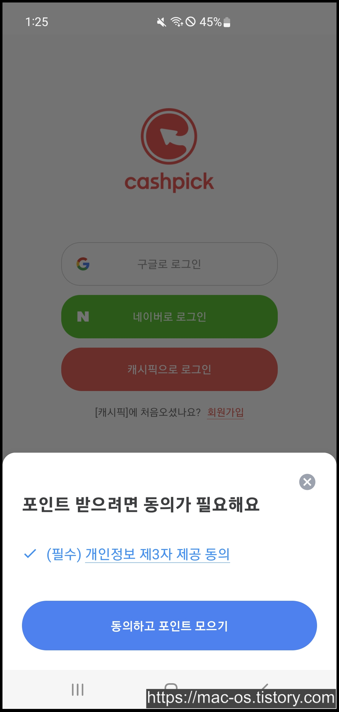 회원정보를 마저 입력하고 개인정보 제3자 제공에 동의하면 캐시픽 회원가입이 완료된다.