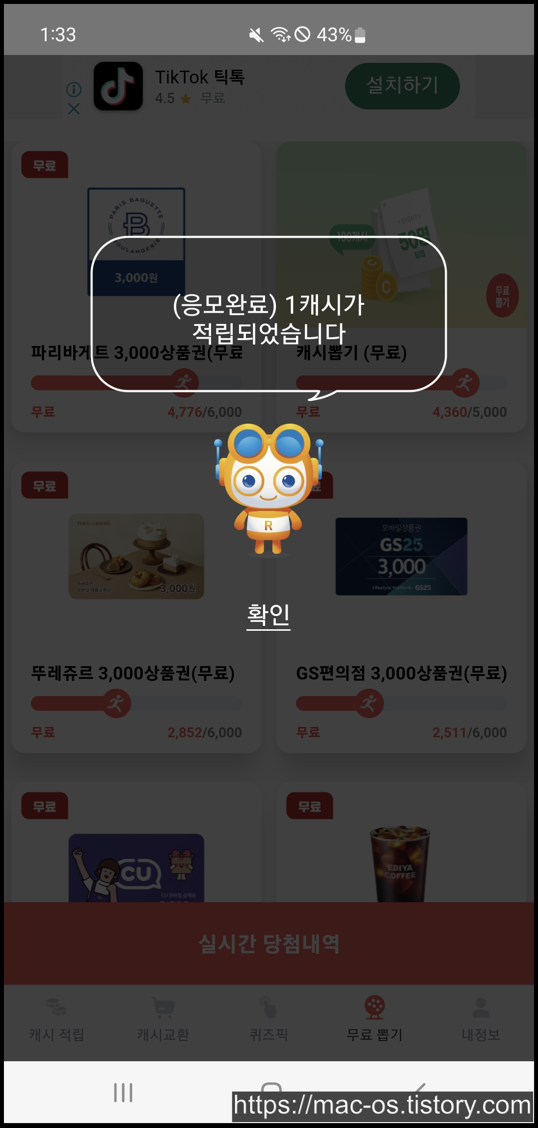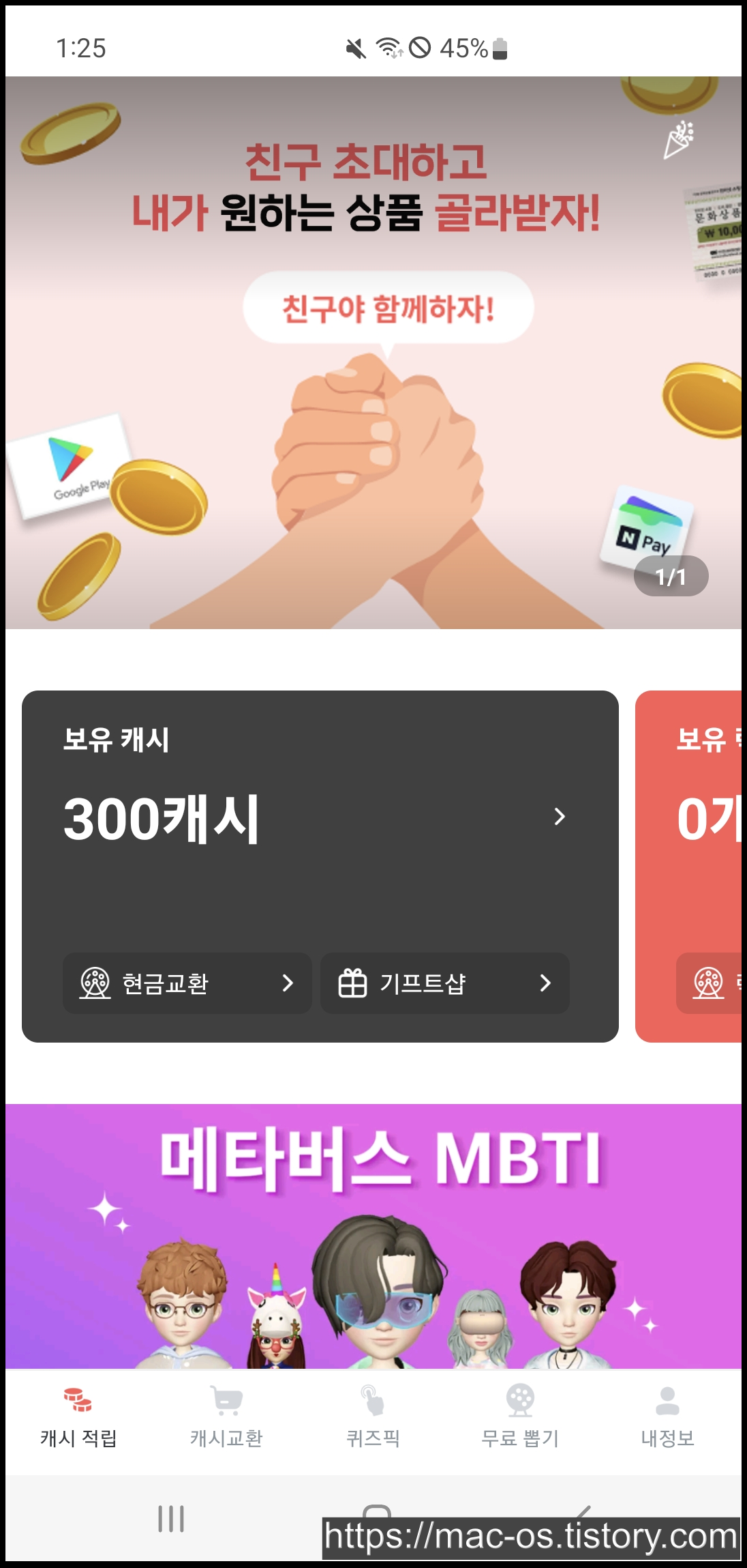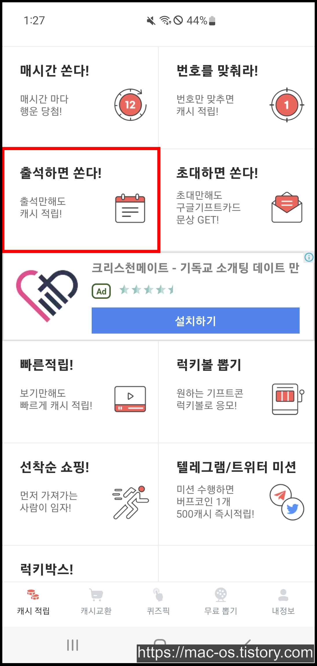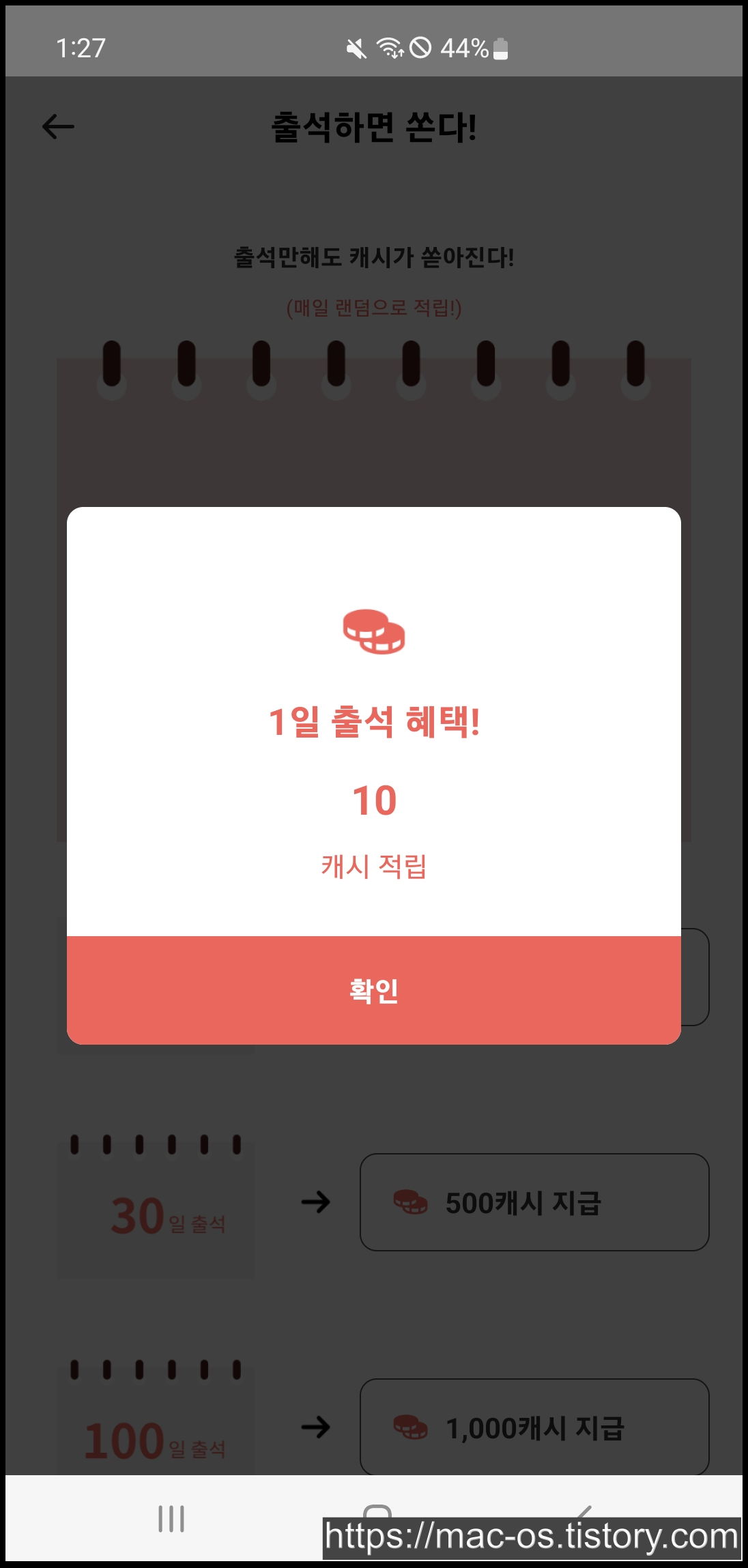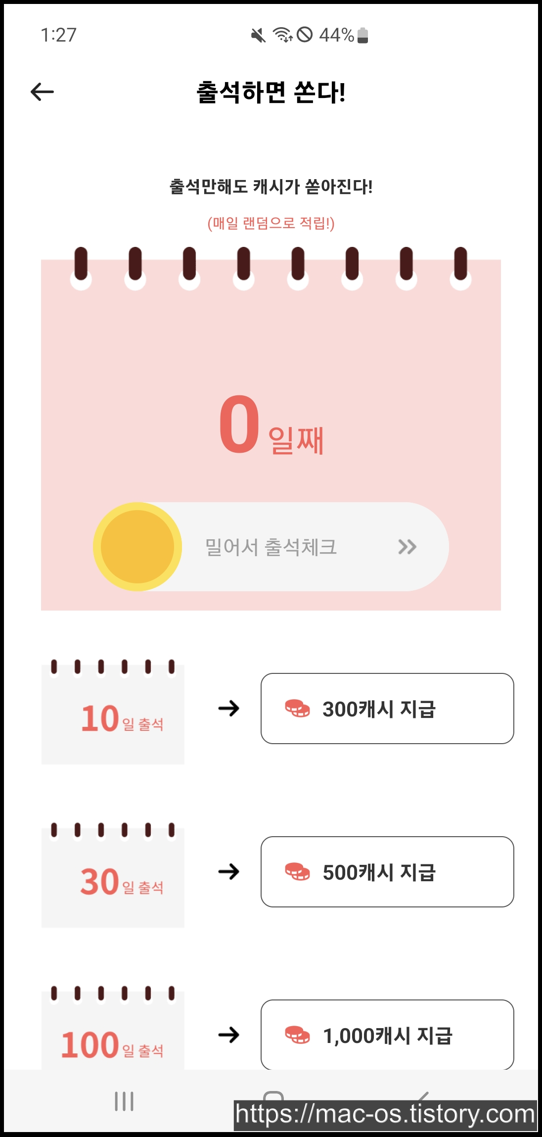 출석체크에서 노란색 동그라미를 밀면 출석할 수 있고, 매일 랜덤으로 적립된다는데 한 번 해보니까 10캐시가 적립되었다. 10일, 30일, 100일 출석에 따라 각각 300캐시, 500캐시, 1000캐시가 추가로 적립된다.