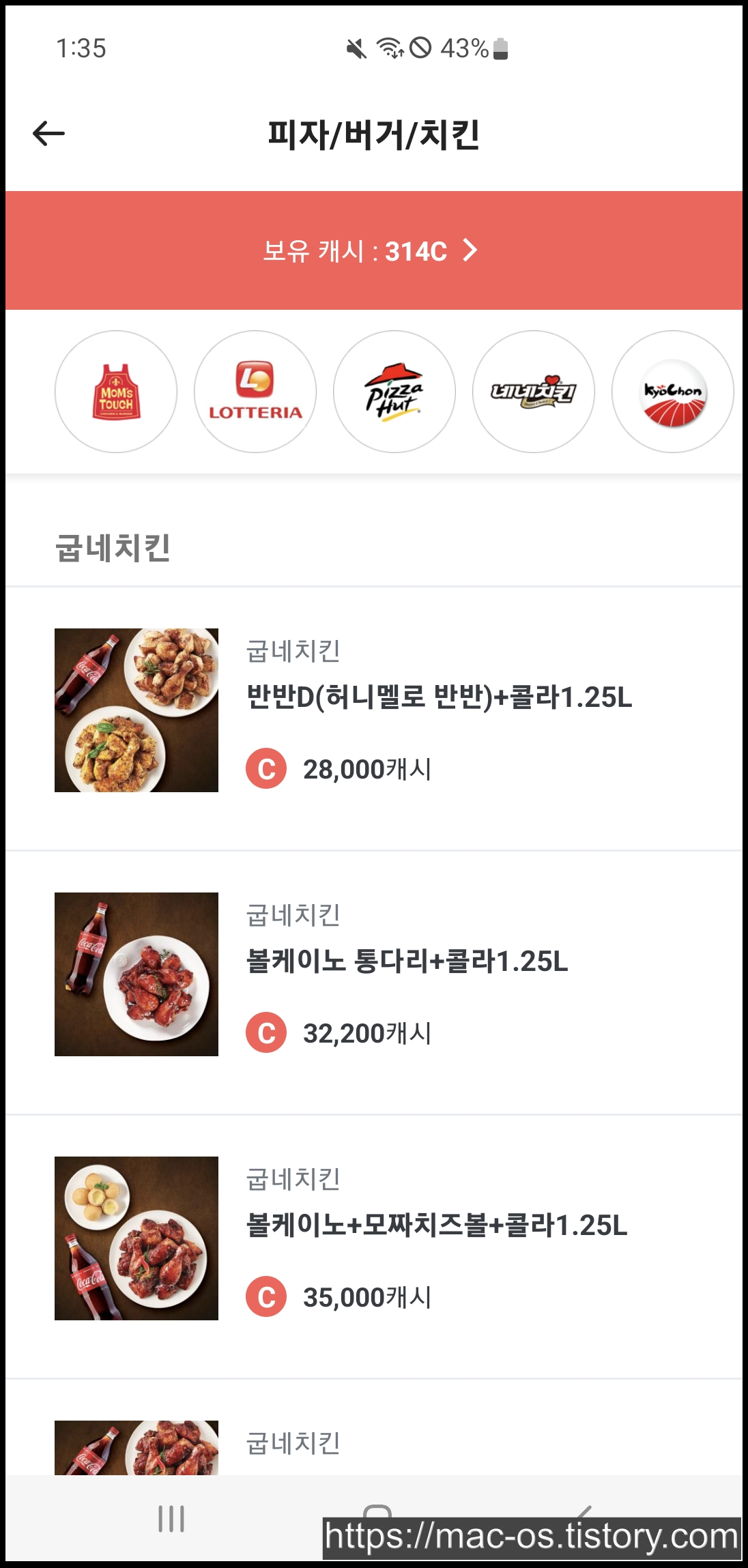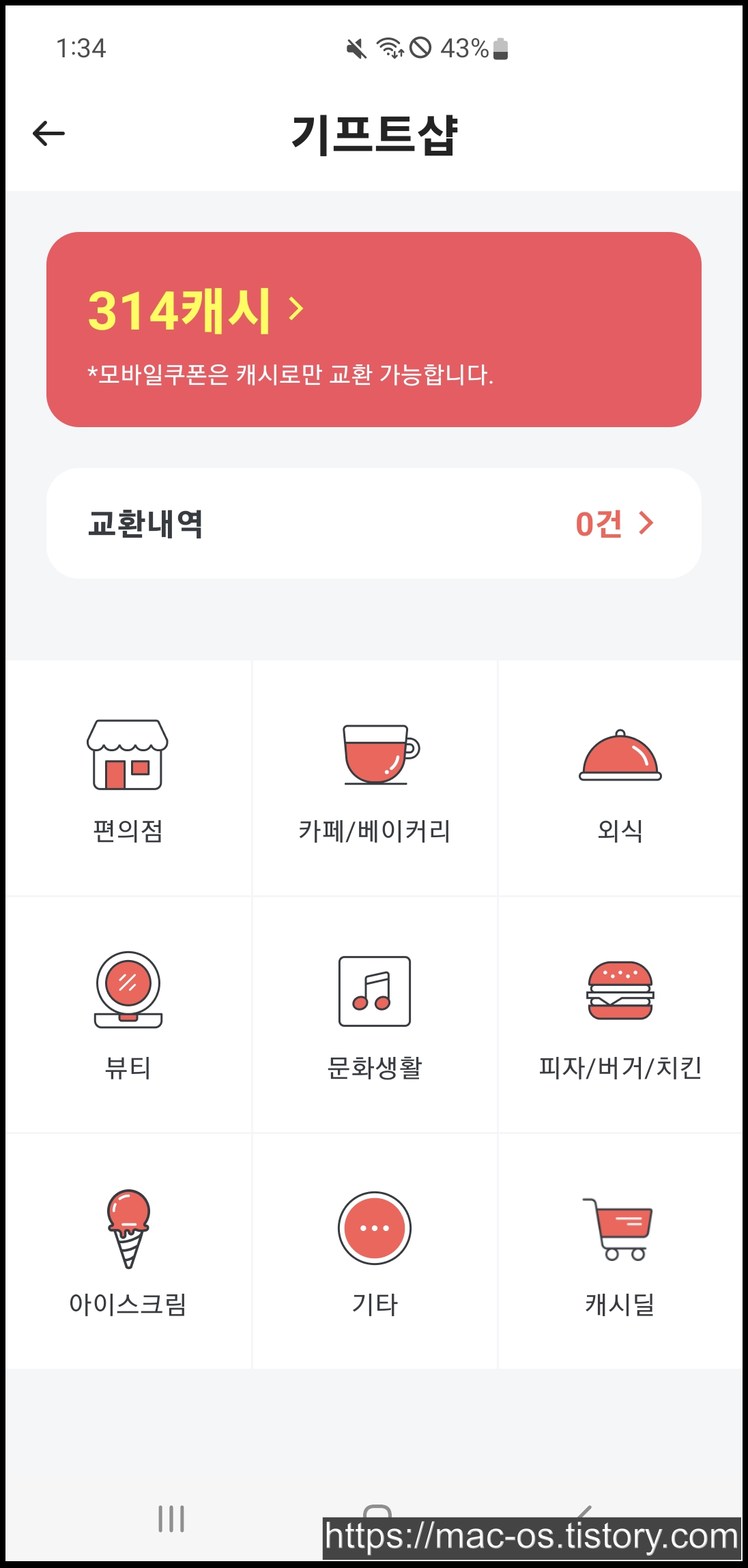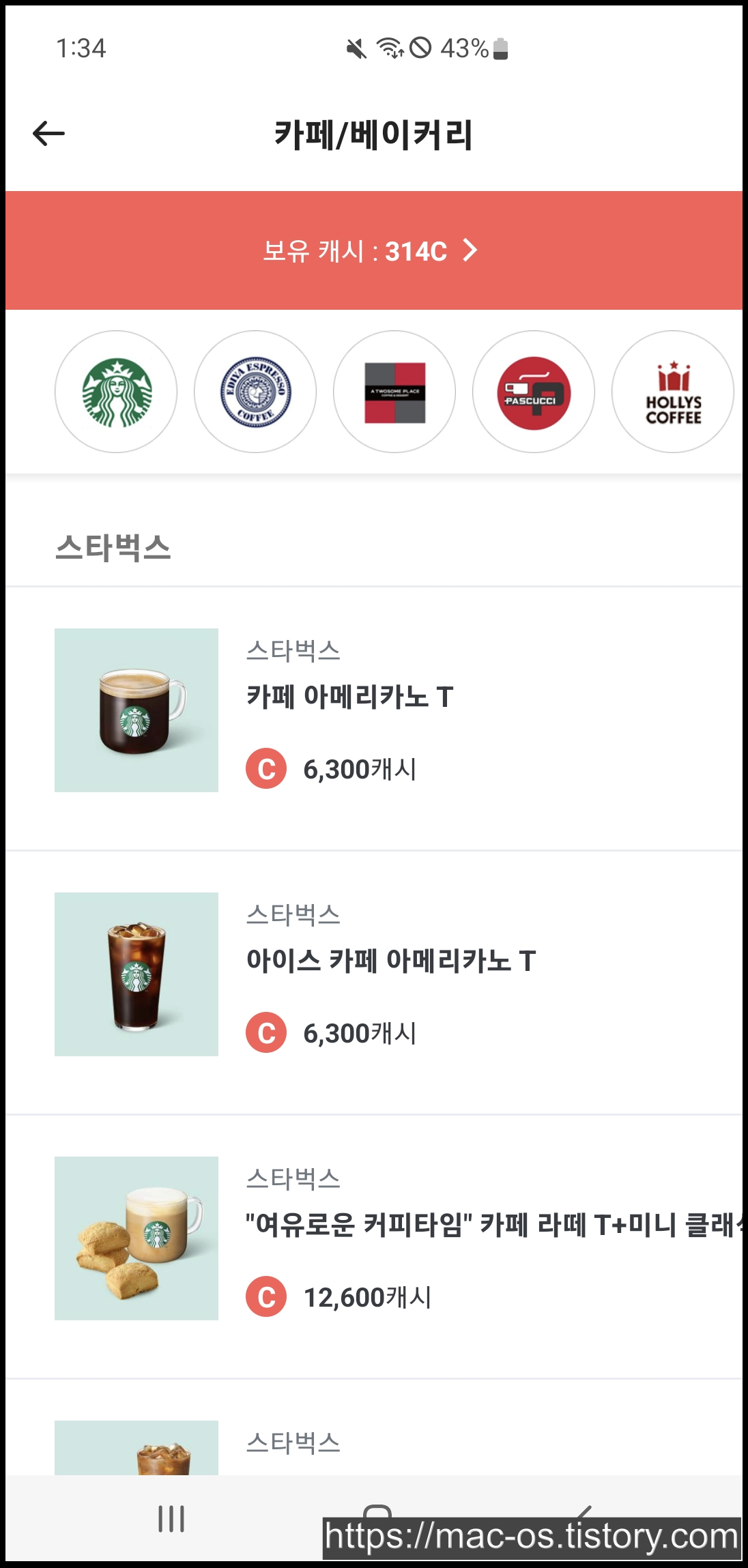 기프트샵에서는 여러 기프티콘이 판매되고 있다. 여기서 스타벅스 아메리카노나 굽네치킨 기프티콘을 구매하는 것도 가능하다. 스타벅스 아메리카노가 소비자 가격 4500원인데 여기서 1.4를 곱하면 6300원이 된다.