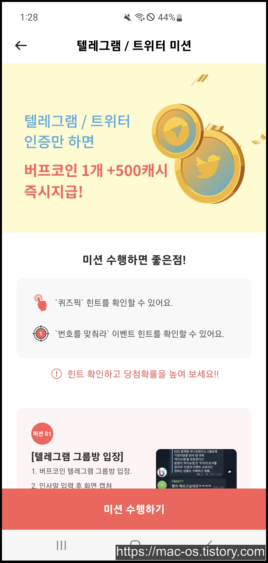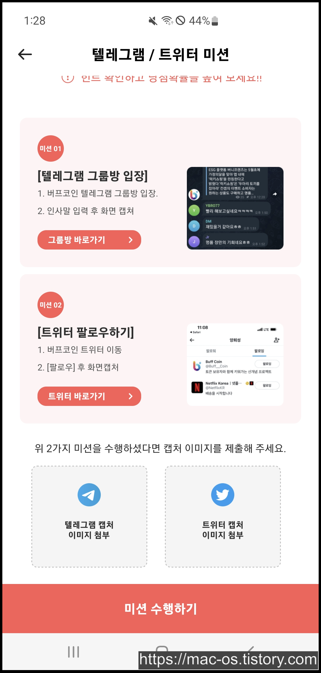 텔레그램이나 트위터 인증을 하면 버프코인과 500캐시를 즉시 지급한다. 텔레그램 그룹방에 입장하여 인사말 입력 후 화면 캡쳐, 버프코인 트위터로 이동하여 팔로우 후 화면 캡쳐한 사진을 첨부하여 제출하면 된다.