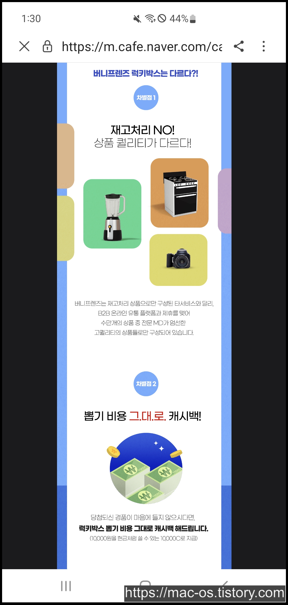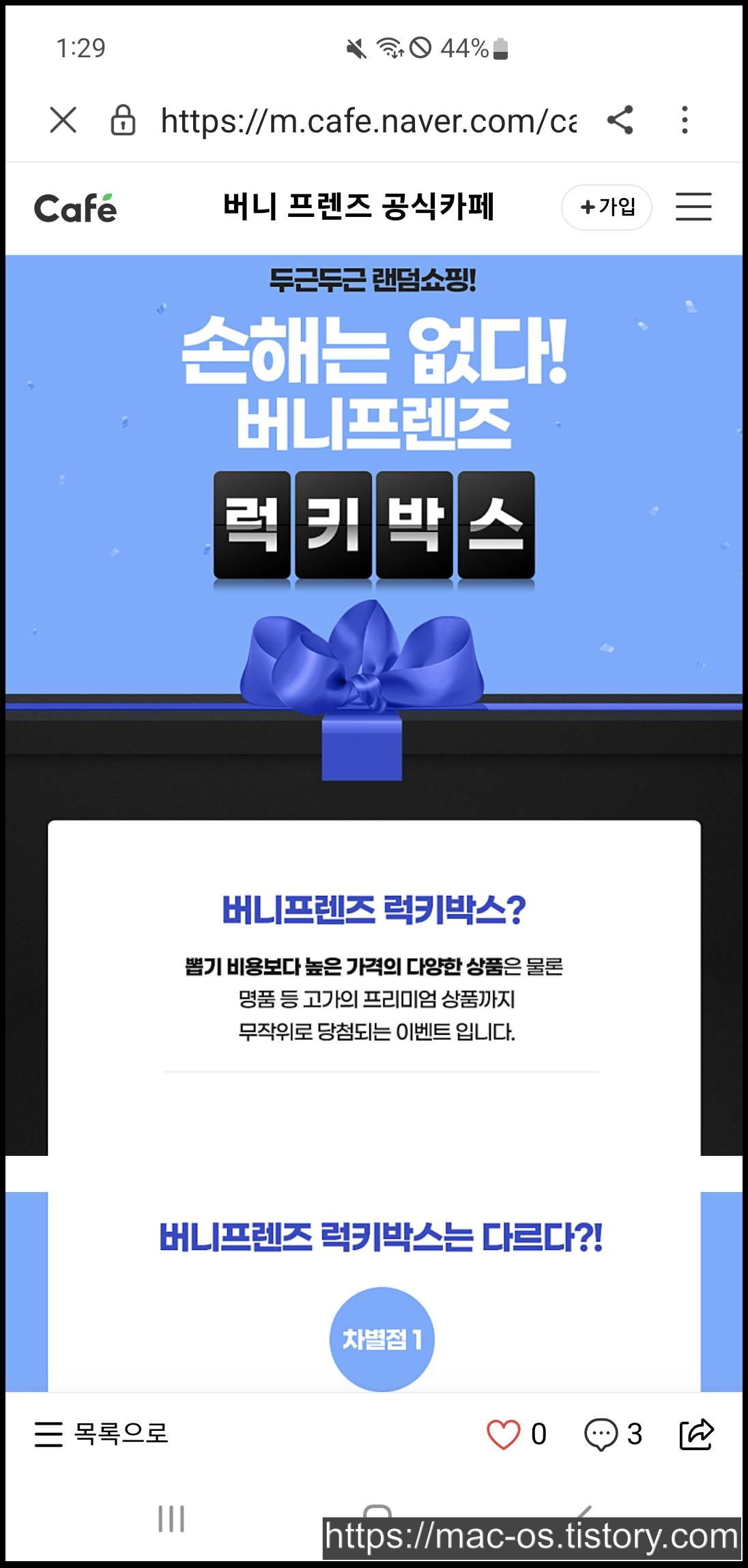 자세히 보기를 눌러 카페로 이동하여 럭키박스 내용을 읽어보면, 뽑기 비용보다 높은 가격의 다양한 상품은 물론 명품 등 프리미엄 상품까지 무작위로 당첨되는 이벤트라고 한다.
