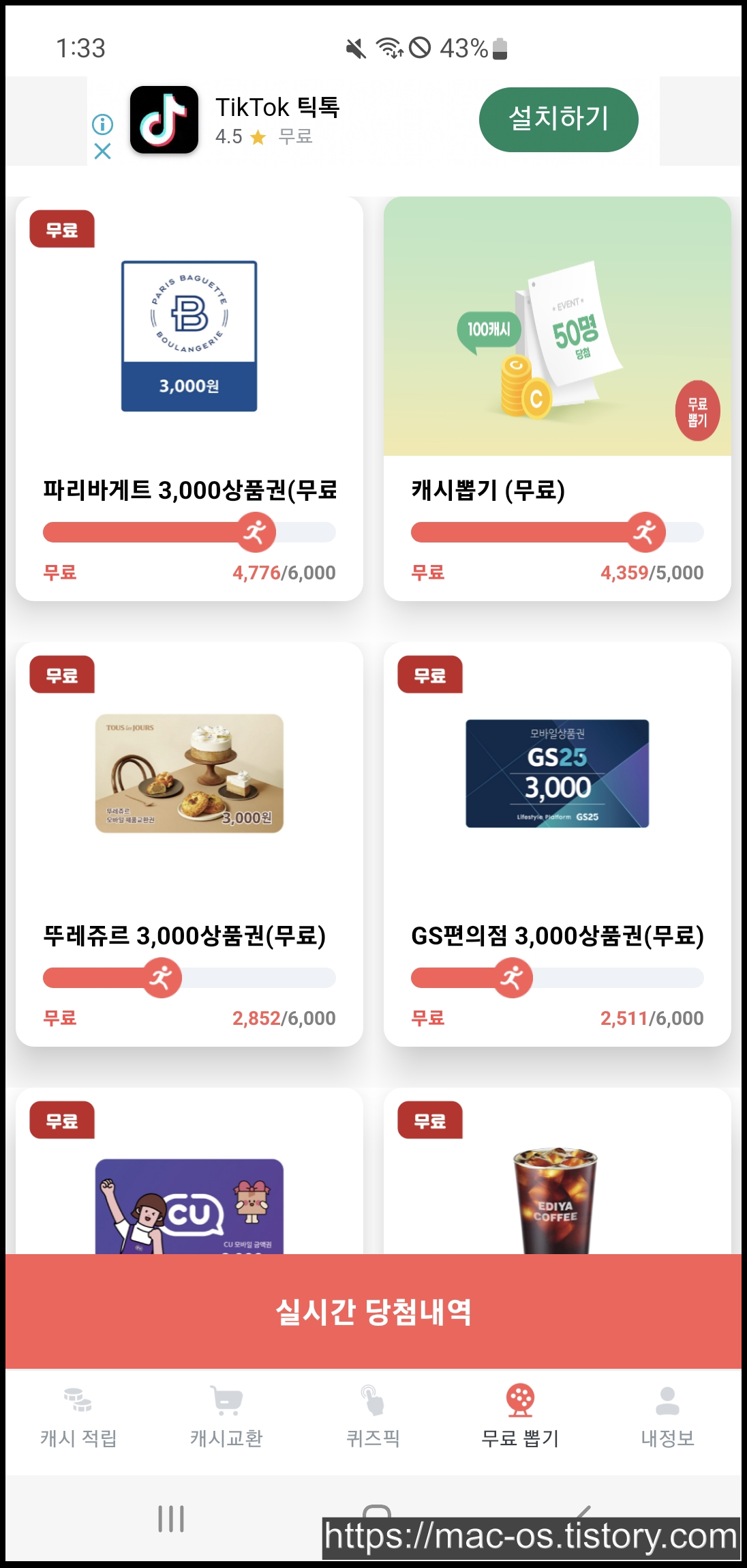 무료 뽑기에서는 마음에 드는 기프티콘을 선택하고 응모할 수 있다.