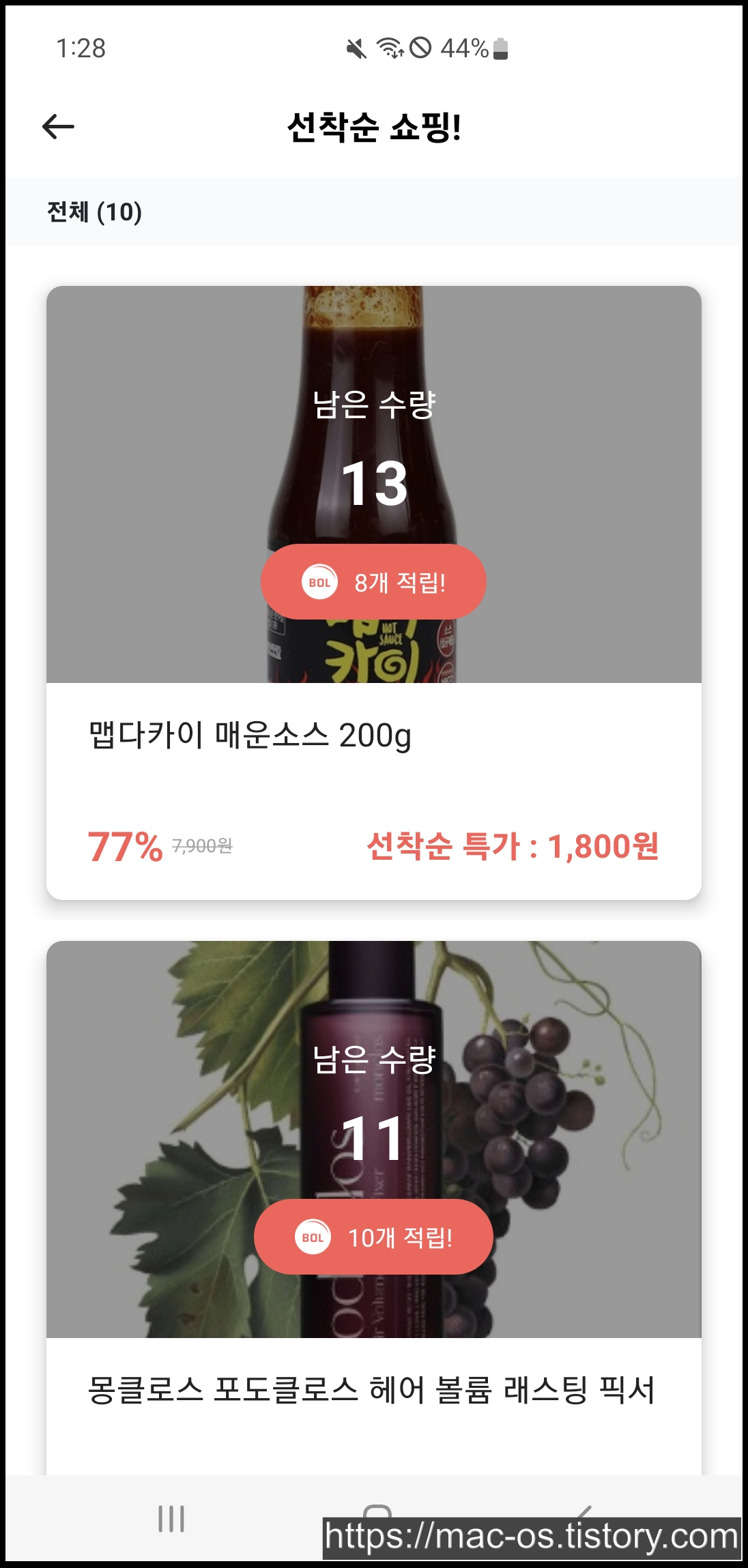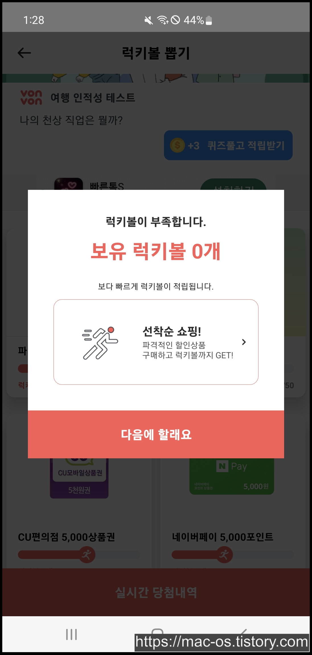 럭키볼 뽑기는 원하는 기프티콘을 럭키볼로 응모하는 곳인데, 럭키볼을 얻으려면 선착순 쇼핑에서 돈을 주고 상품을 구매해야 한다는 단점이 있다.