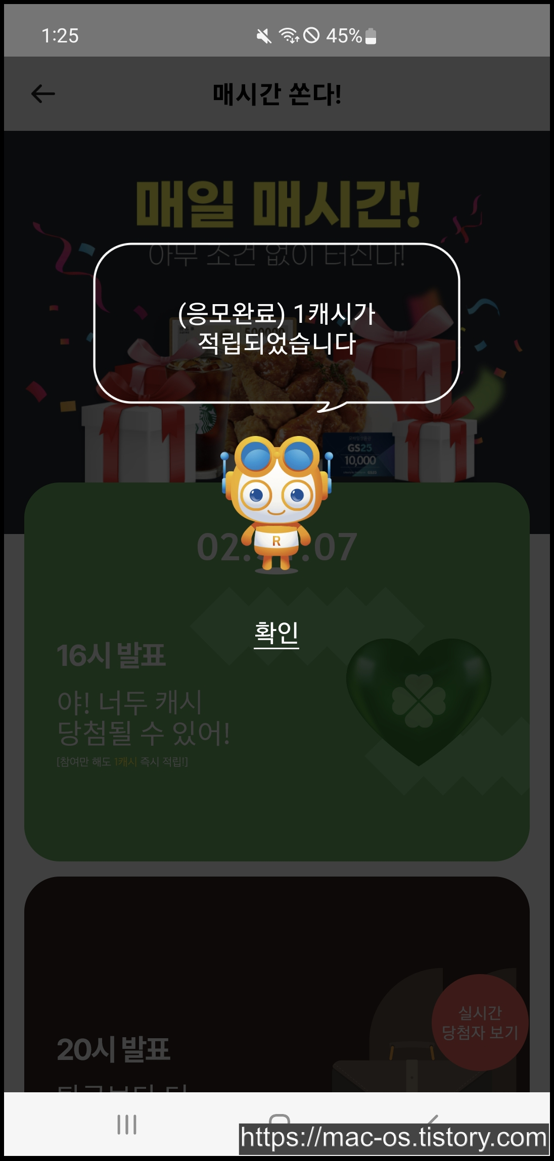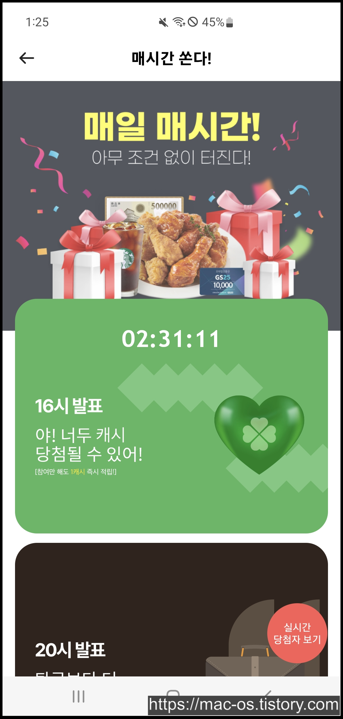 캐시픽에서는 매일 매시간마다 여러 기프티콘을 경품으로 지급한다. 참여 방법은 간단하다. [매시간 쏜다]에서 제일 상단에 있는 배너를 누르면 자동으로 응모가 된다.