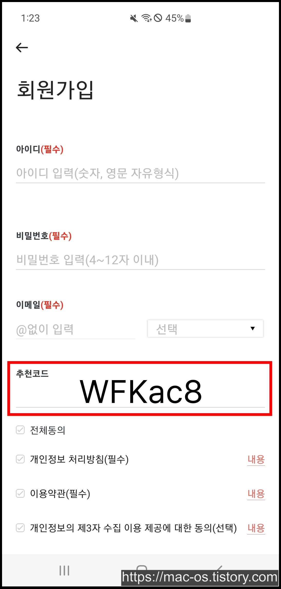 - 정보 입력 페이지에서 추천인 WFKac8 입력