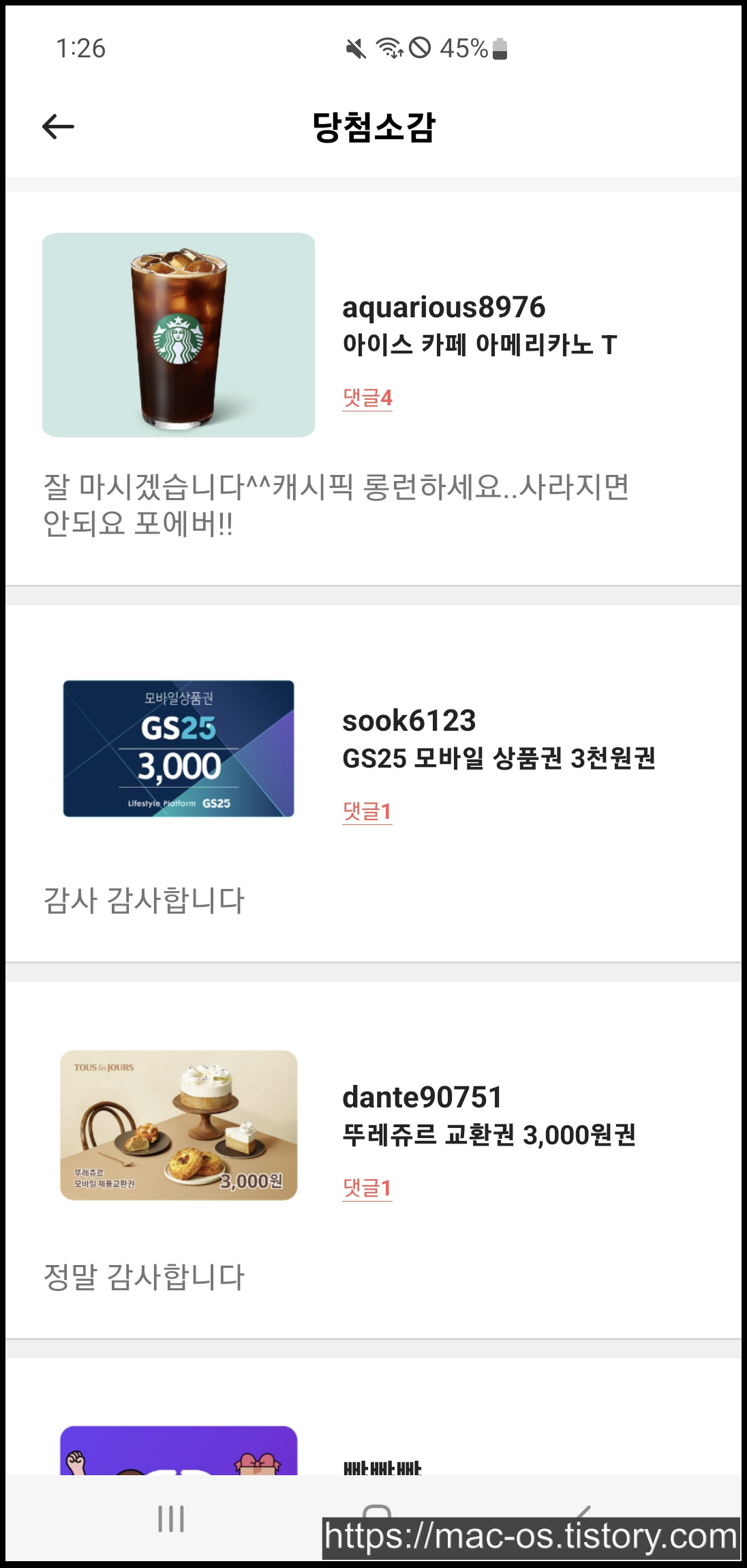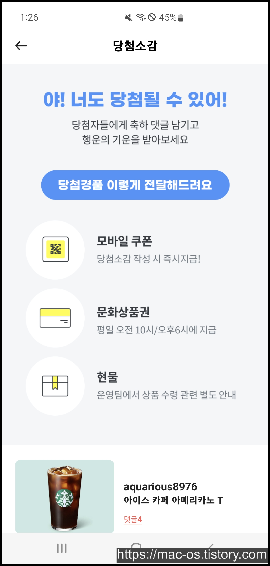 당첨되면 당첨소감을 쓸 수 있고, 보상으로 기프티콘이나 상품권이 지급되는 듯 하다.