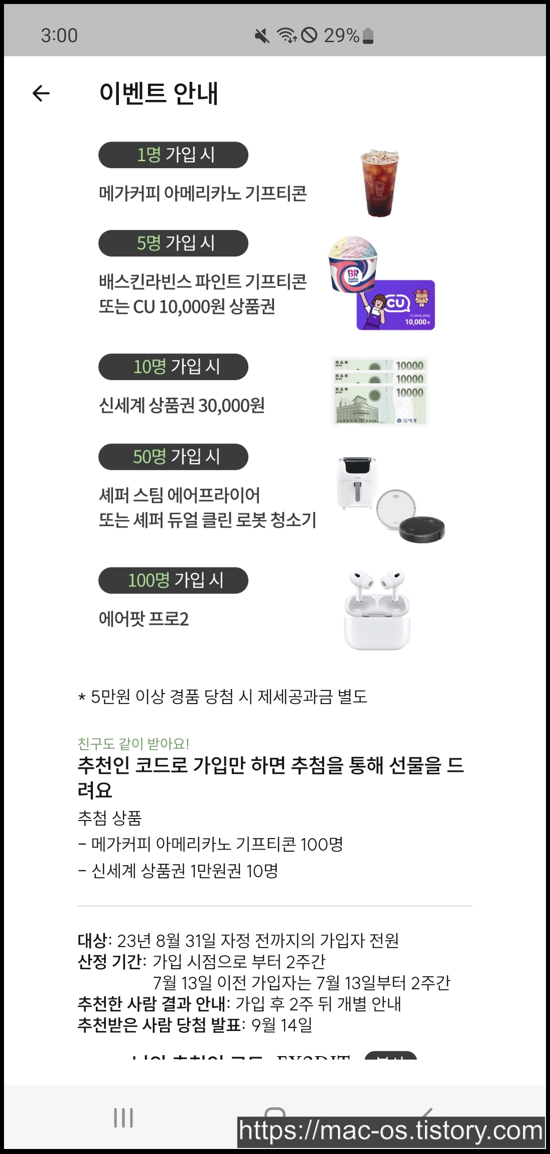 그리고 또 다른 이벤트, 친구초대 이벤트다. 친구를 초대한 횟수에 따라 경품이 지급되는데, 추첨을 통해 위에 있는 상품을 지급하는 것 같다. 아무래도 50명, 100명 경품은 1명만 추첨하는 듯. 제세공과금도 개인부담이라 22%의 금액을 지불해야 한다.