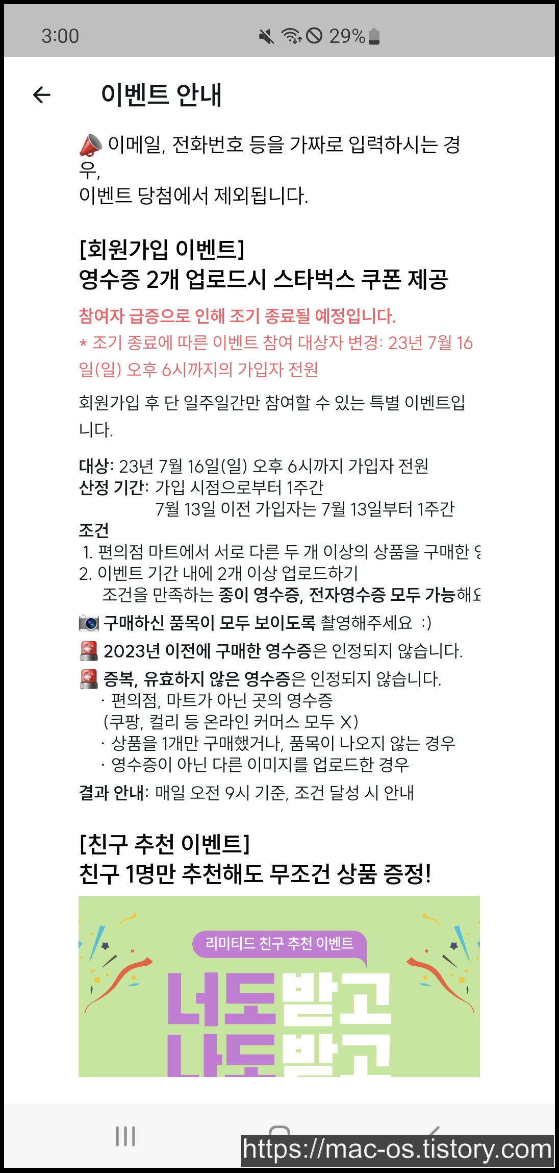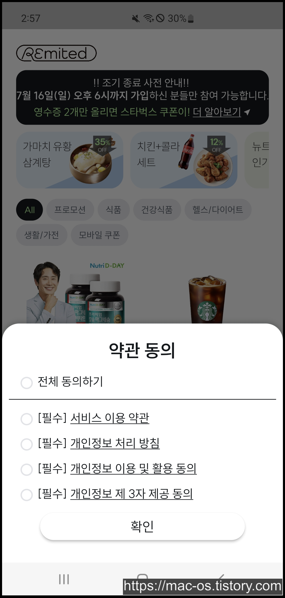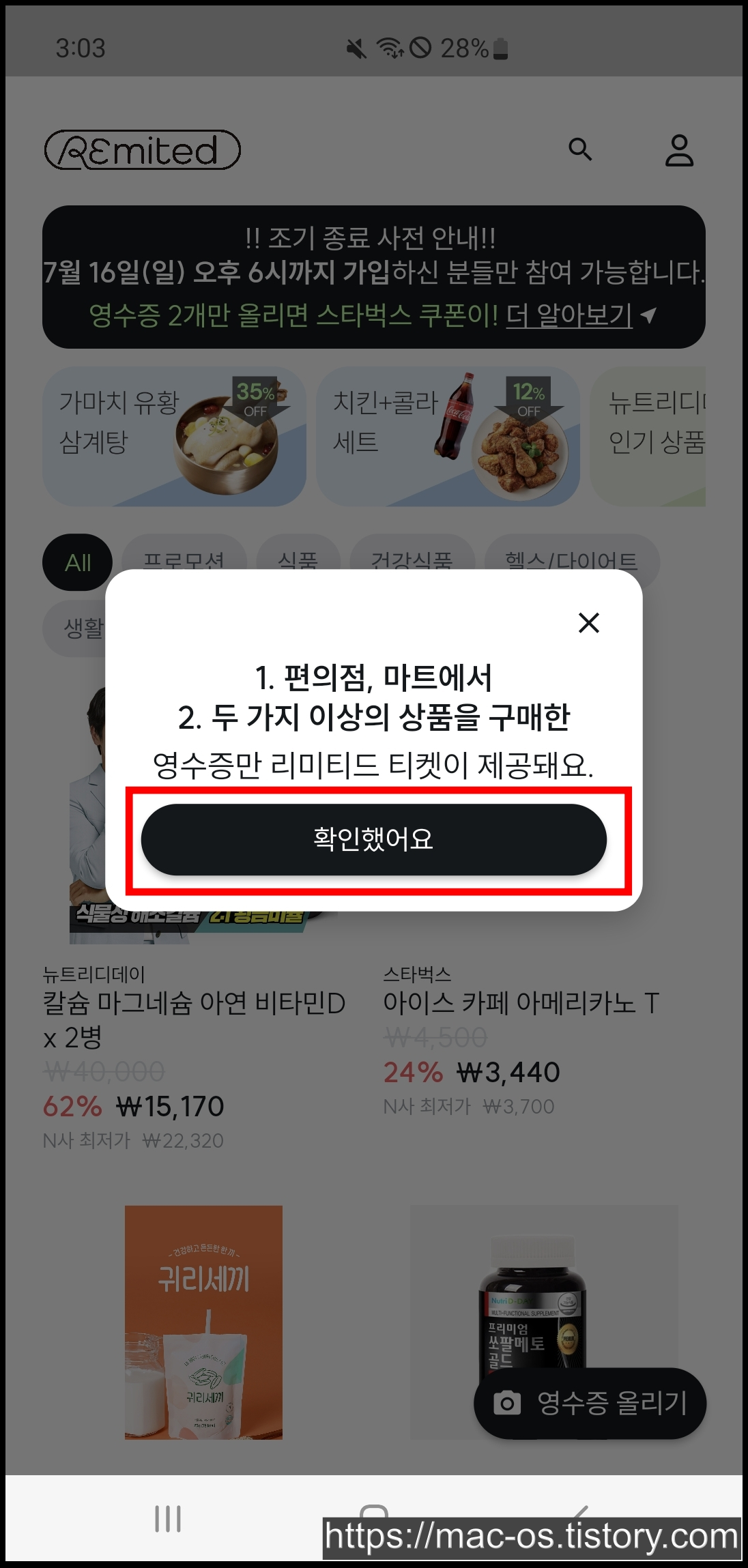 현재 진행되고 있는 리미티드 이벤트이다. 회원가입 후 편의점이나 마트에서 서로 다른 2개의 상품을 구매한 영수증을 2개 이상 업로드하면 스벅 커피를 준다고 한다.