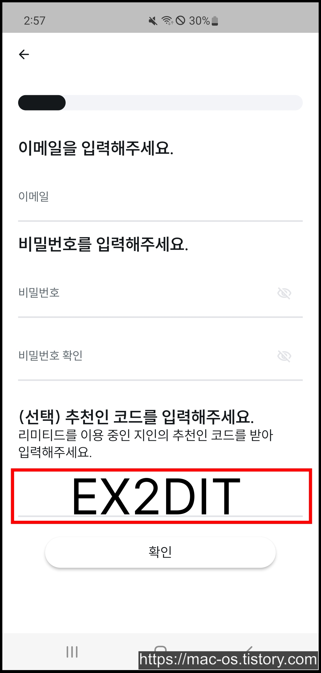 이메일과 비밀번호를 입력하는 페이지에서 추천인을 입력할 수 있다. 추천인은 EX2DIT를 복사해서 입력하면 된다.