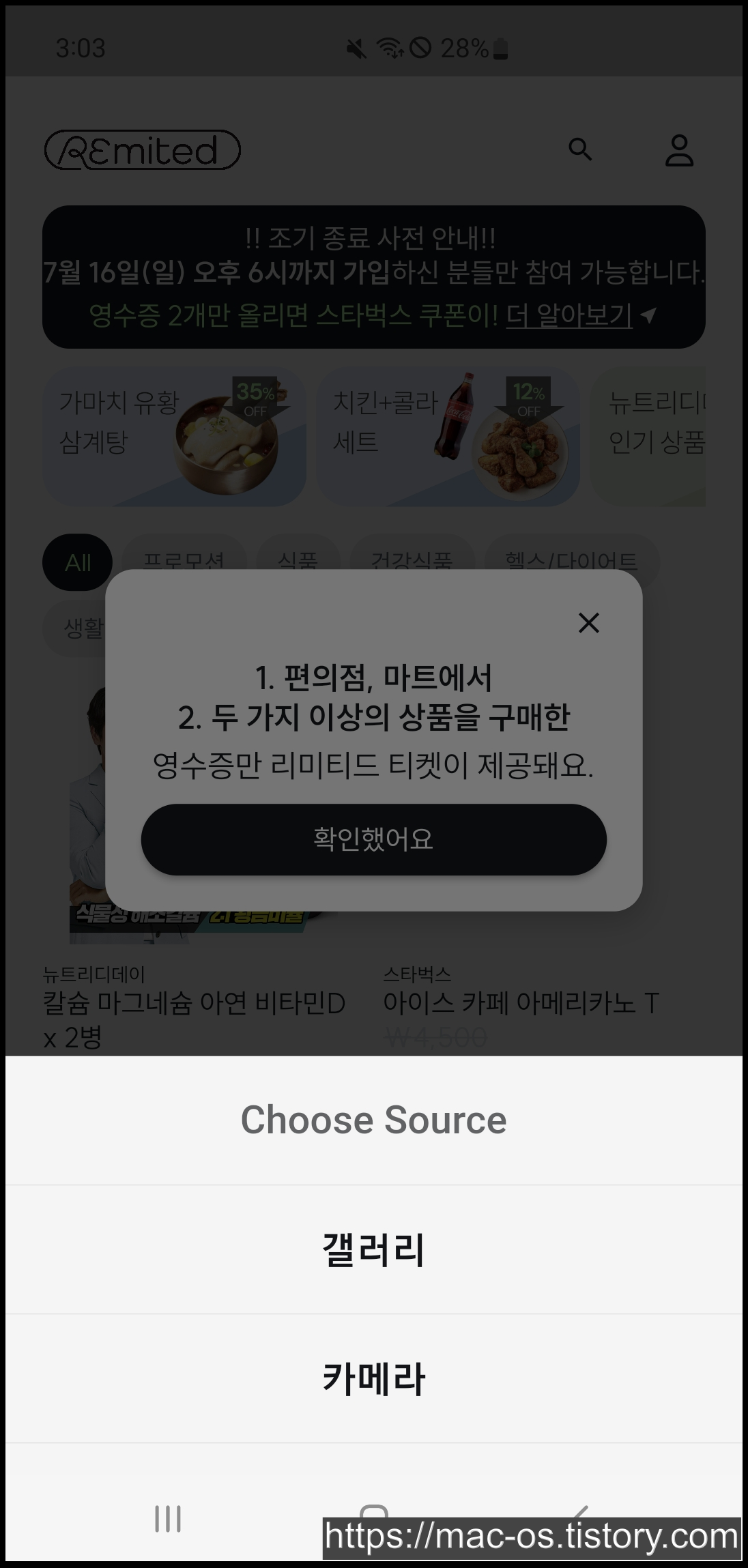 갤러리나 카메라에서 영수증 사진을 선택하면 영수증 등록이 완료된다. 근데 나는 잘못 눌러서 캡처한 사진을 제출했는데도 리미티드 티켓이 발급된걸 보면 아직 앱이 불안정한 것 같다.