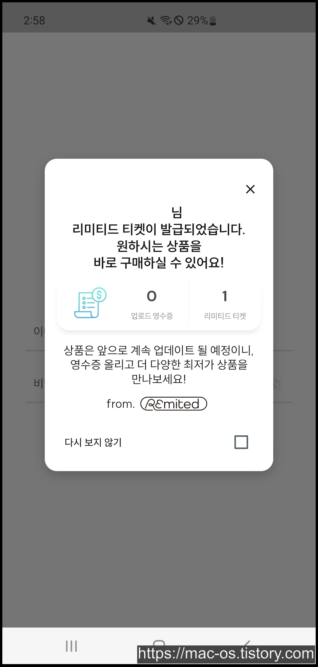 회원가입을 마치면 리미티드 티켓이라는 것을 받게 된다. 리미티드 티켓은 리미티드 앱 내에서 쇼핑을 할 때 필요하다.