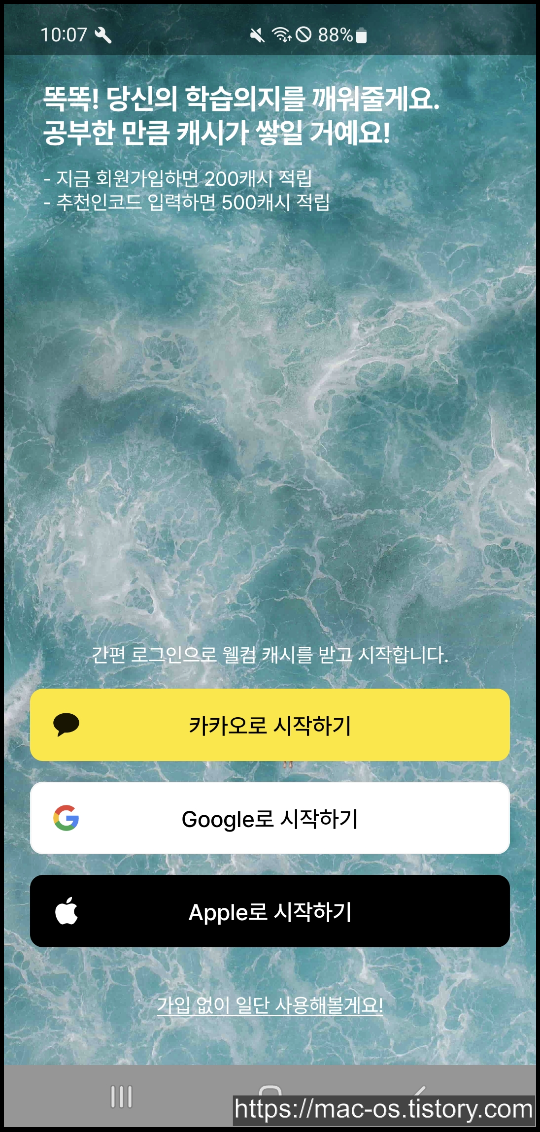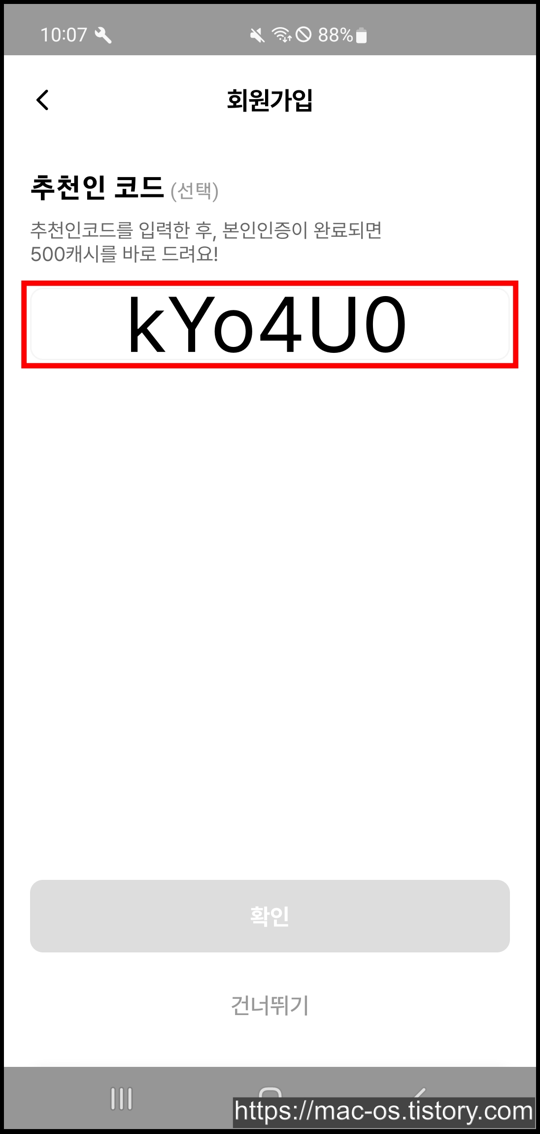 회원가입 페이지 도중에서 추천인 코드를 입력하면 신규회원에게 500캐시가 적립된다. 입력할 추천인이 없다면 kYo4U0를 복사해서 입력하면 된다.