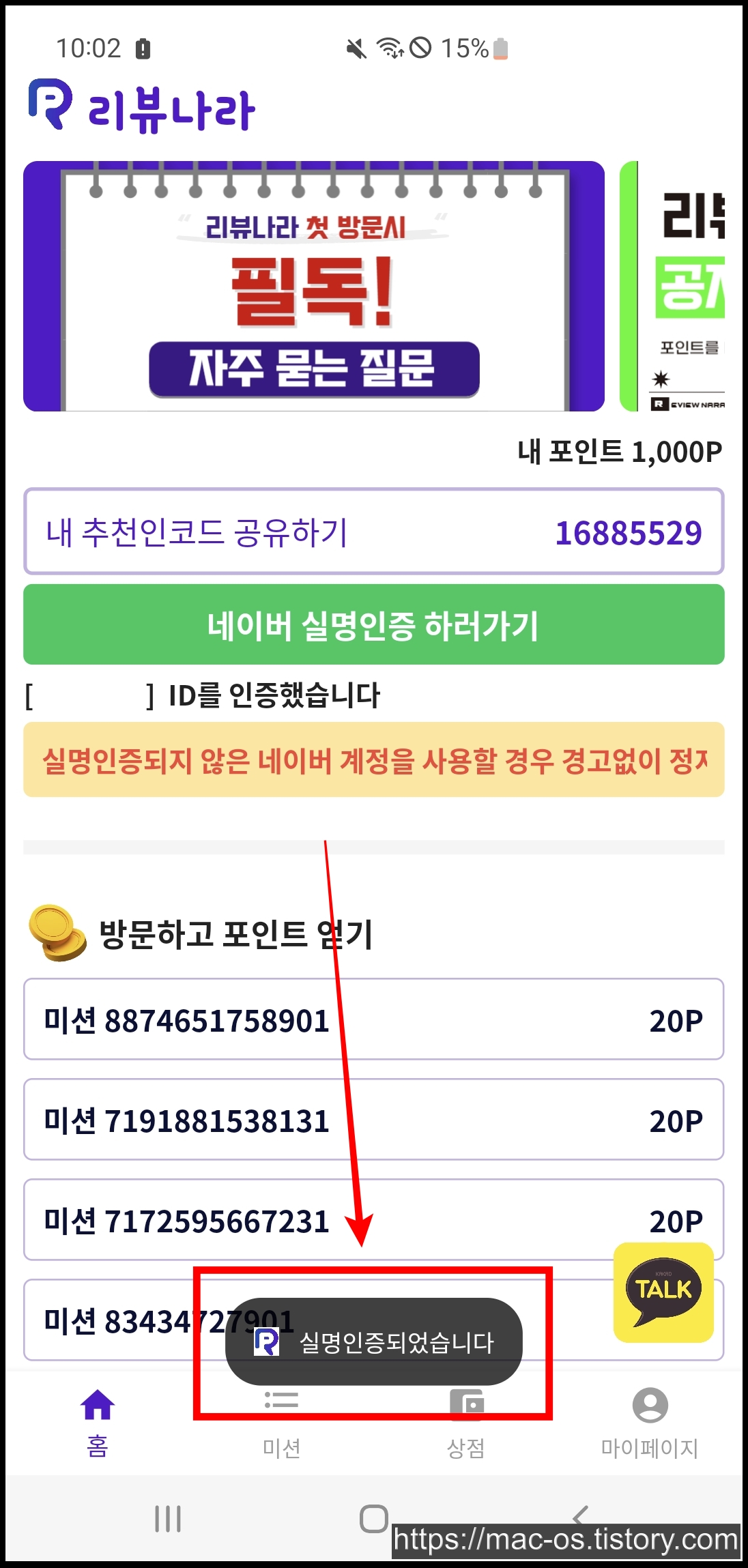 공유 메뉴에서 [리뷰나라]를 누르면 리뷰나라 앱으로 이동하게 되면서 미션이 완료됨과 동시에 포인트가 적립된다.