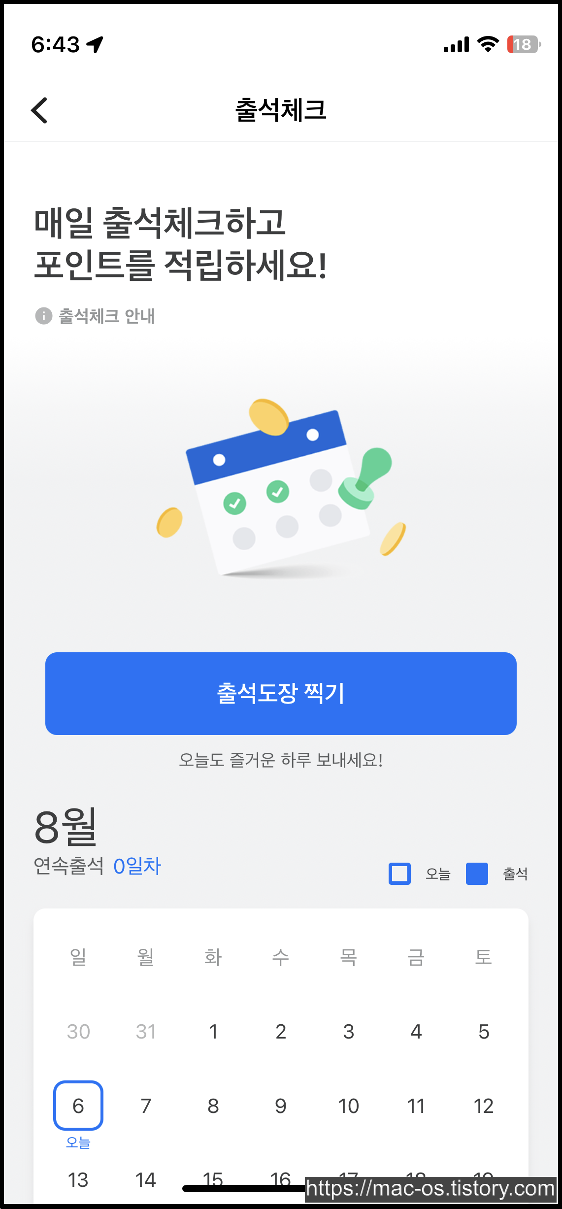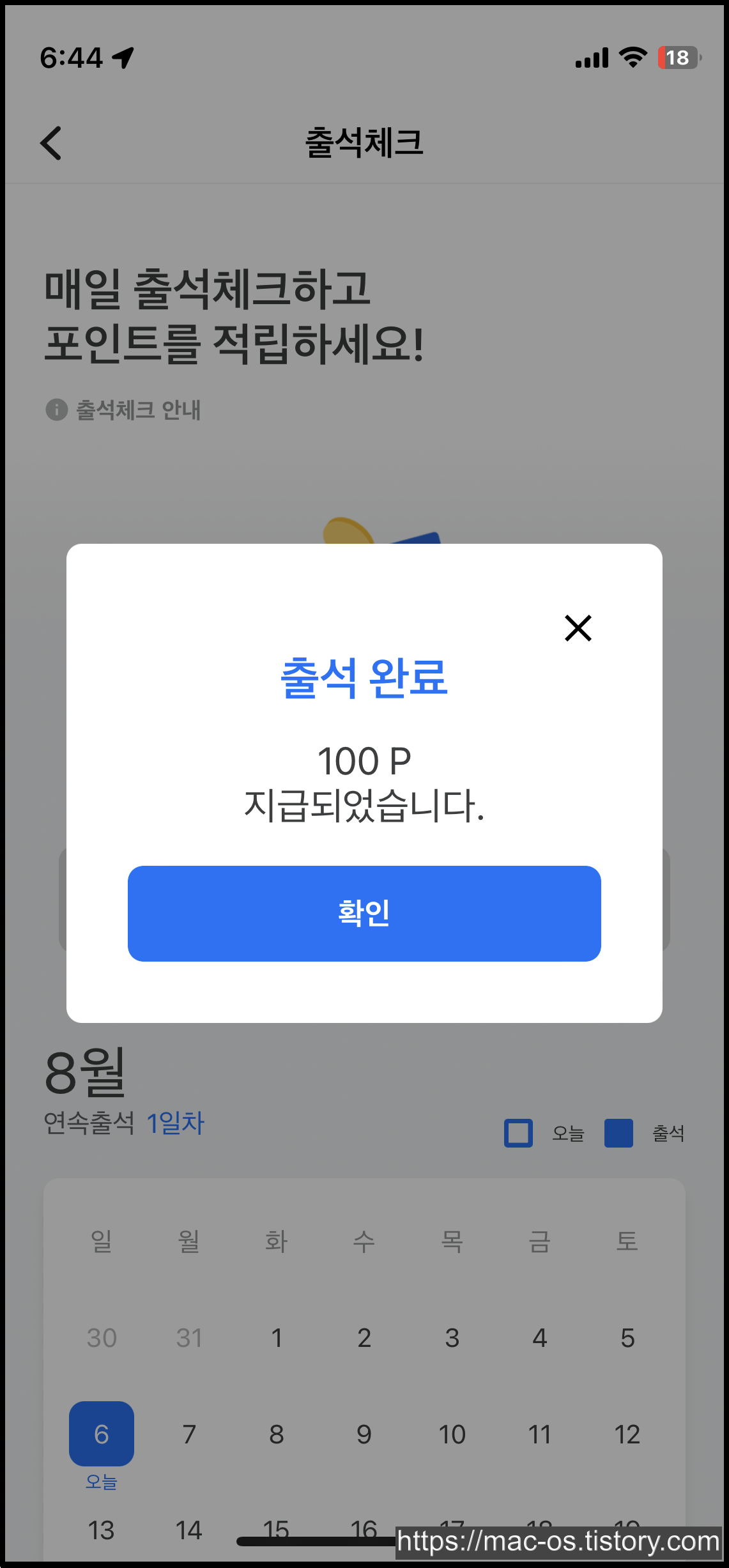 출석도장 찍기 버튼을 누르면 출석 보상으로 100포인트가 적립된다.