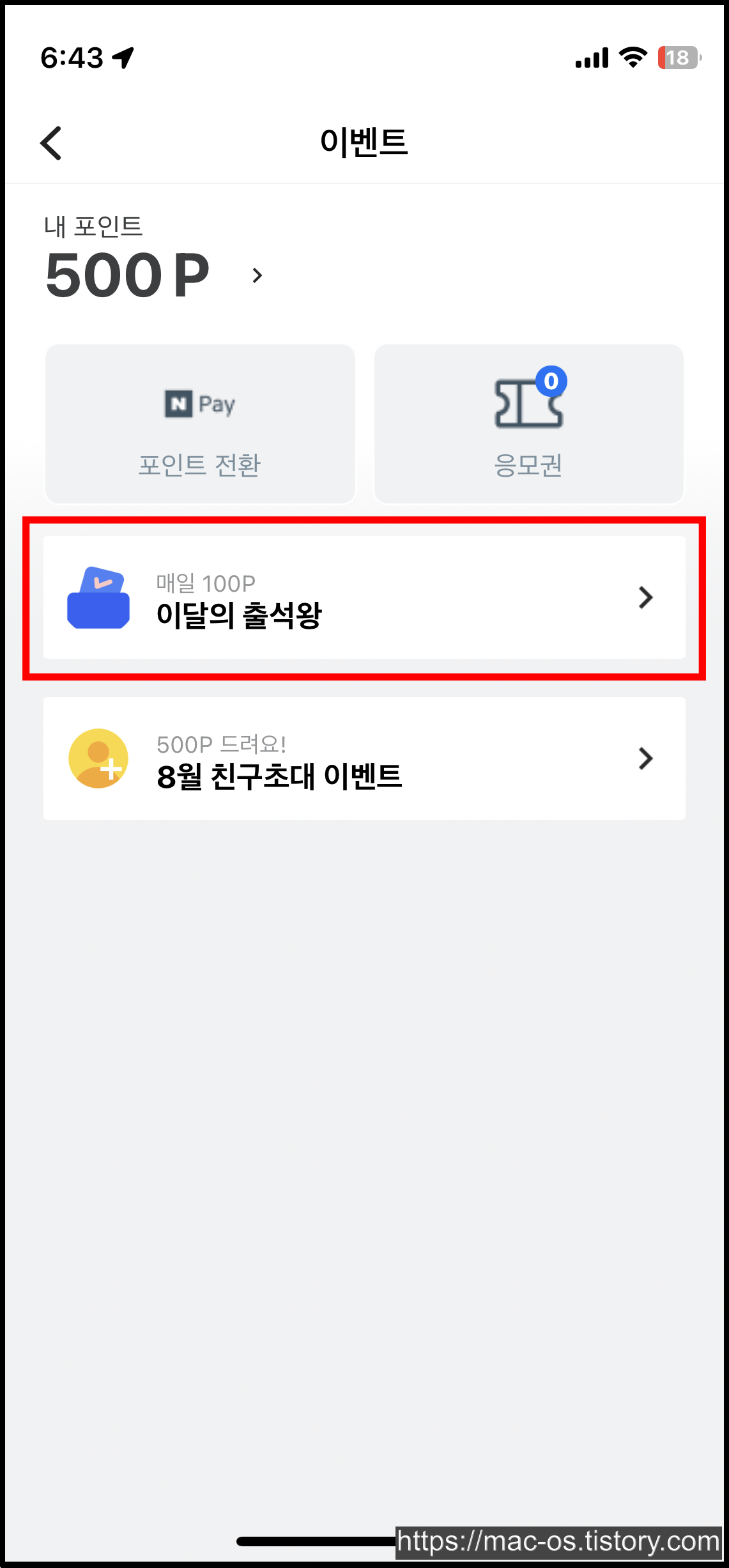 만보기 외에도 [이달의 출석왕]으로 이동하면 매일마다 출석체크를 하고 100포인트를 받을 수 있다.