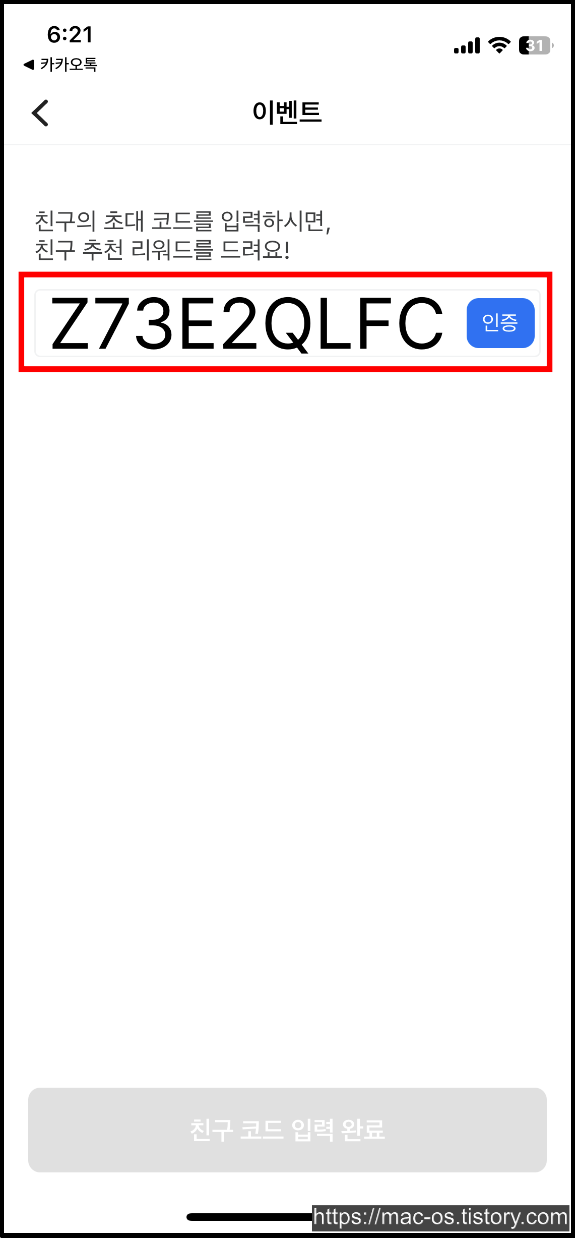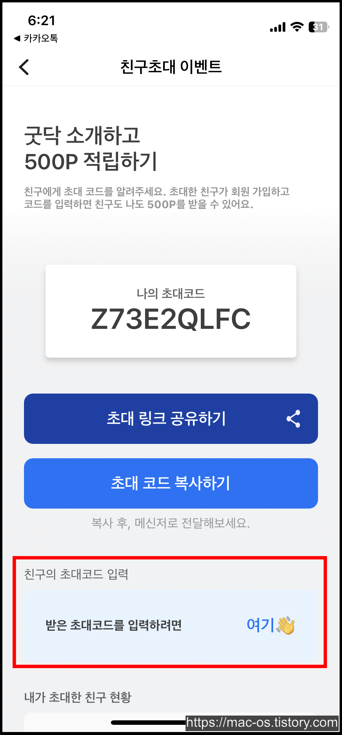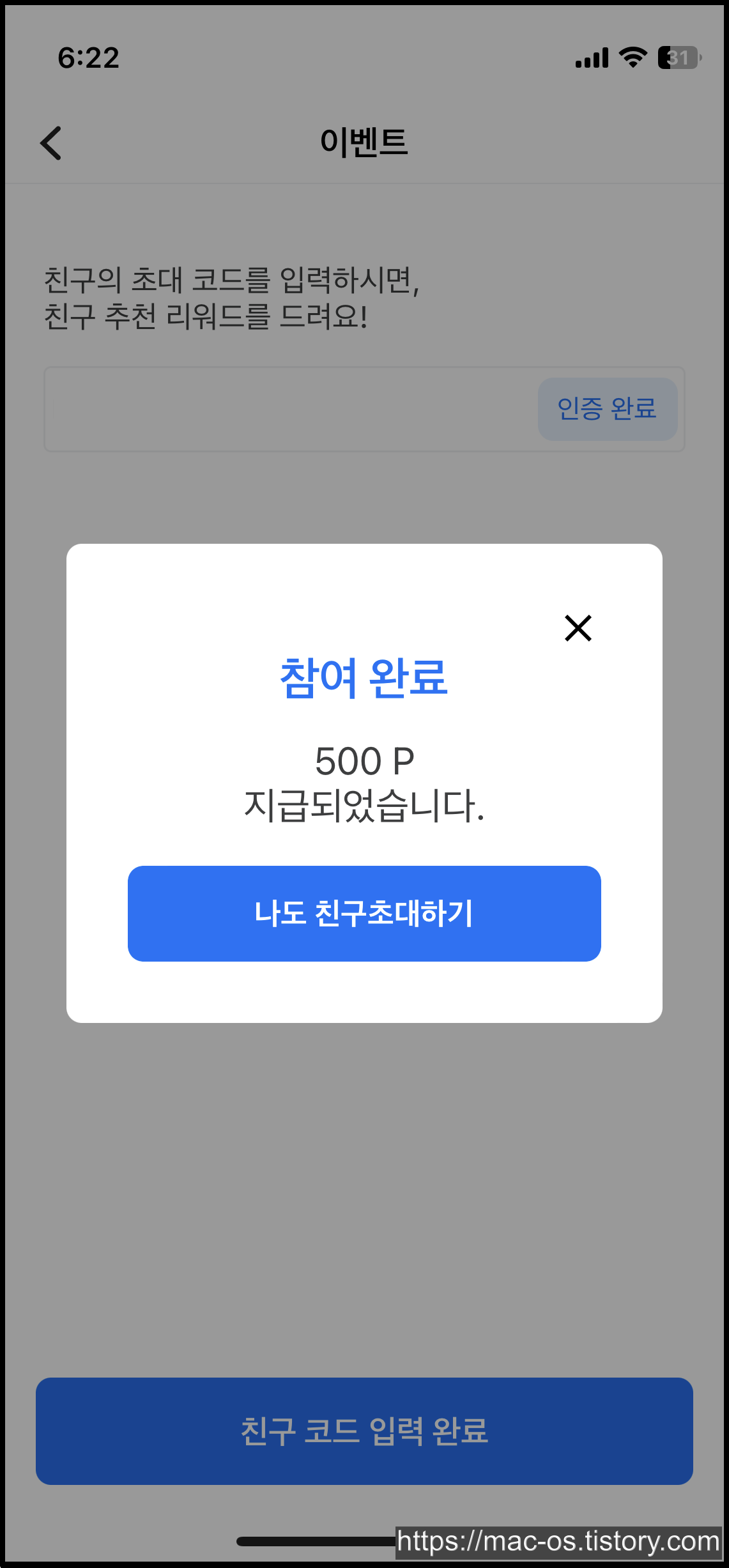 - 초대코드 입력란에 Z73E2QLFC를 복사하여 입력하면 입력한 사람도 500포인트 적립 가능