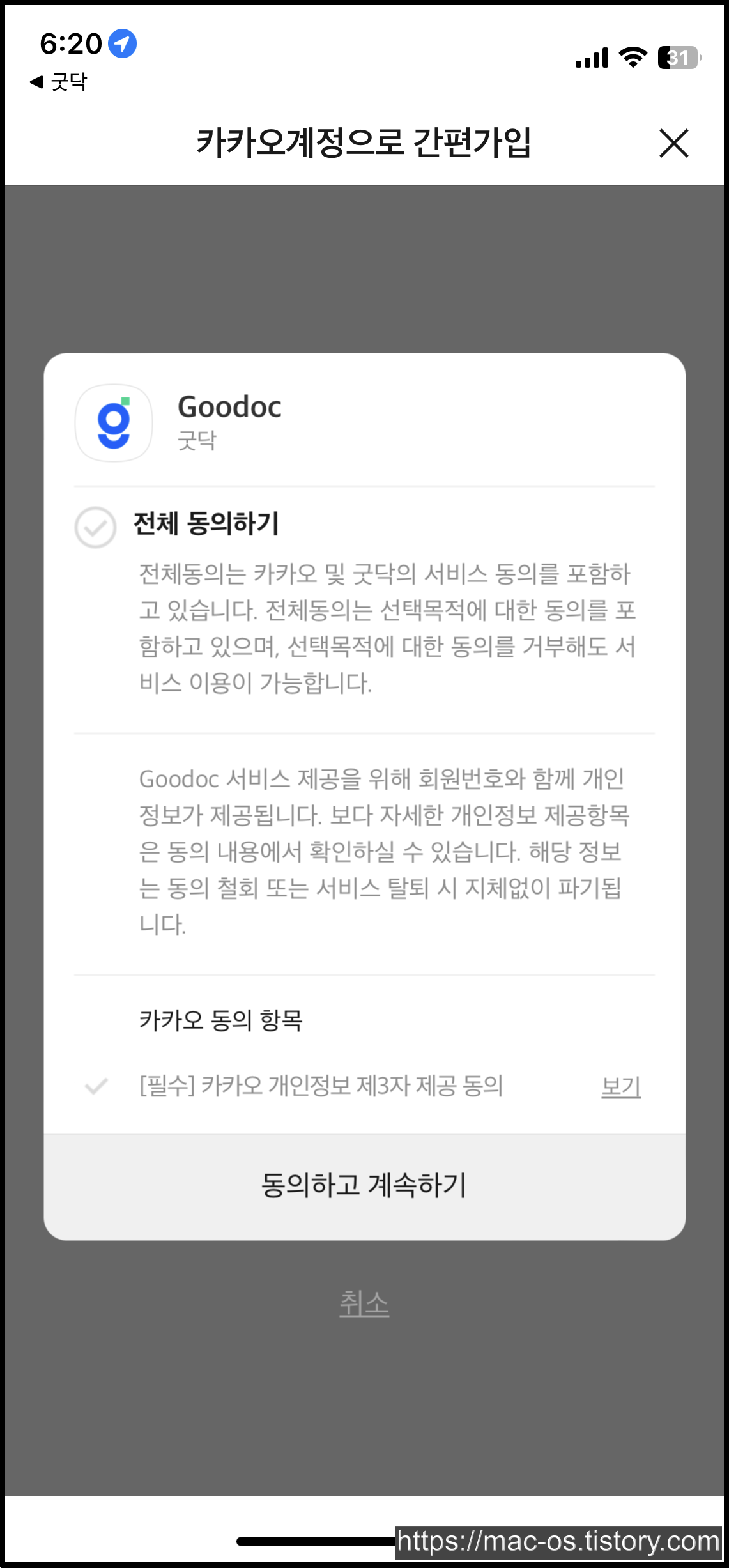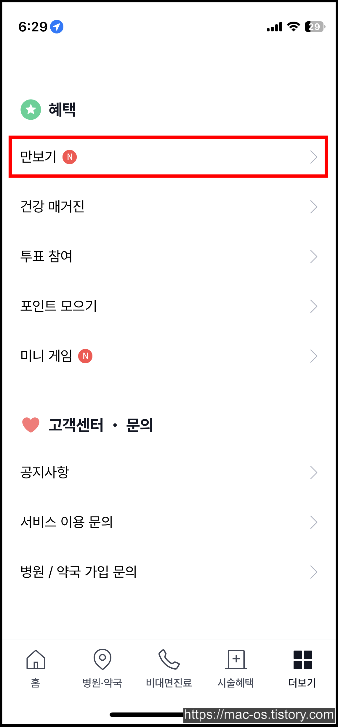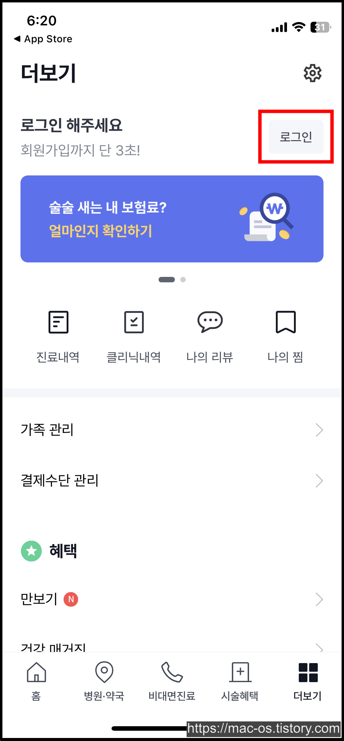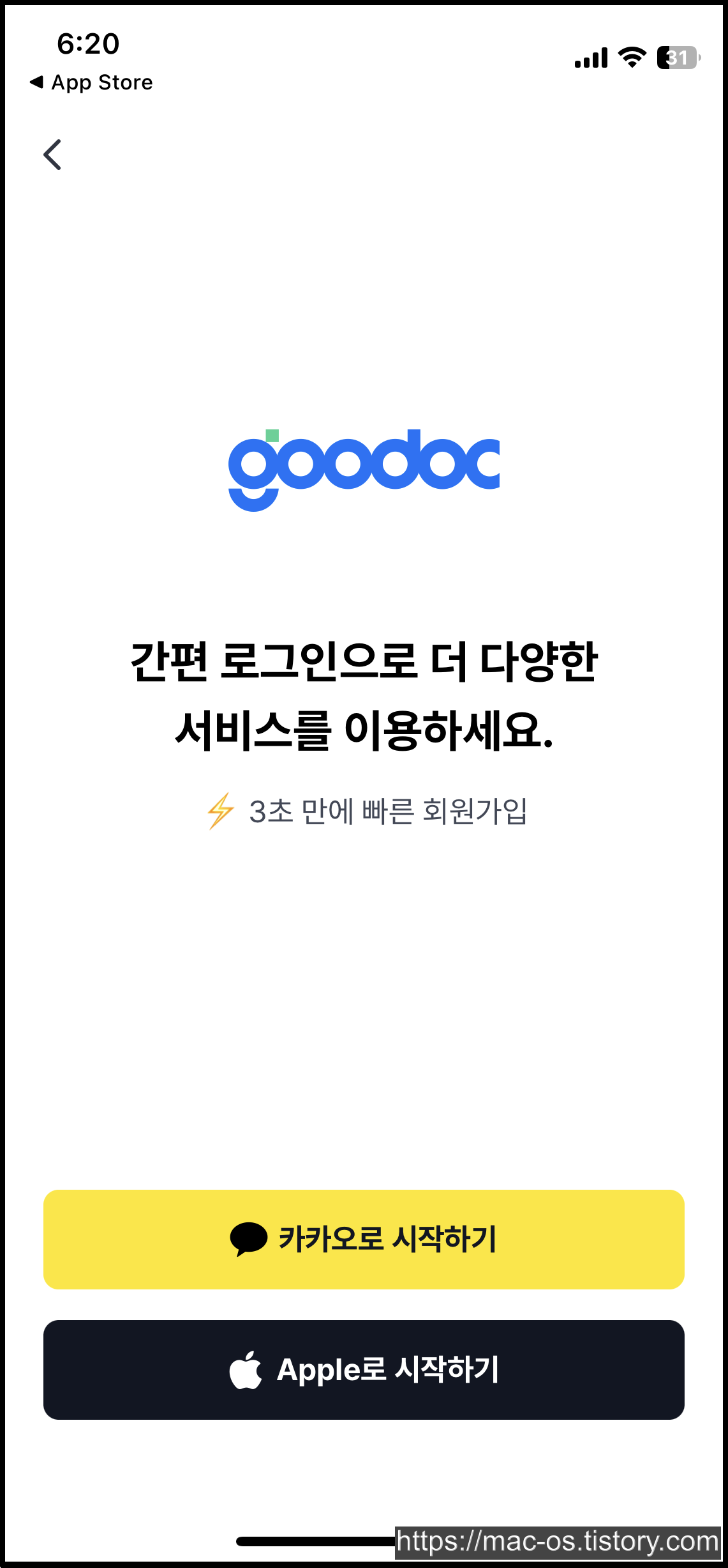 굿닥은 구글 플레이 스토어와 애플 앱스토어에서 설치할 수 있다. 앱 실행 후 [더보기] → [로그인]을 눌러 회원가입을 진행한다.