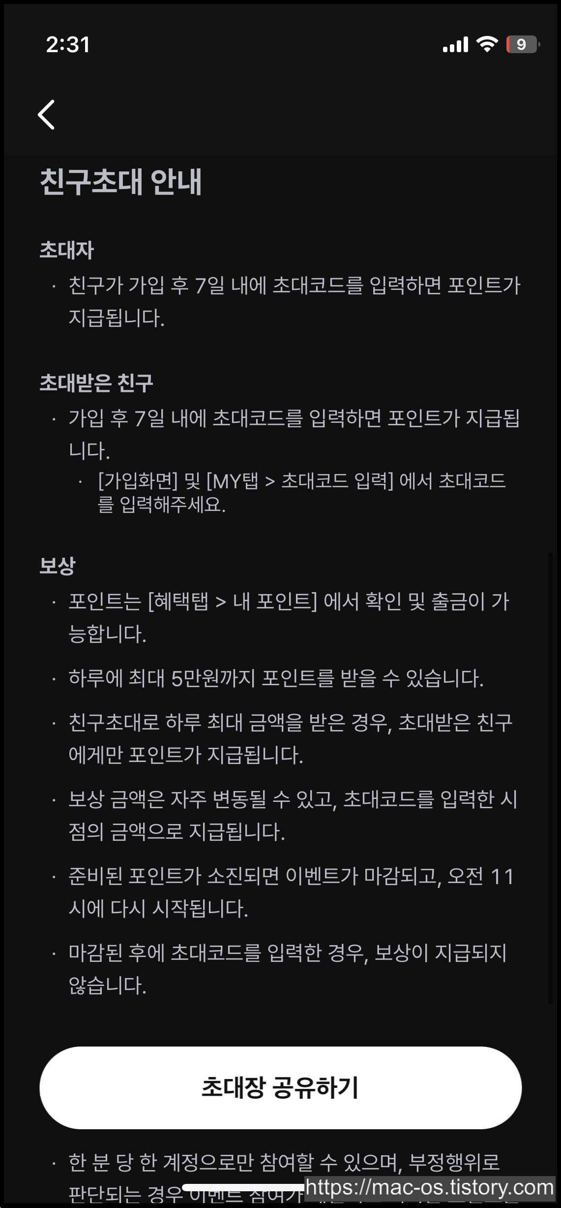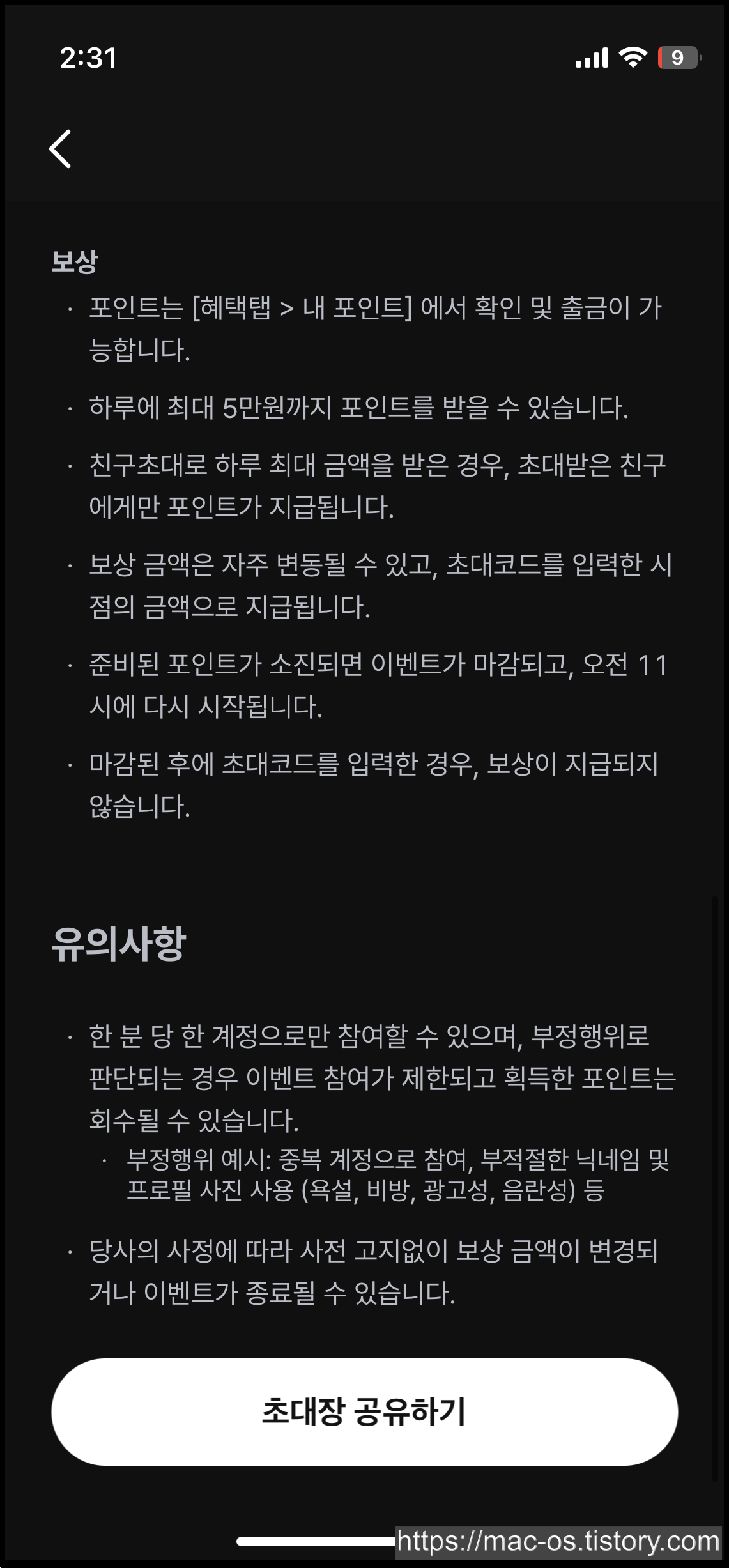 포인트는 하루에 최대 5만원까지 받을 수 있고, 친구초대로 하루 최대 금액을 받은 경우에는 초대받은 친구에게만 포인트가 지급됨. 보상 금액은 자주 변동될 수 있다고 함