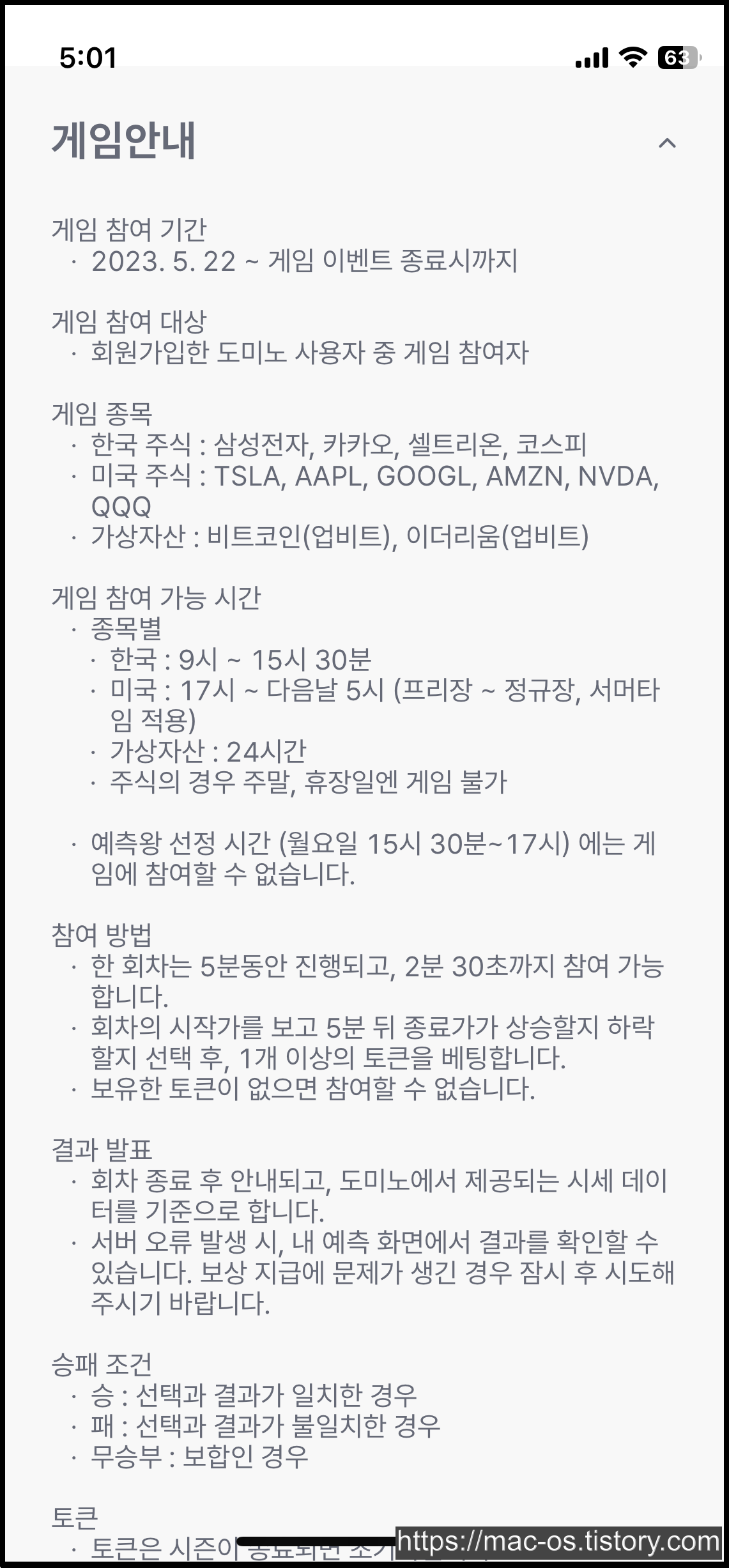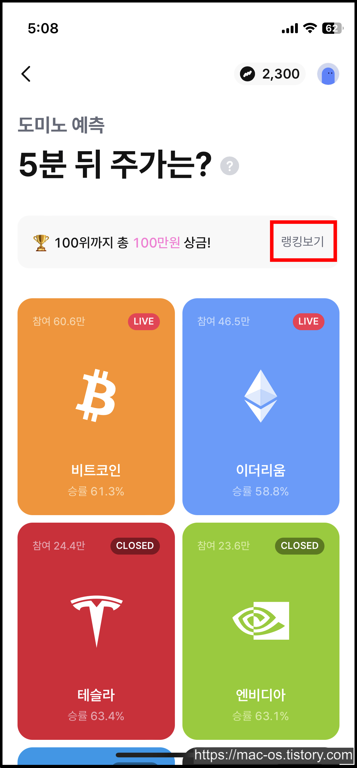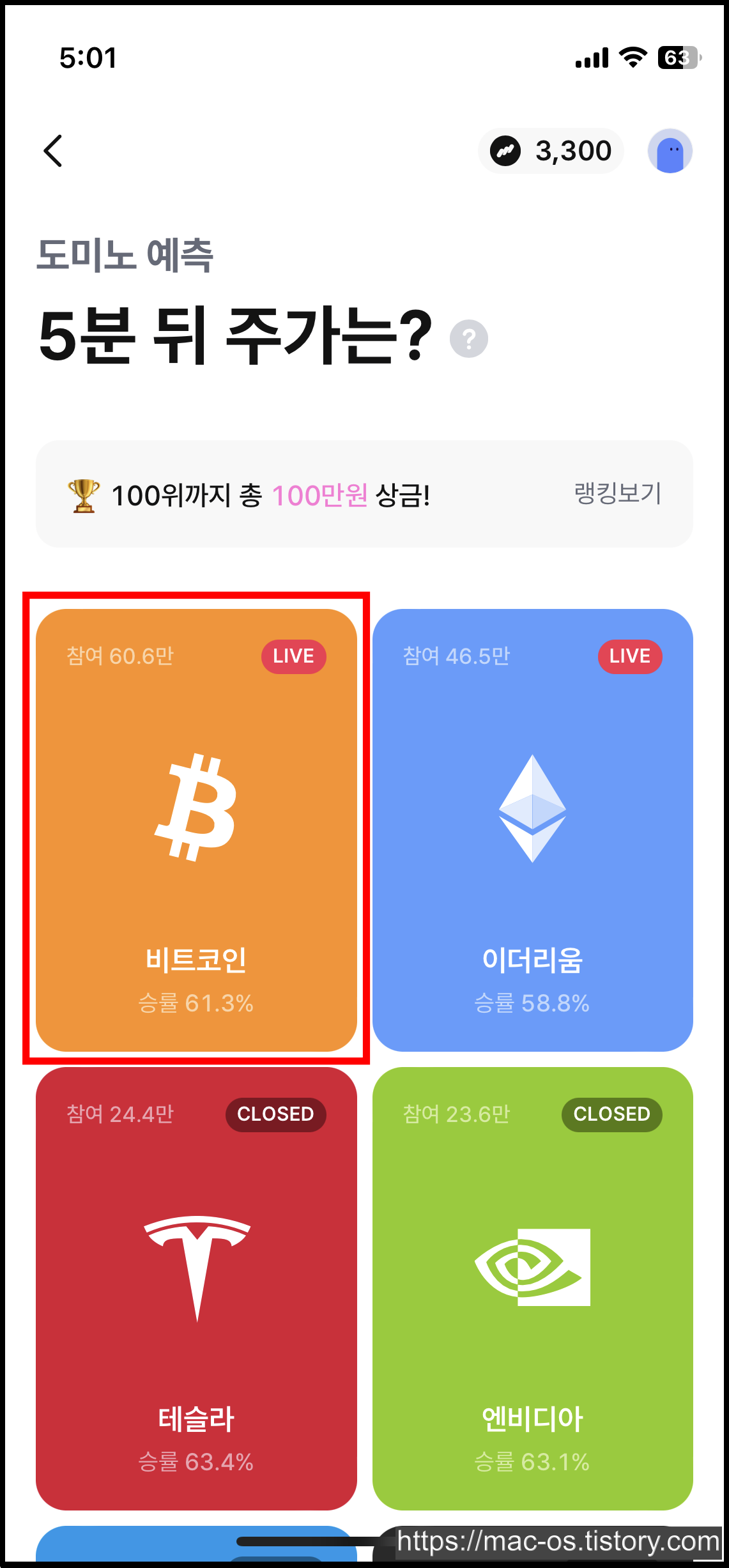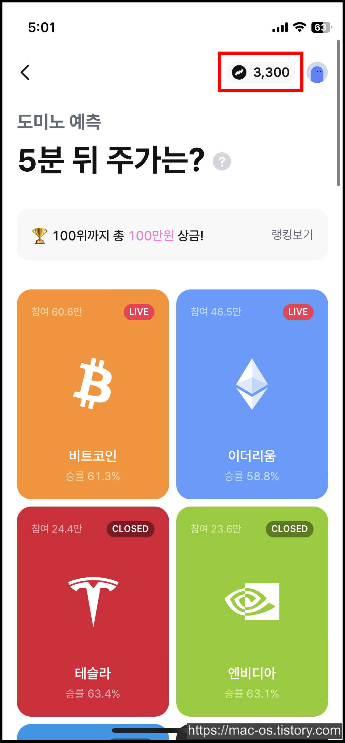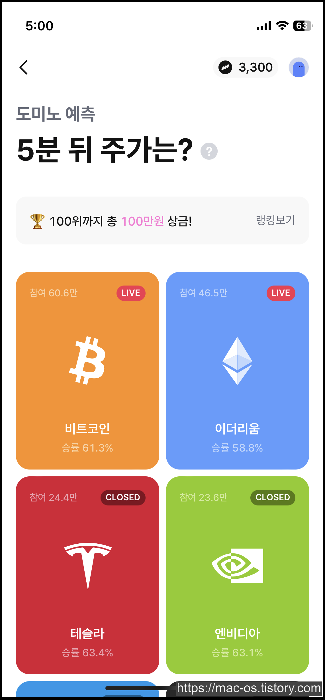 비트코인이나 이더리움, 테슬라, 엔비디아 등 가상화폐나 해외주식의 5분 뒤 주가가 상승할지 하락할지 예측하는 게임임. 주가를 예측할 때 토큰이라는 화폐를 사용하게 되며, 토큰을 많이 모은 순위에 따라 보상으로 포인트가 지급됨