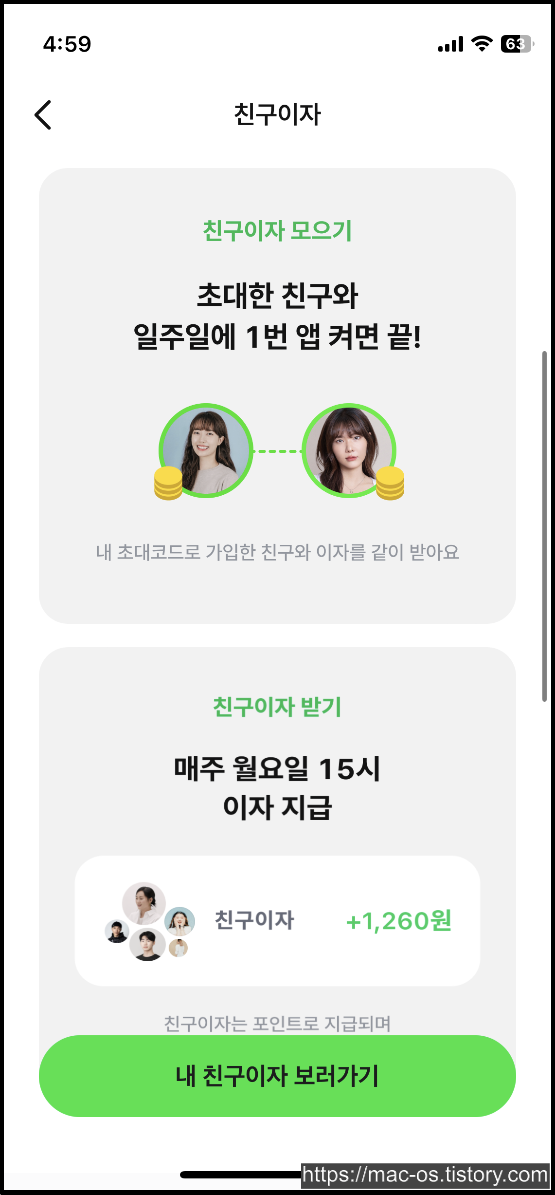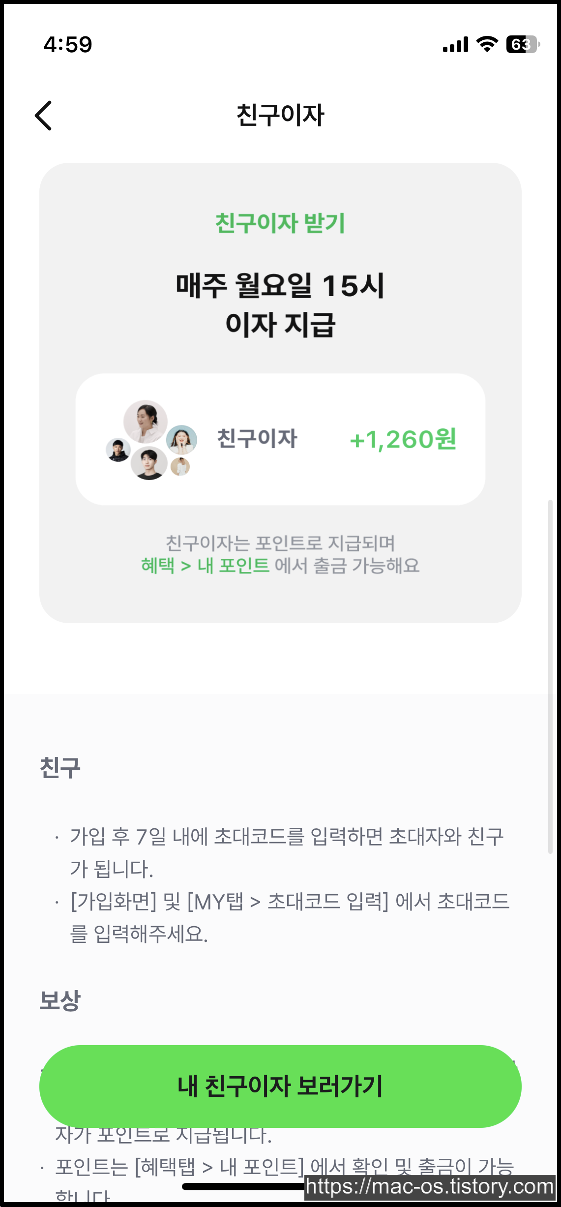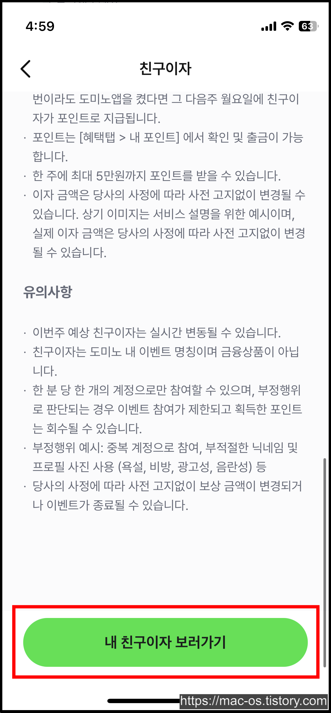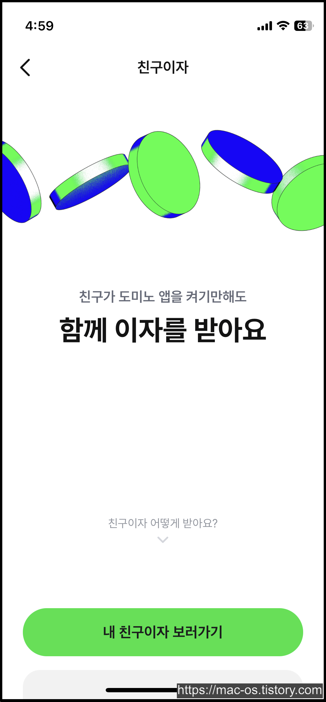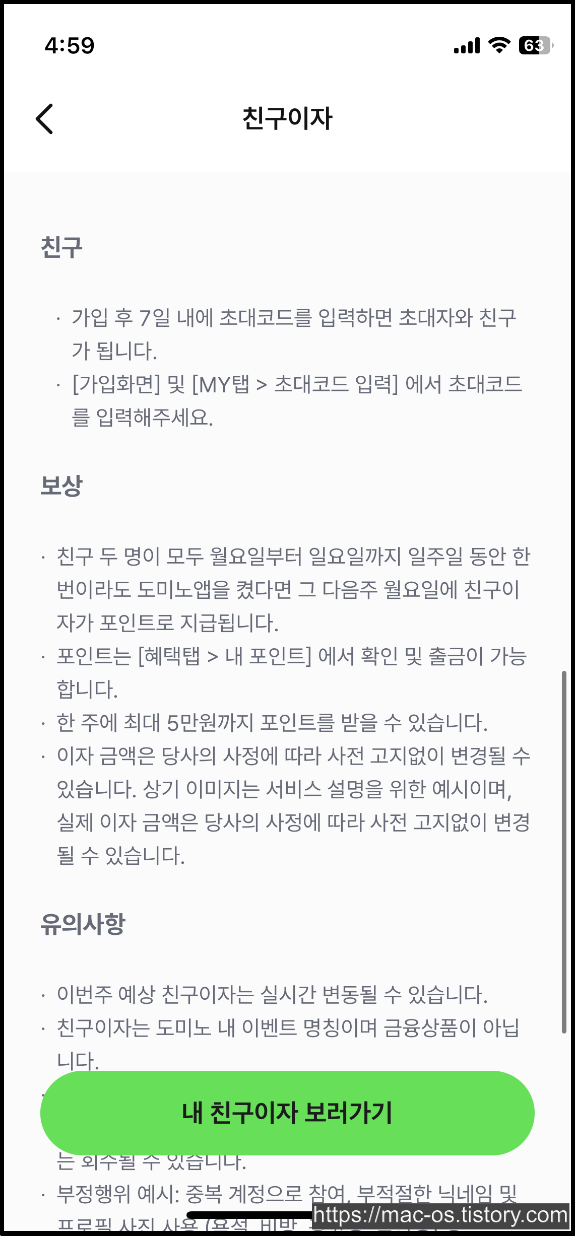 매주 월요일 15시 이자가 포인트로 지급된다는데.... 친구 두 명이 모두 월요일부터 일요일까지 일주일 동안 한 번이라도 도미노 앱을 켜면 그 다음주 월요일에 친구이자가 포인트로 지급됨.