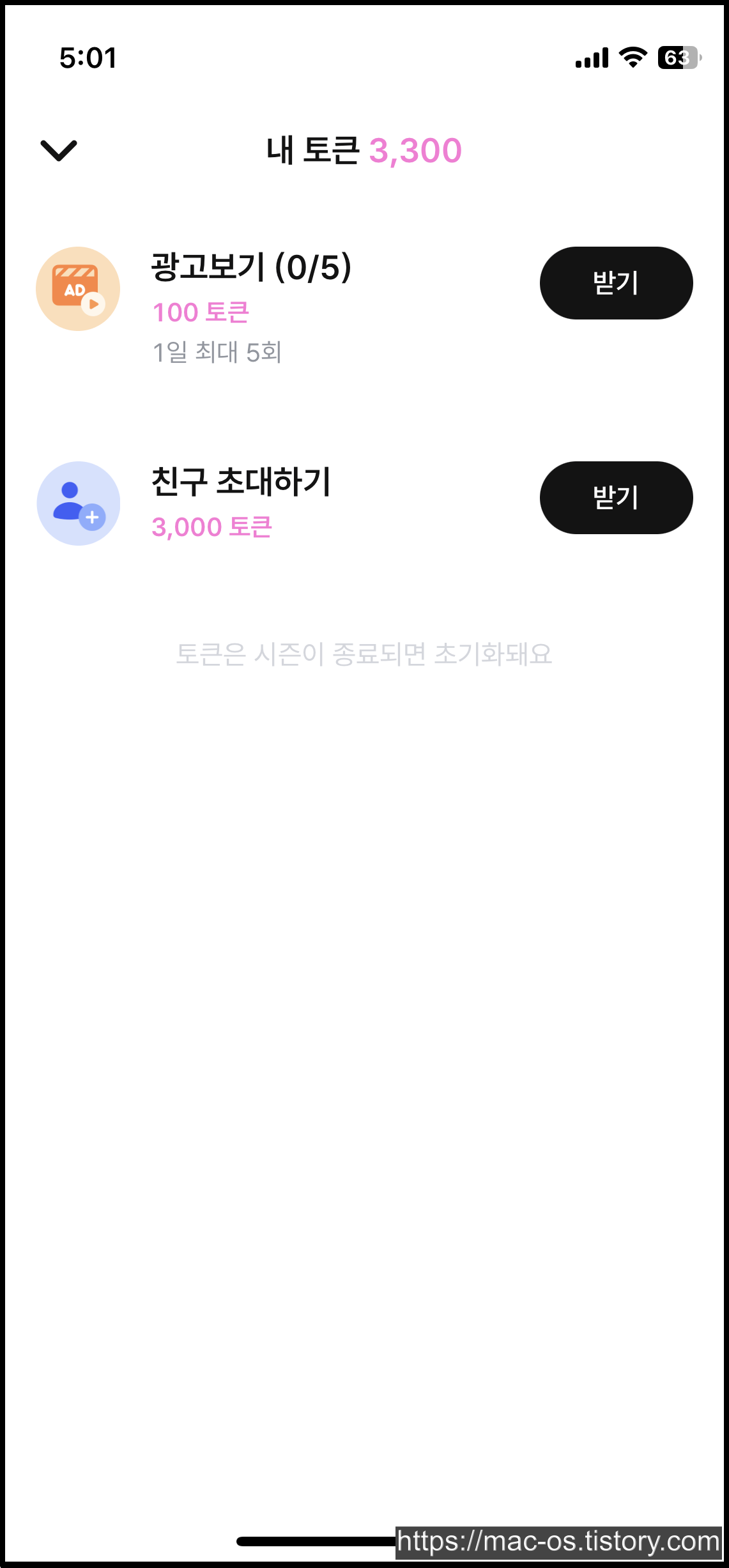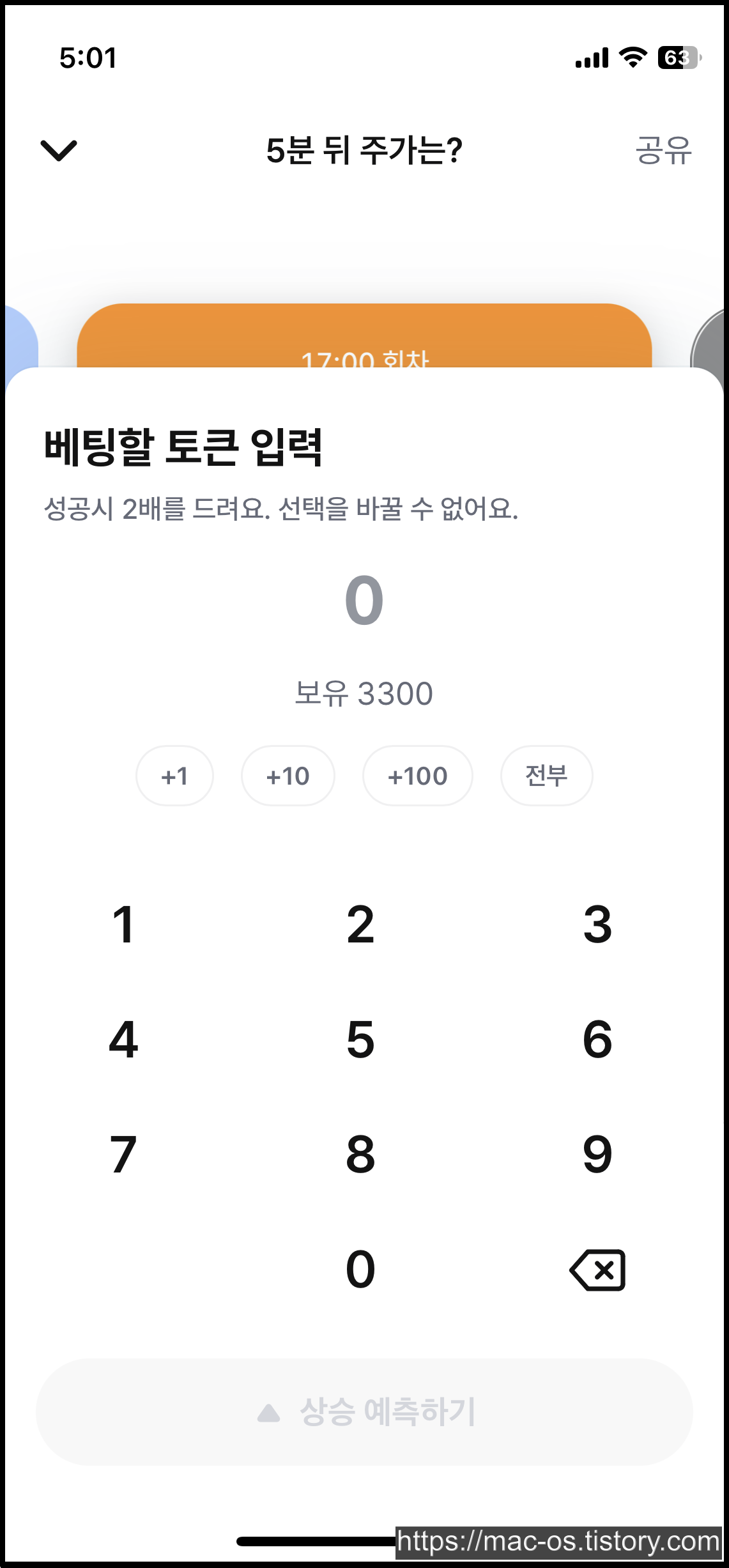토큰이라는 것은 현금으로 바꿀 수 없고 오직 예측 게임에서만 사용 가능한 화폐를 말함. 우측 상단의 토큰을 눌러보면 광고보기와 친구초대를 통해 토큰을 얻을 수 있음