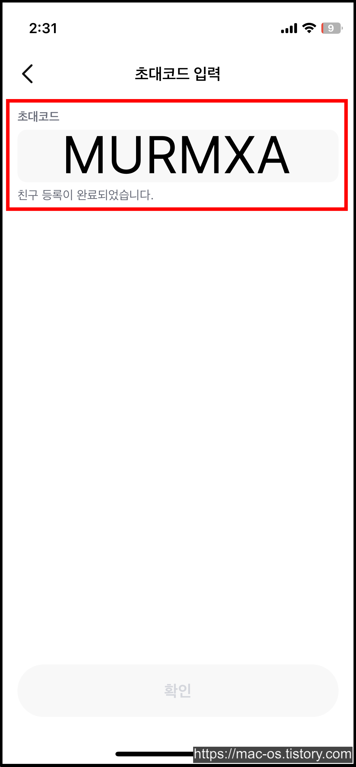초대코드를 비워둔 채로 입력한 사람은 [MY]에서 [초대코드 입력]으로 이동하여 초대코드를 입력할 수 있음.