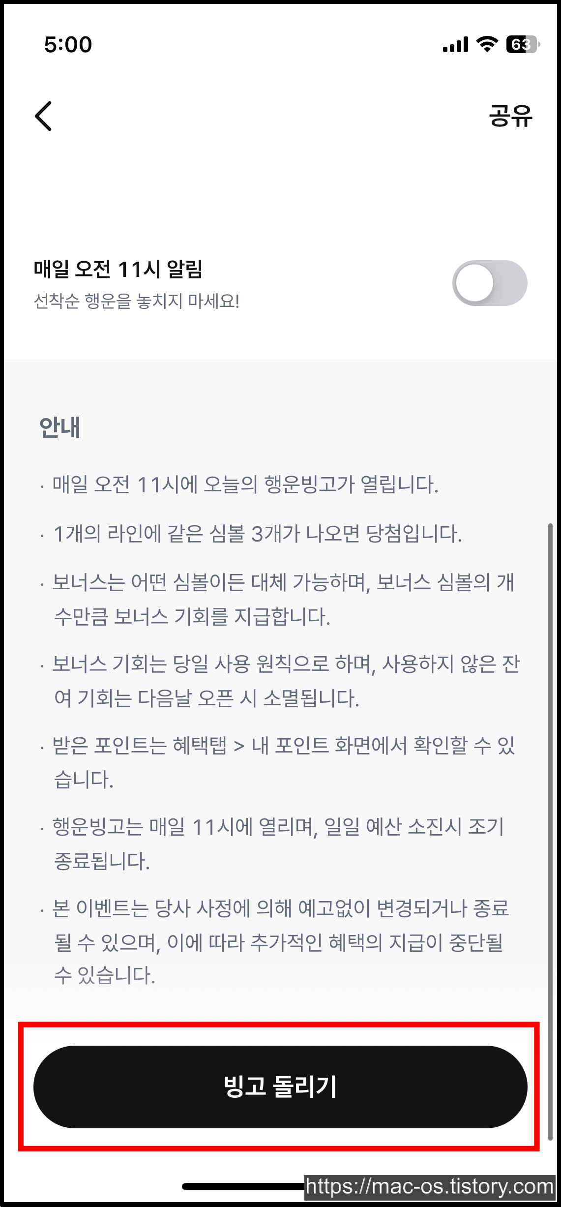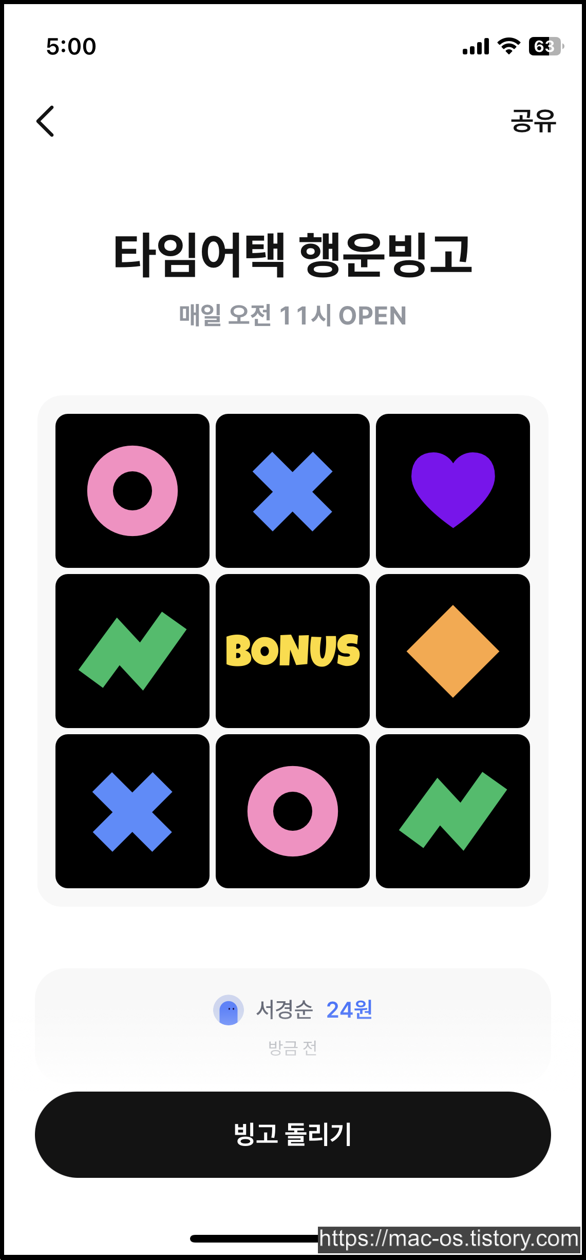 매일 오전 11시에 열리는 빙고인데, 빙고 돌리기를 누르면 됨