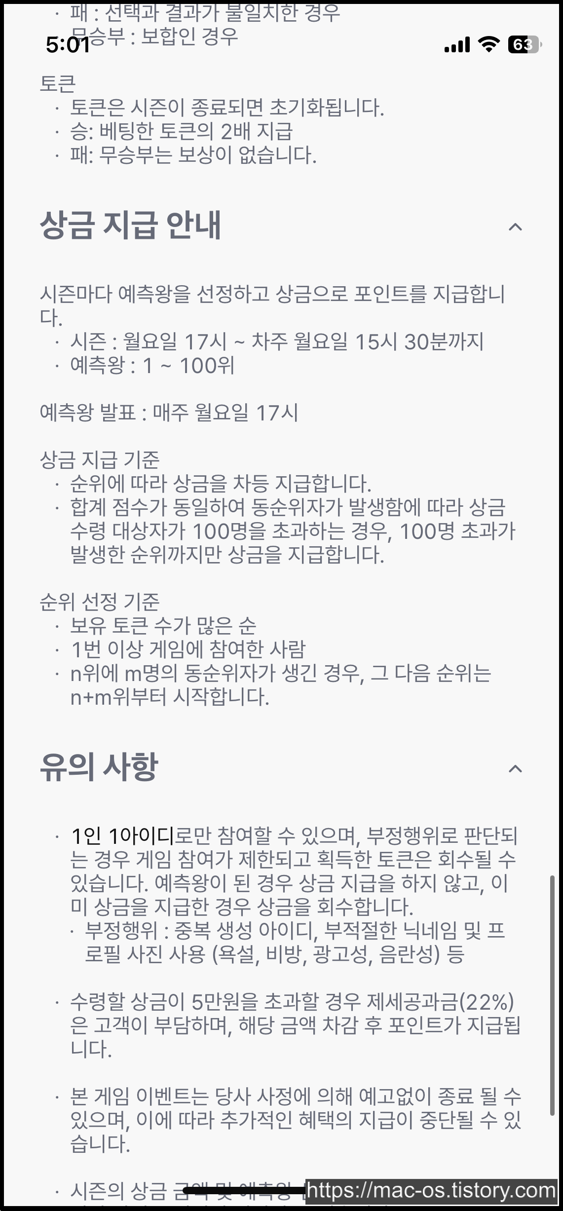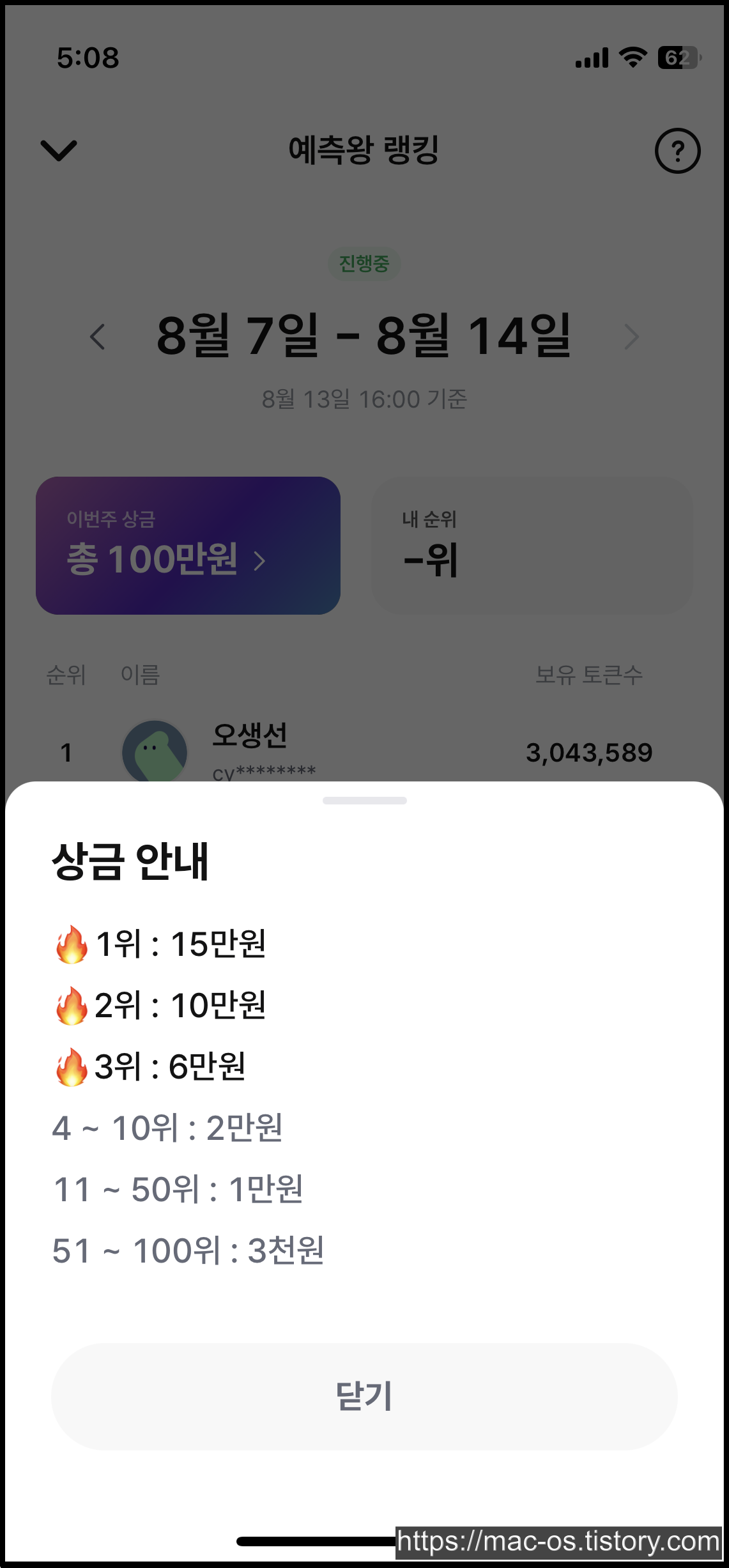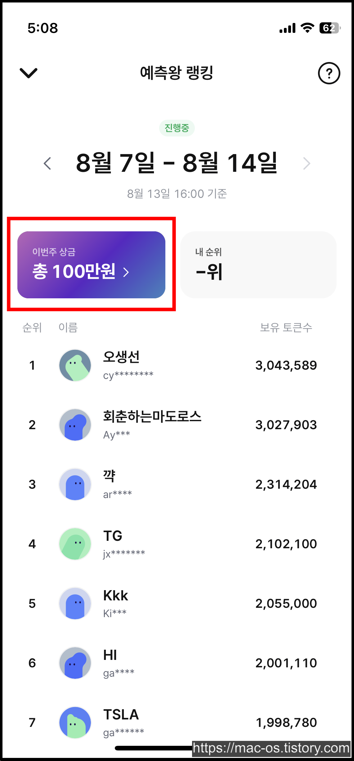 예측에 성공해서 토큰을 많이 모으면 뭐가 좋나? 바로 돈을 받을 수 있다. 1주마다 예측왕 랭킹이라는 것이 있는데 주마다 총 100만원 상금을 준다고 한다.