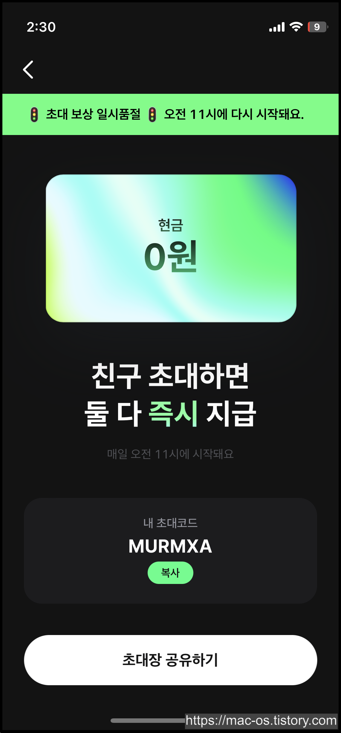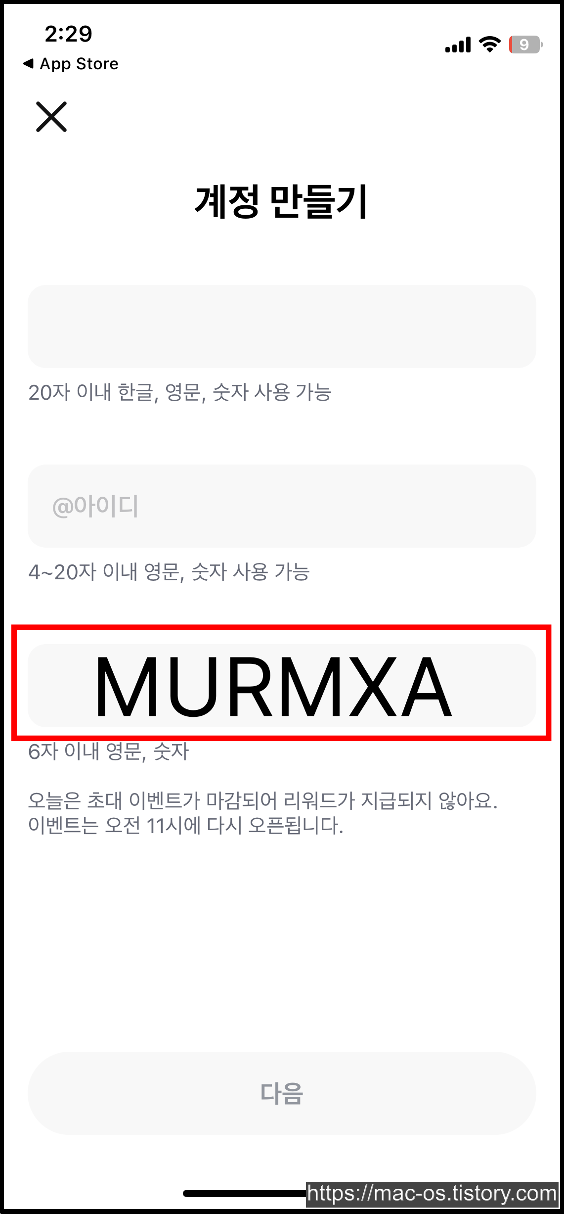 초대코드는 MURMXA를 복사해서 입력하면 1000원을 받을 수 있는데, 오전 11시부터 선착순이라 오전 11시에 입력하거나 시간이 늦었다면 비워둔 채로 놔두고 다음 날 입력하는걸 추천함