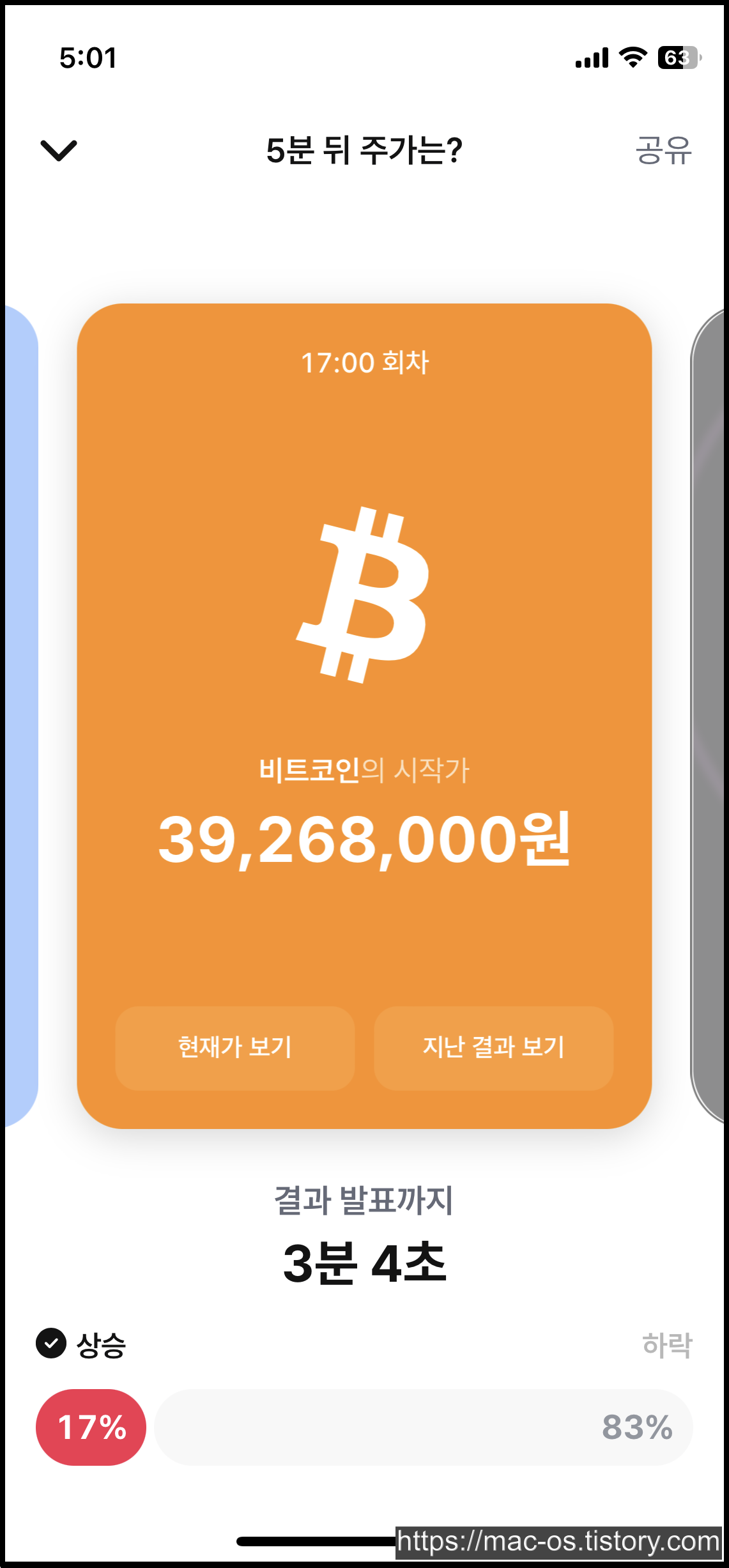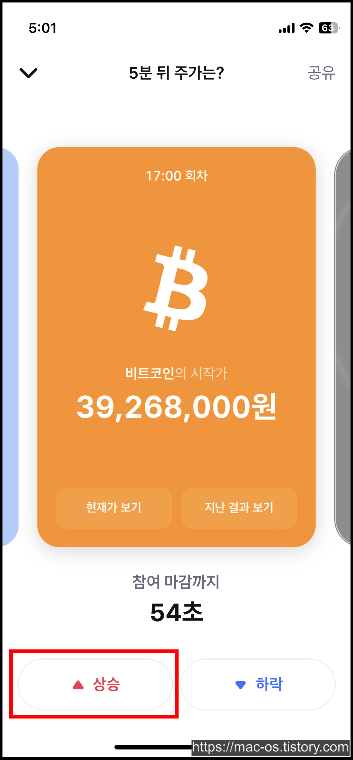 시험삼아 예측게임을 해봤다. 비트코인을 눌러서 상승할지 하락할지 선택한다.