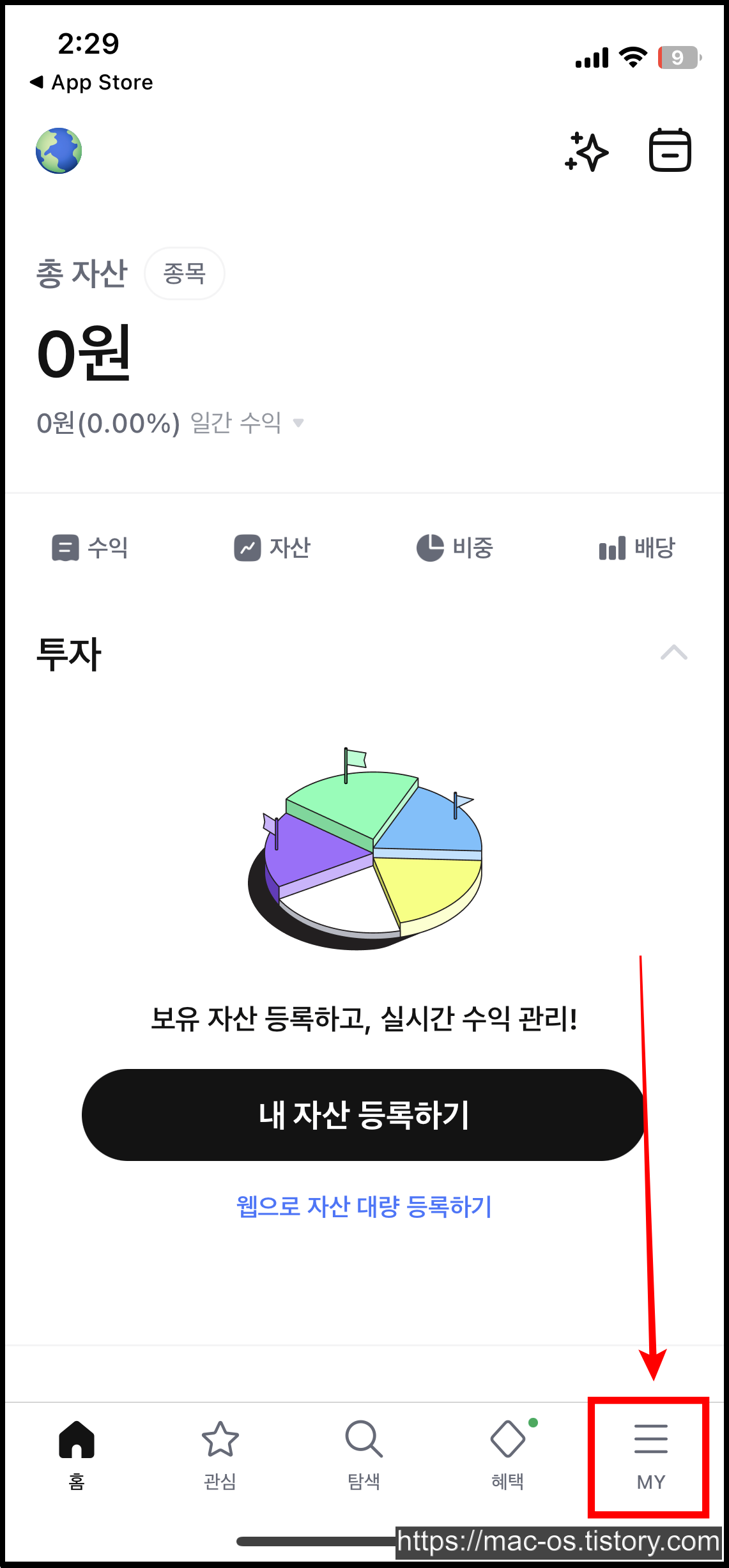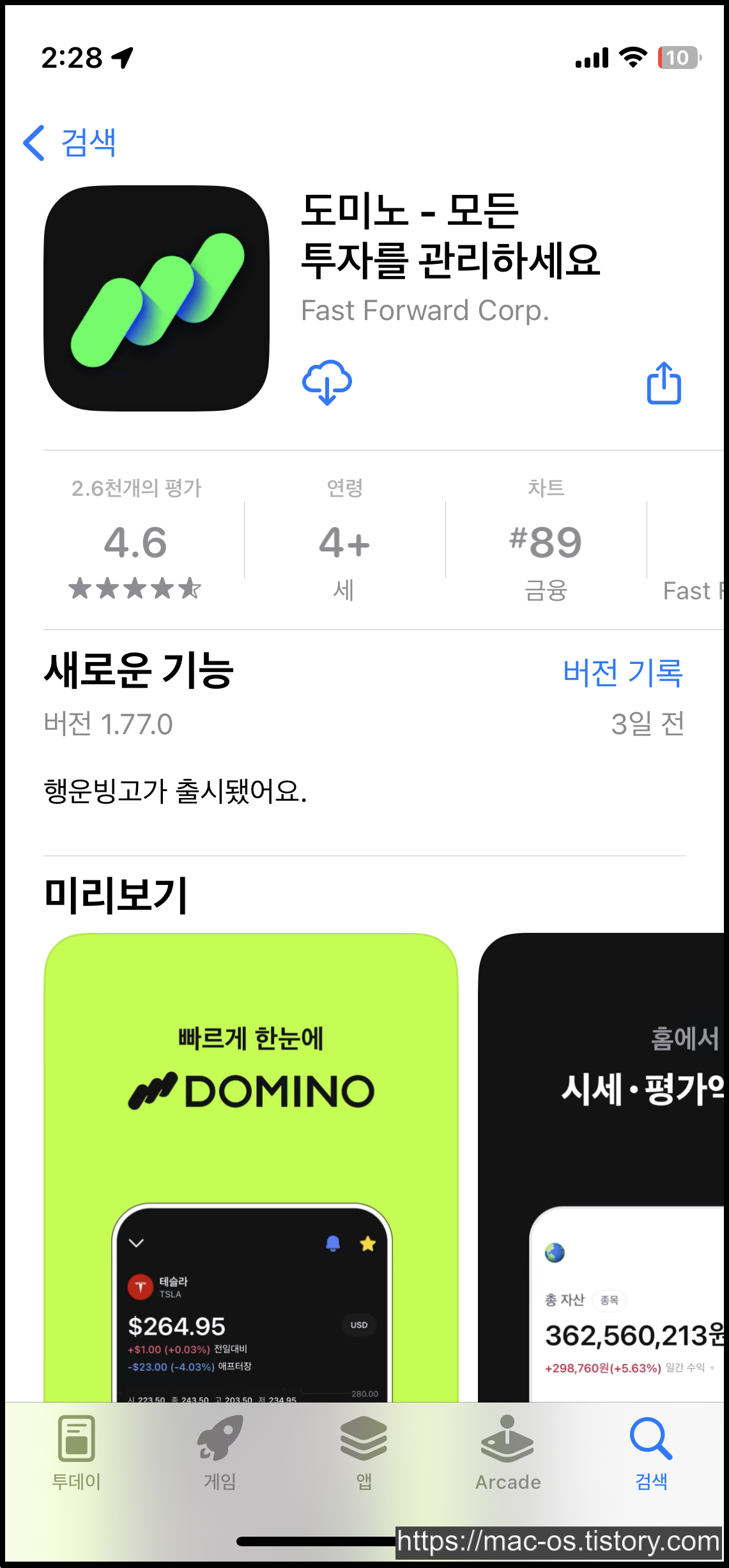 도미노는 구글 Play 스토어와 애플 App store에서 설치할 수 있음. 앱 설치 후 우측 하단 [MY]를 터치