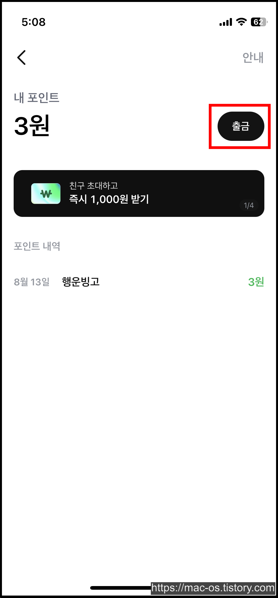 친구초대, 친구이자, 행운빙고를 통해 얻은 포인트는 [내 포인트] > [출금]으로 이동해 본인 계좌로 출금할 수 있음