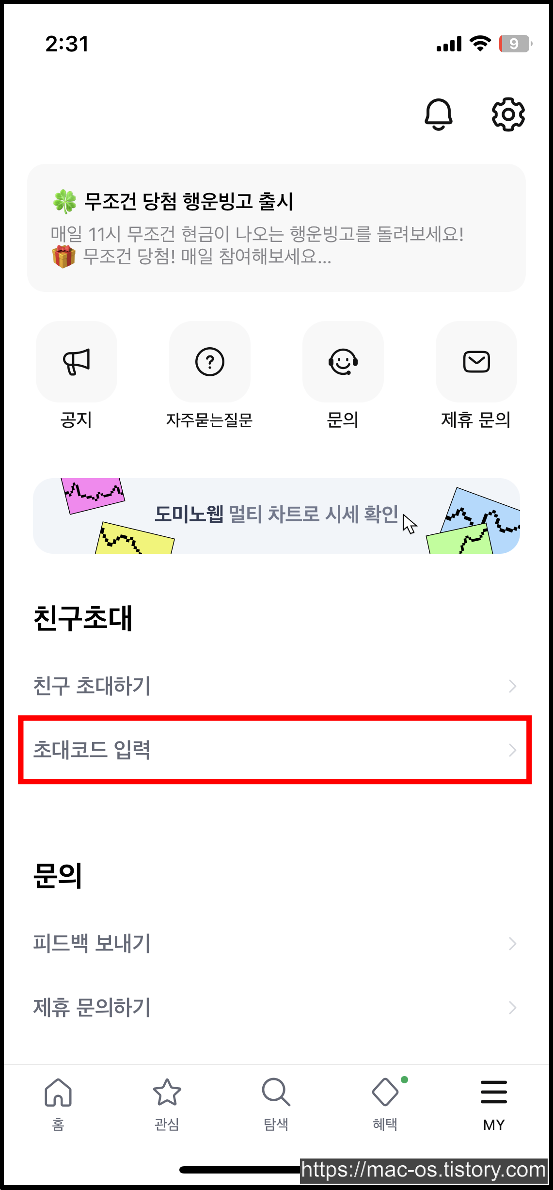 - 도미노 회원가입 과정에서 초대코드 MURMXA 입력