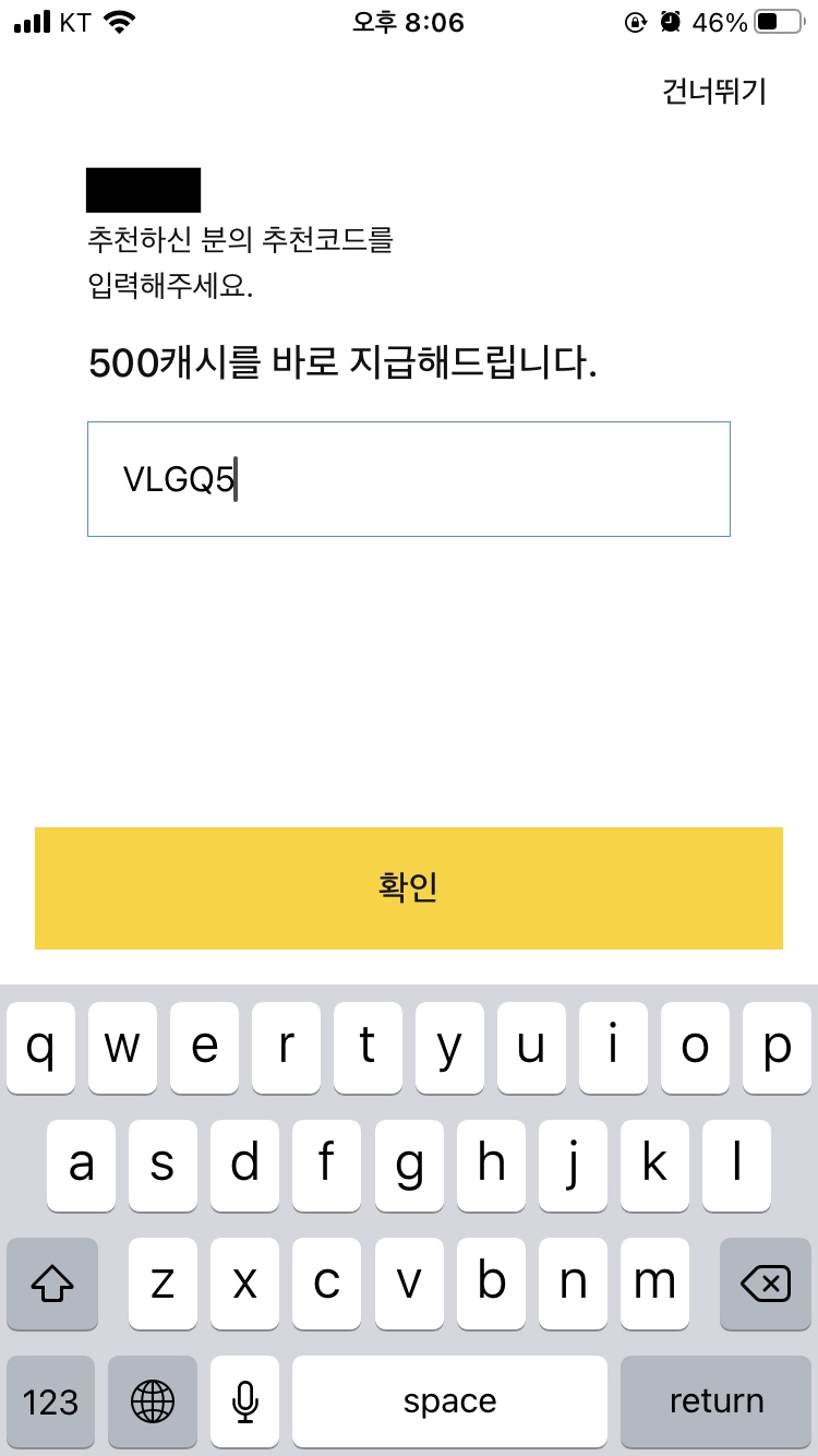 카카오 및 Apple, Google 계정으로 로그인하시고 나면 추천코드를 입력하라는 페이지가 등장하게 됩니다. 해당 입력 란에 "VLGQ5"를 입력하시면 500캐시가 지급됩니다.