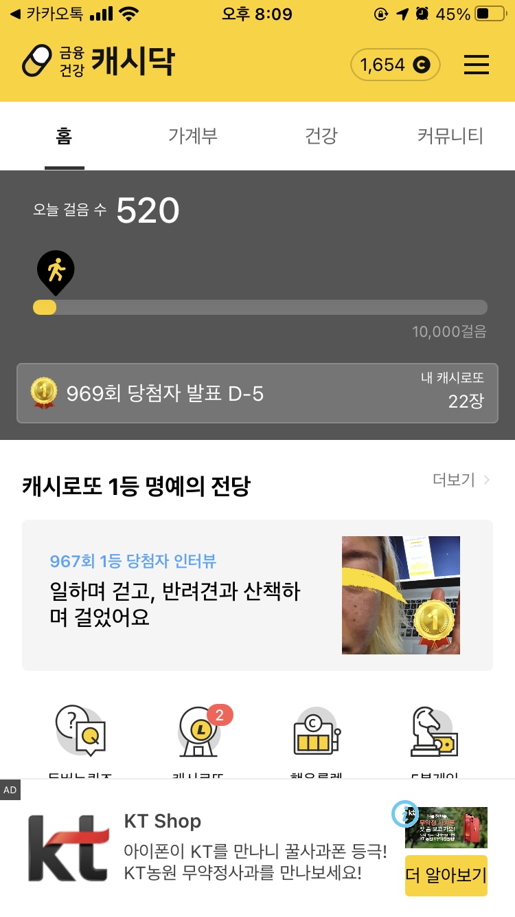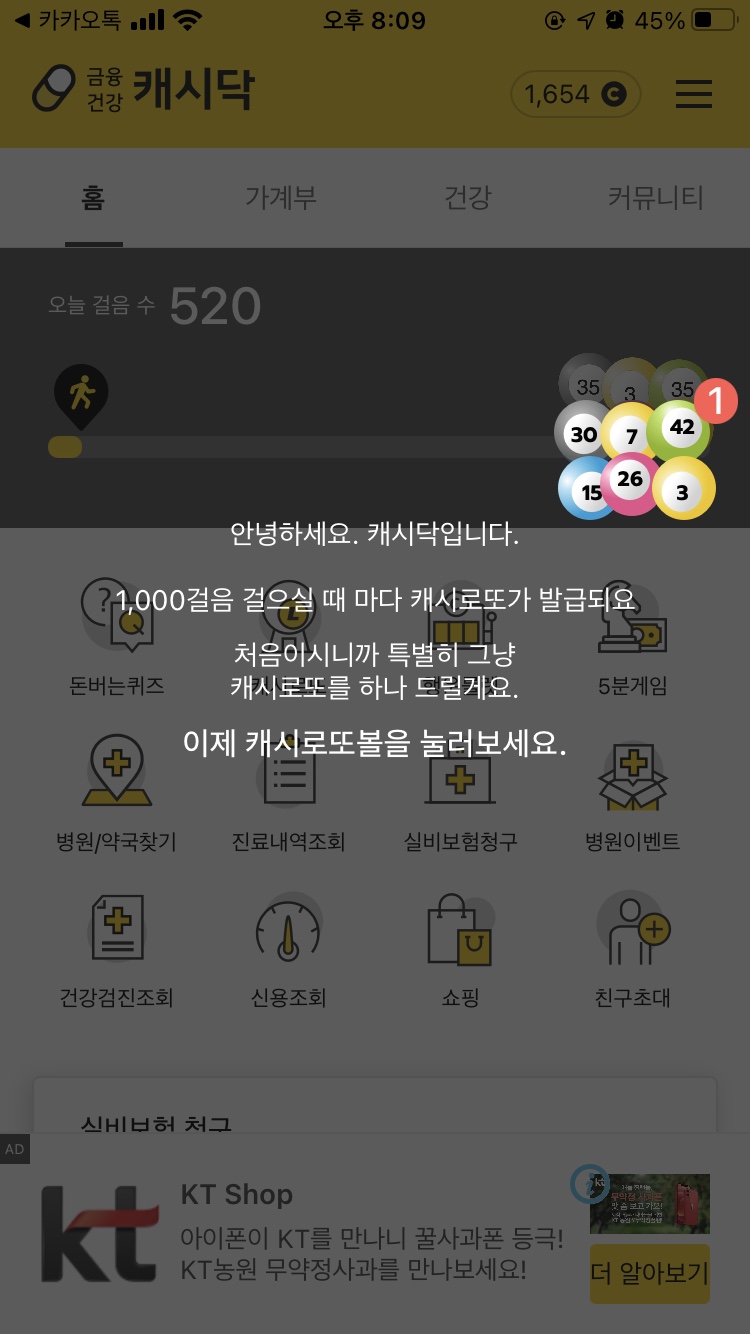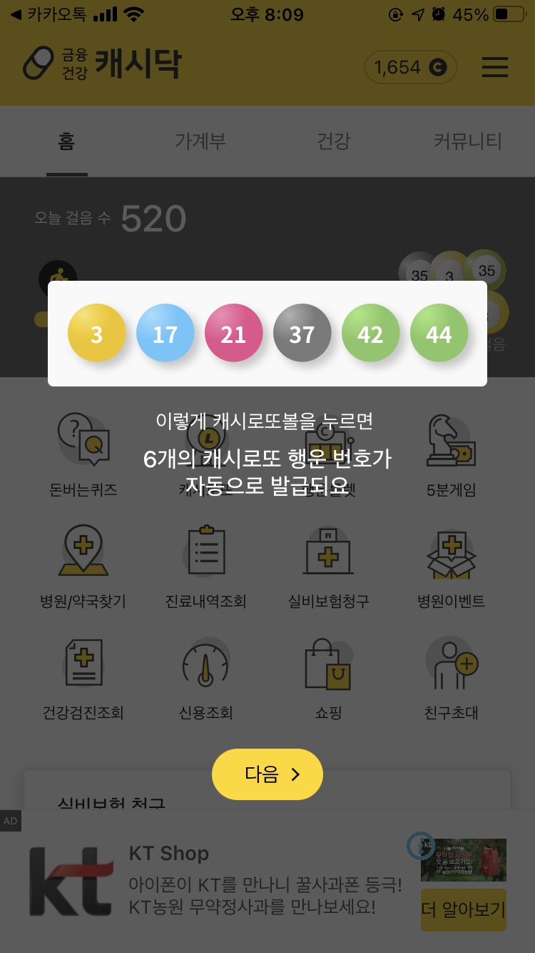 - [중요] 1,000보를 걸었다해서 자동으로 로또가 발급되는 것이 아니라, 앱 화면에서 캐시로또볼을 터치해야 발급된다.