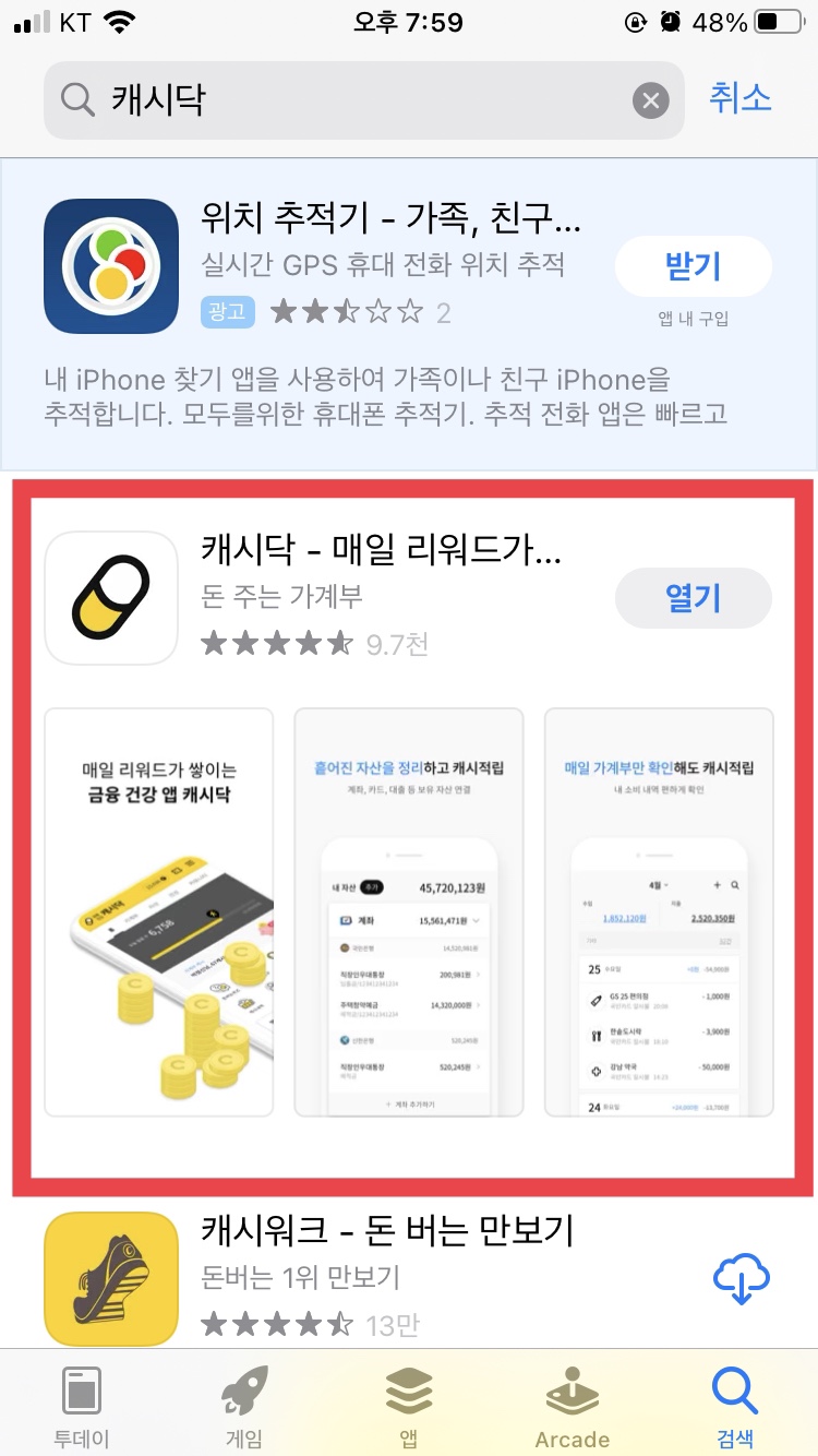 앱스토어에서 캐시닥을 검색하고 앱을 설치합니다. 그리고 앱 실행 이후 권한을 허용해줍니다.