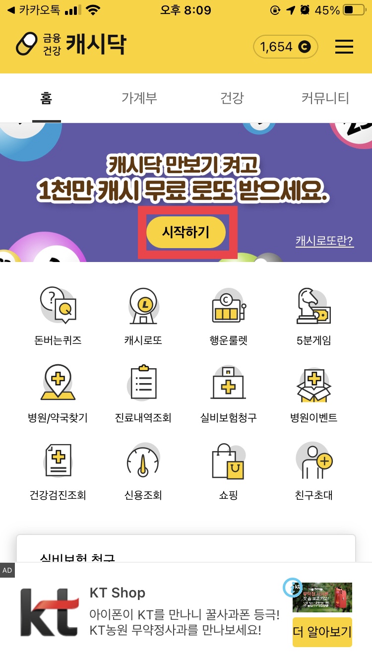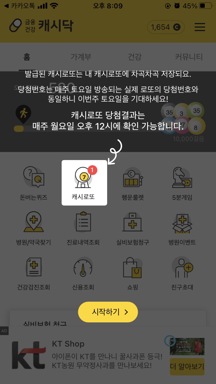 캐시닥 회원가입 후 홈 화면에서 '시작하기'를 누르시면 무료 로또와 관련된 사항을 확인하실 수 있습니다.