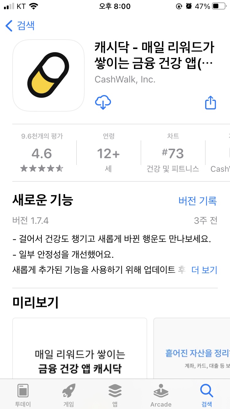 안녕하세요. 이번에는 캐시닥이라는 앱에 대해 소개해드리겠습니다. 캐시닥은 1000보 걸을 때마다 무료로 로또를 1개 지급해주는 앱입니다.
