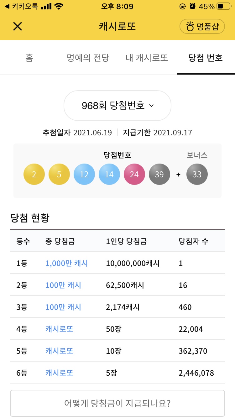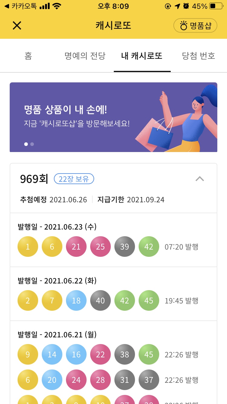 홈 화면에서 '969회 당첨자 발표 D-5 ... 내 캐시로또 22장'이 보이시나요? 여기서 '내 캐시로또 22장' 이 부분을 터치하시면 내 캐시로또 번호를 확인할 수 있습니다.