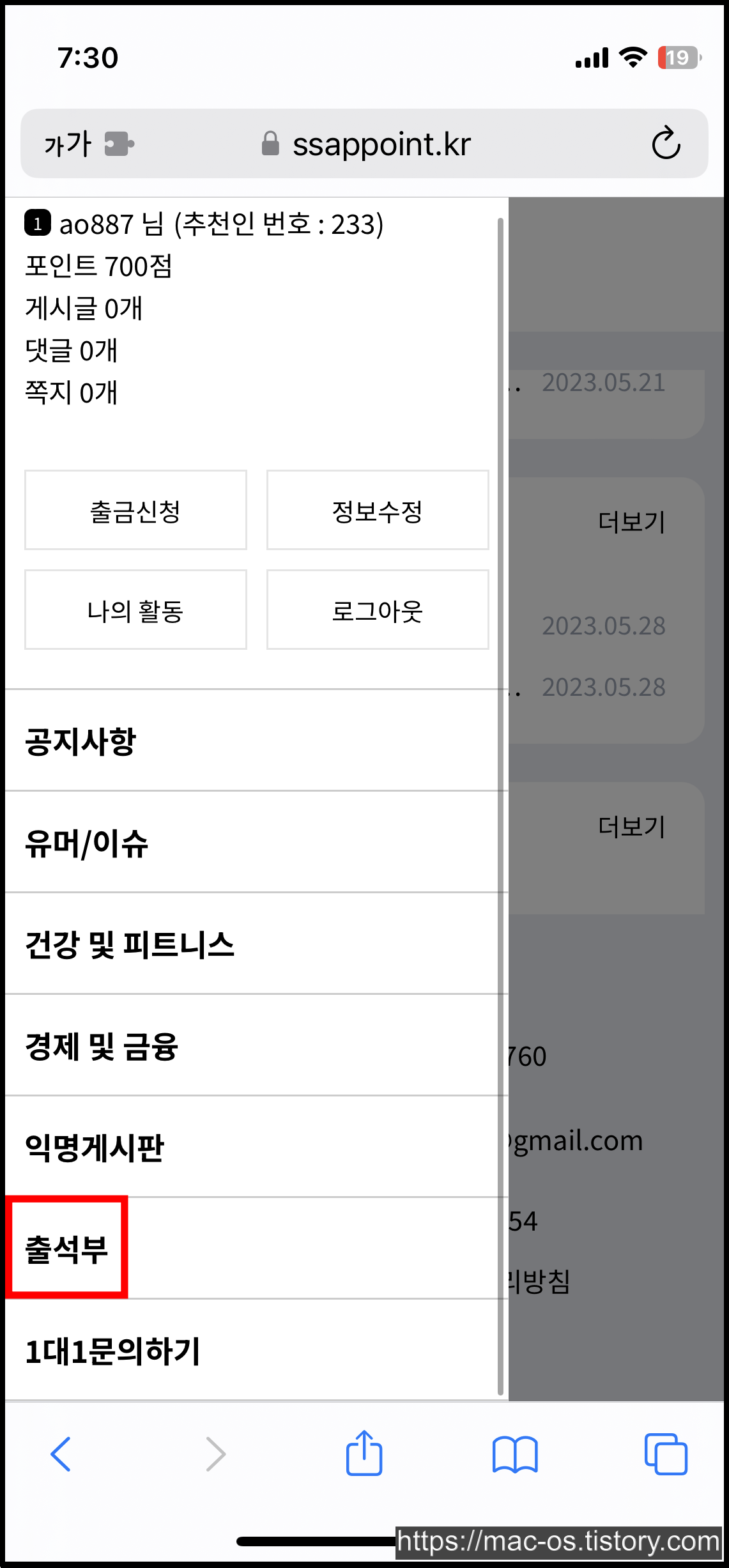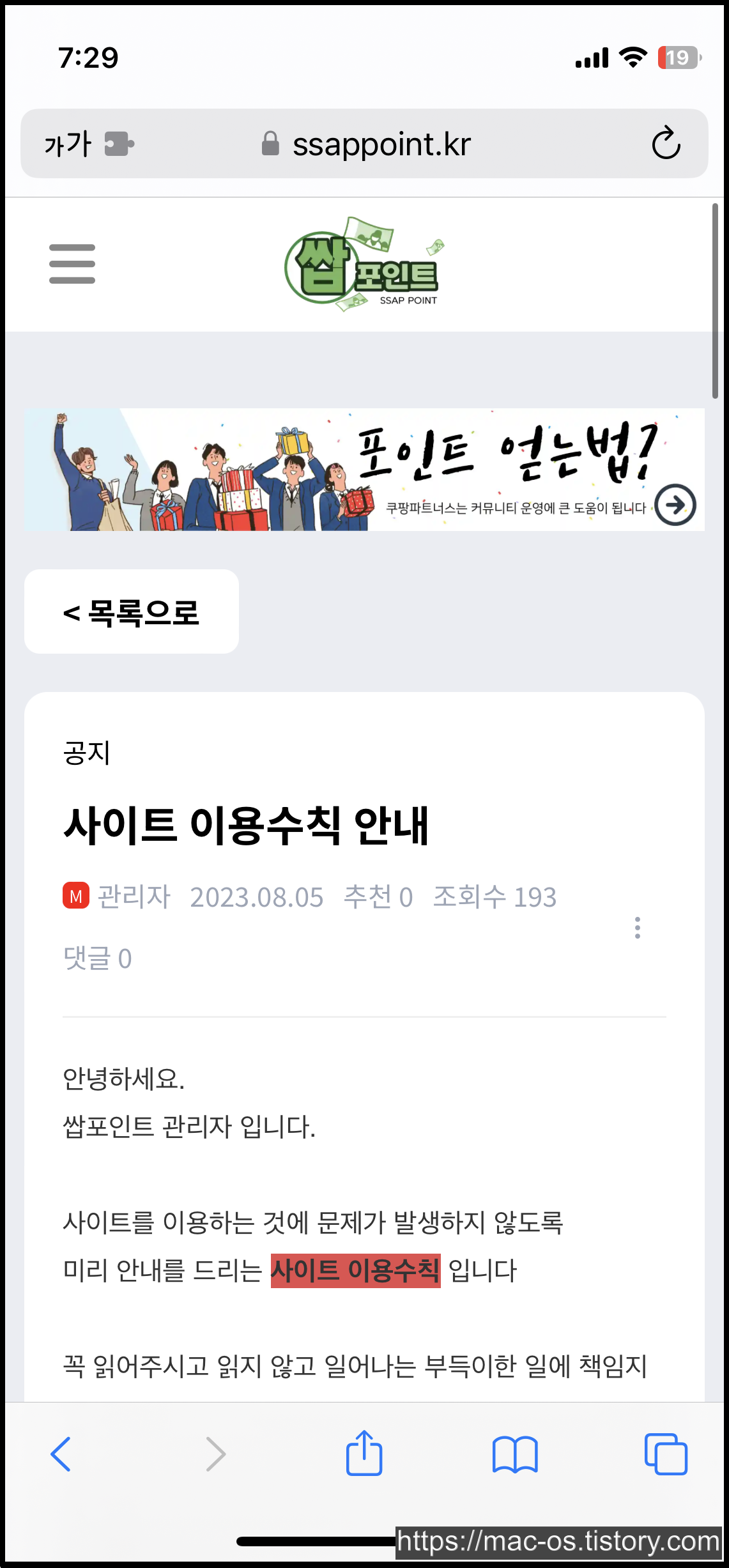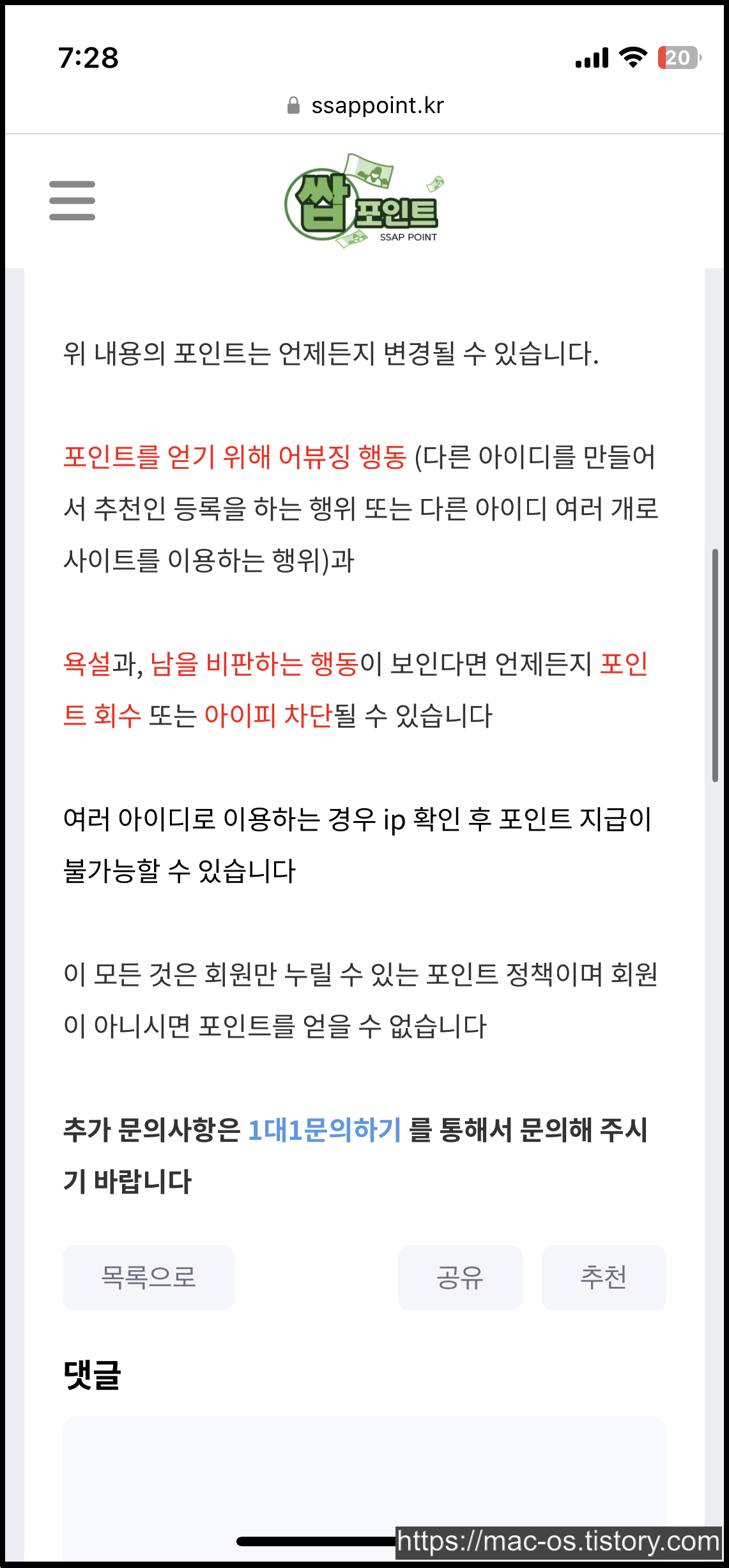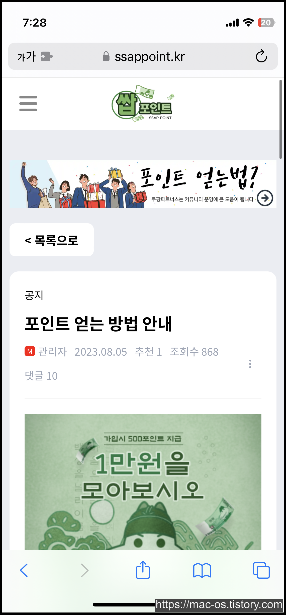 출석 포인트와 게시글 광고 클릭 포인트가 기존에는 각각 20P, 10P 였는데 40P, 30P로 상향되었고, 출금 포인트 가능 금액도 1만 포인트에서 5천 포인트로 하향되었다. 출금 가능 금액은 조금 있다가 변경된다고 한다.