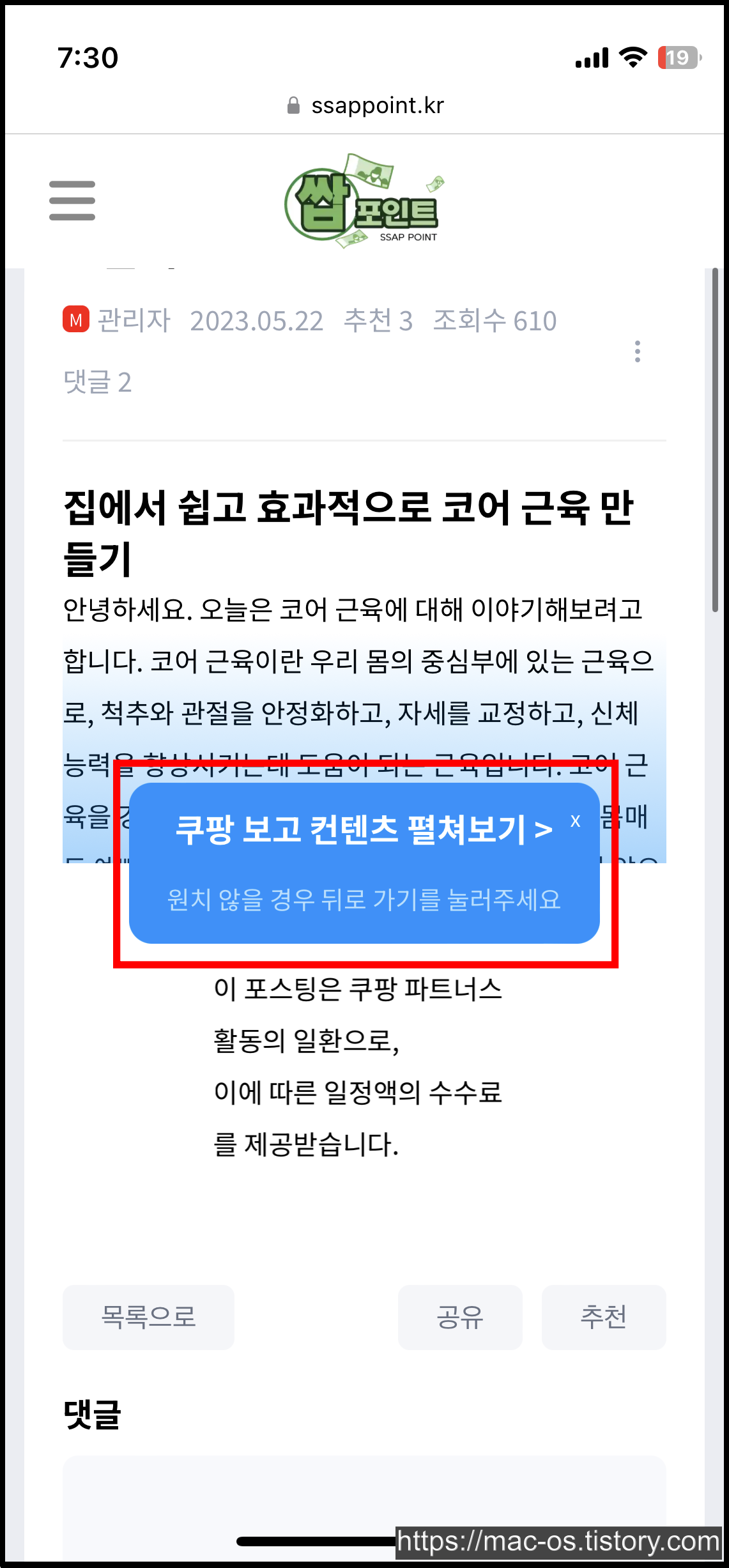 게시글을 눌러보면 쿠팡 광고가 있는데 눌러준다.